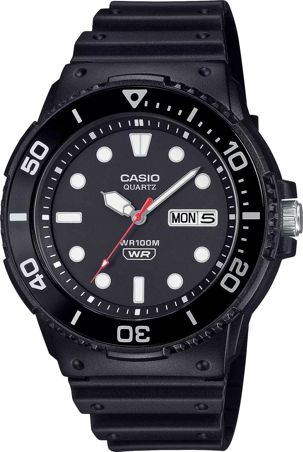 Мужские аналоговые кварцевые часы. Casio Collection. Центральные часовая, минутная и секундная стрелки. Чёрный циферблат с часовыми метками в виде штрихов и точек. Стрелки и метки с люминесцентным покрытием, которое светится в темноте после непродолжительного воздействия света. Окошко даты и дня недели в позиции 3 ч. Пластиковое стекло. Переводная головка с защитой. Круглый корпус из полимерного пластика чёрного цвета. Размеры корпуса 47,9 мм на 44,6 мм, толщина 12,3 мм. Безель с односторонним вращением. Минутная шкала на безеле. Чёрный пластиковый ремешок со стандартной застёжкой buckle. Батарея рассчитана на 3 года Водонепроницаемость 100 WR (плавание и ныряние без акваланга). Вес около 39 г.