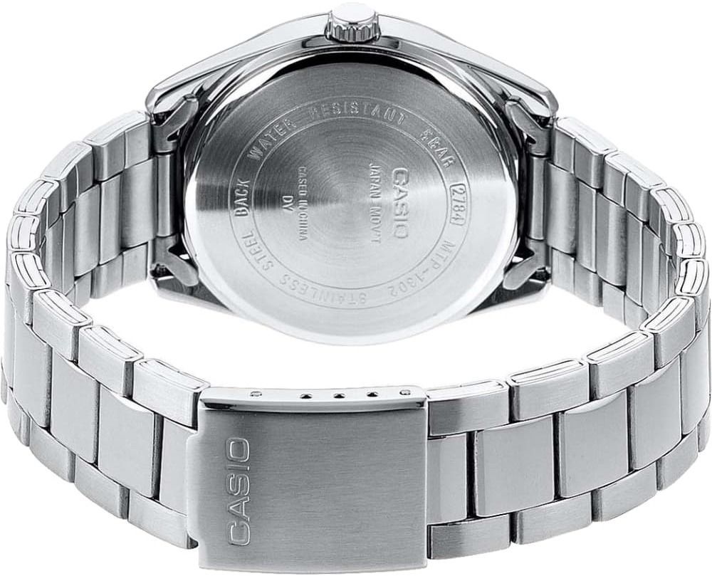 Мужские кварцевые аналоговые наручные часы. Серия Casio Collection. Центральные часовая, минутная и секундная стрелки. Голубой циферблат с часовыми метками в виде штрихов. Стрелки с люминесцентным покрытием, которое светится в темноте после непродолжительного воздействия света. Минутная шкала на циферблате. Окошко даты в положении 3 ч. Устойчивое к мелким механическим повреждениям минеральное стекло. Круглый корпус серебристого цвета размером 44,2 мм на 38,5 мм, толщиной 9,3 мм. Рифлёный безель. Стальной браслет с тройной раскладывающейся застежкой. Батарея рассчитана на 3 года. Водонепроницаемость 50WR (мытьё рук, дождь). Вес около 107 г.