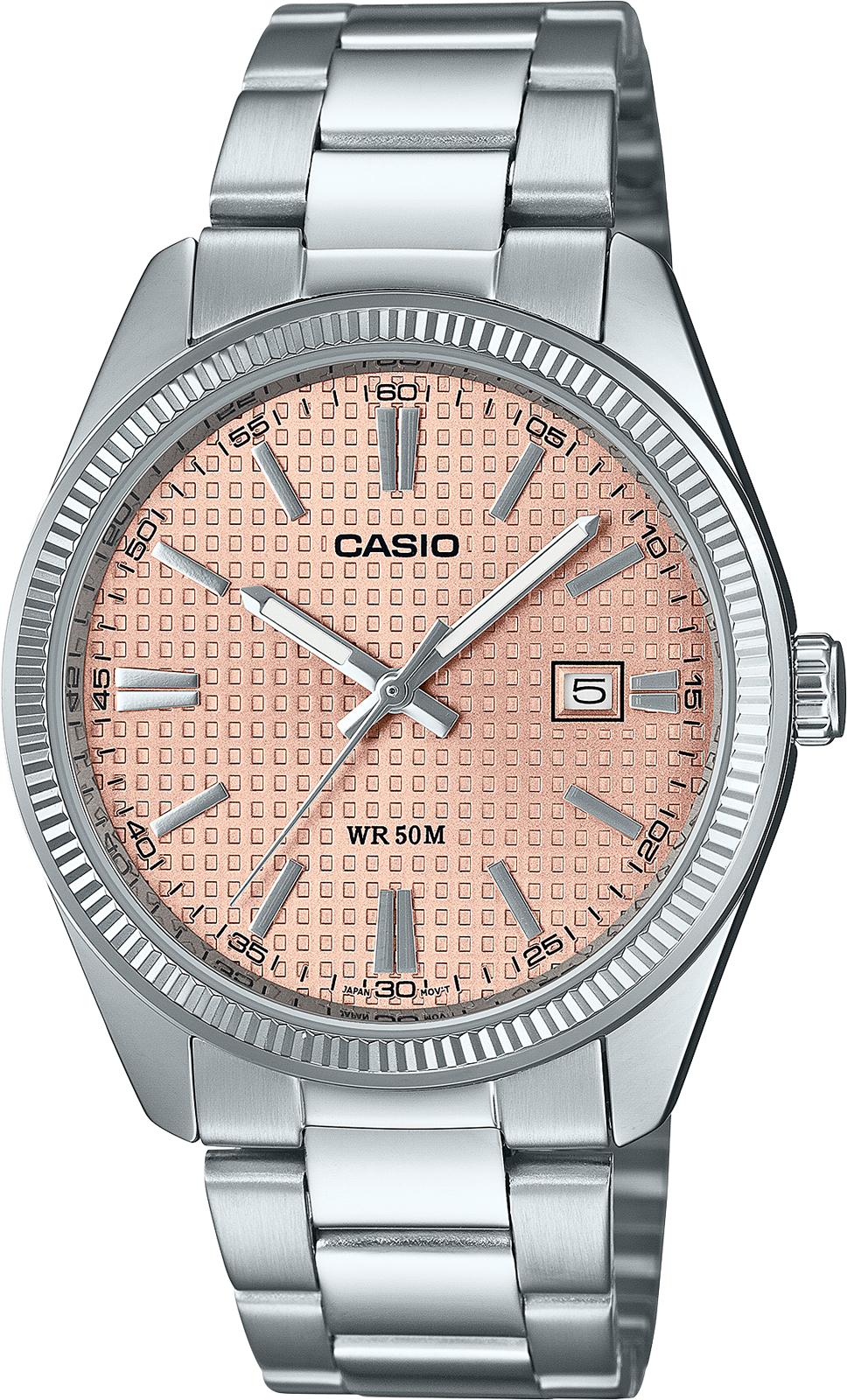 Мужские кварцевые аналоговые наручные часы. Серия Casio Collection. Центральные часовая, минутная и секундная стрелки. Розовый циферблат с часовыми метками в виде штрихов. Стрелки с люминесцентным покрытием, которое светится в темноте после непродолжительного воздействия света. Минутная шкала на циферблате. Окошко даты в положении 3 ч. Устойчивое к мелким механическим повреждениям минеральное стекло. Круглый корпус серебристого цвета размером 44,2 мм на 38,5 мм, толщиной 9,3 мм. Рифлёный безель. Стальной браслет с тройной раскладывающейся застежкой. Батарея рассчитана на 3 года. Водонепроницаемость 50WR (мытьё рук, дождь). Вес около 107 г.