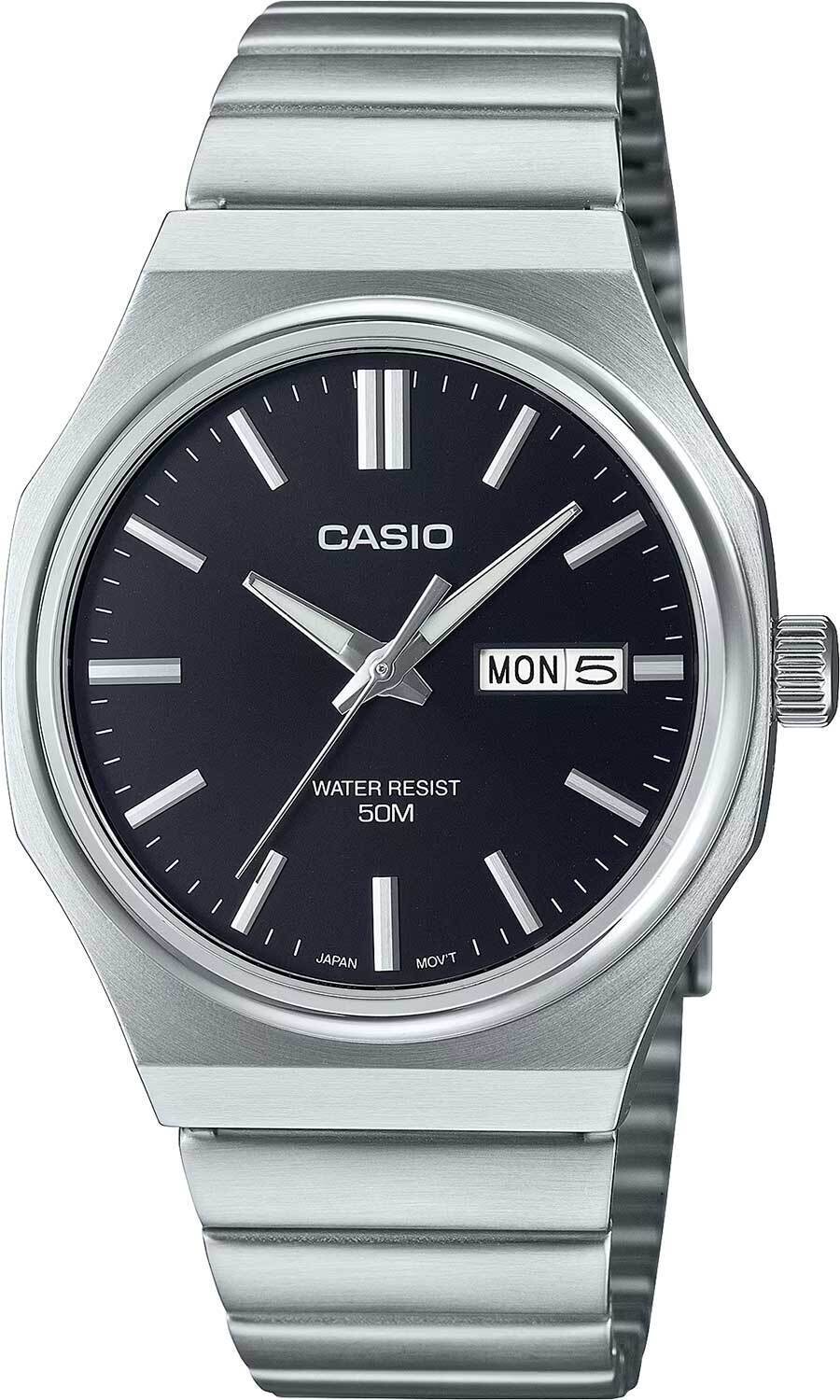 Мужские кварцевые аналоговые наручные часы. Casio Collection. Центральные часовая, минутная и секундная стрелки. Чёрный циферблат с часовыми метками в виде штрихов. Стрелки и метки с люминесцентным покрытием, которое светится в темноте после непродолжительного воздействия света. Окошко даты и дня недели в положении 3 ч. (значение даты меняется до 31, для месяцев, у которых количество дней меньше 31, необходимо корректировать значение вручную). Устойчивое к мелким механическим повреждениям минеральное стекло. Круглый стальной корпус размером 37,5 мм на 44,5мм, толщиной 8,4 мм. Стальной браслет с тройной раскладывающейся застежкой. Батарейка рассчитана на 3 года. Водонепроницаемость 50WR (мытьё рук, дождь). Вес около 110 г.