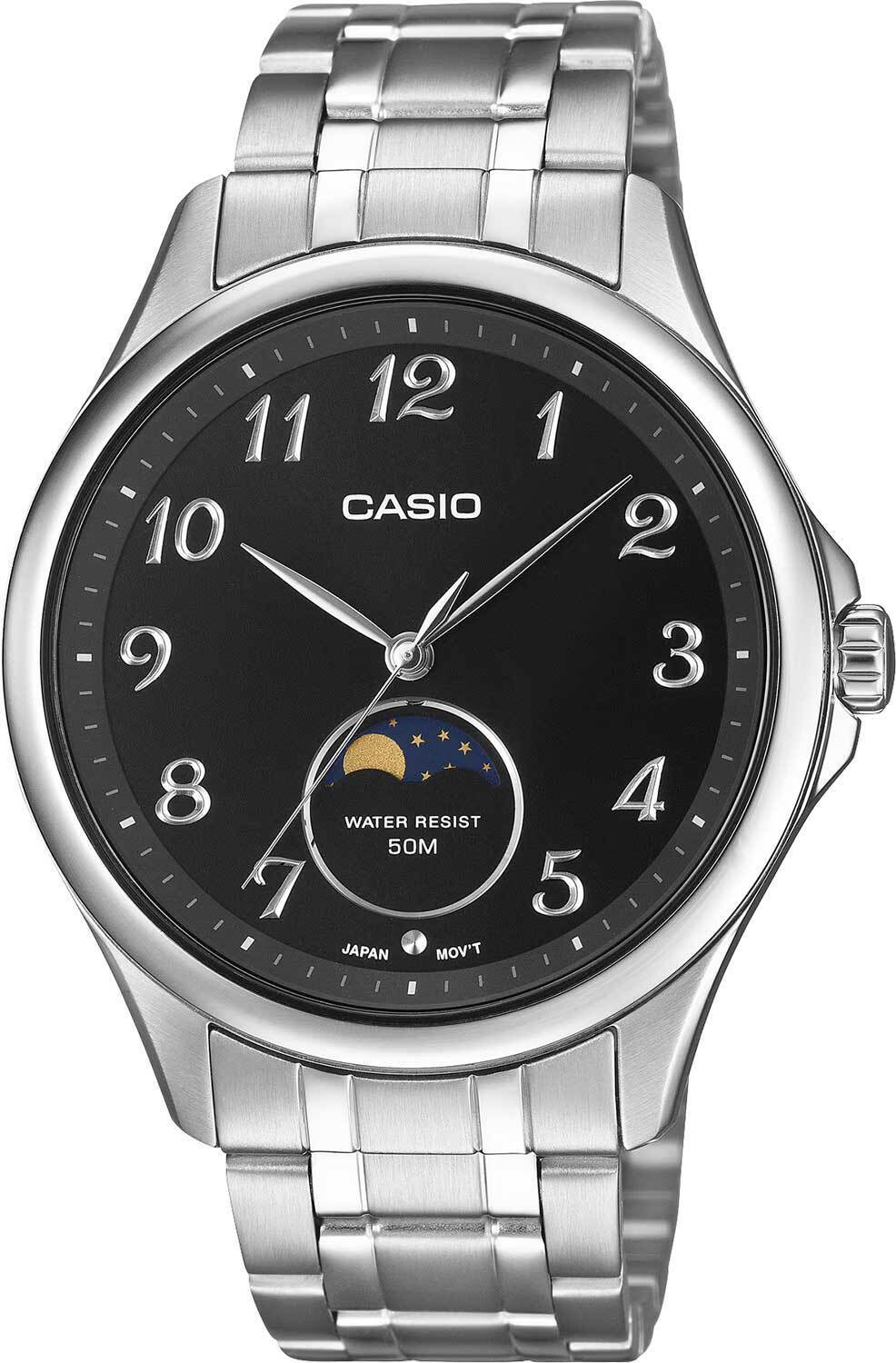 Мужские кварцевые наручные часы с аналоговым отображением времени. Серия Standard Analog Collection. Центральные часовая, минутная и секундная стрелки серебристого цвета. Чёрный циферблат с часовыми метками в виде арабских цифр. Индикатор фаз Луны (дополнительный циферблат с изображением фаз Луны и градуировкой на 29,5 суток (продолжительность лунного месяца), показывает, как выглядит Луна (светлая часть индикатора) в полдень в Северном полушарии) находится в положении 6 часов. Устойчивое к мелким механическим повреждениям минеральное стекло. Круглый стальной корпус размером 42,5 мм на 48,4мм, толщиной 9,6 мм. Переводная головка с защитой. Браслет из нержавеющей стали с тройной раскладывающейся застежкой. Задняя крышка с винтовым фиксатором. Батарея рассчитана на 3 года. Водонепроницаемость 50WR (мытьё рук, дождь). Вес около 113 г.