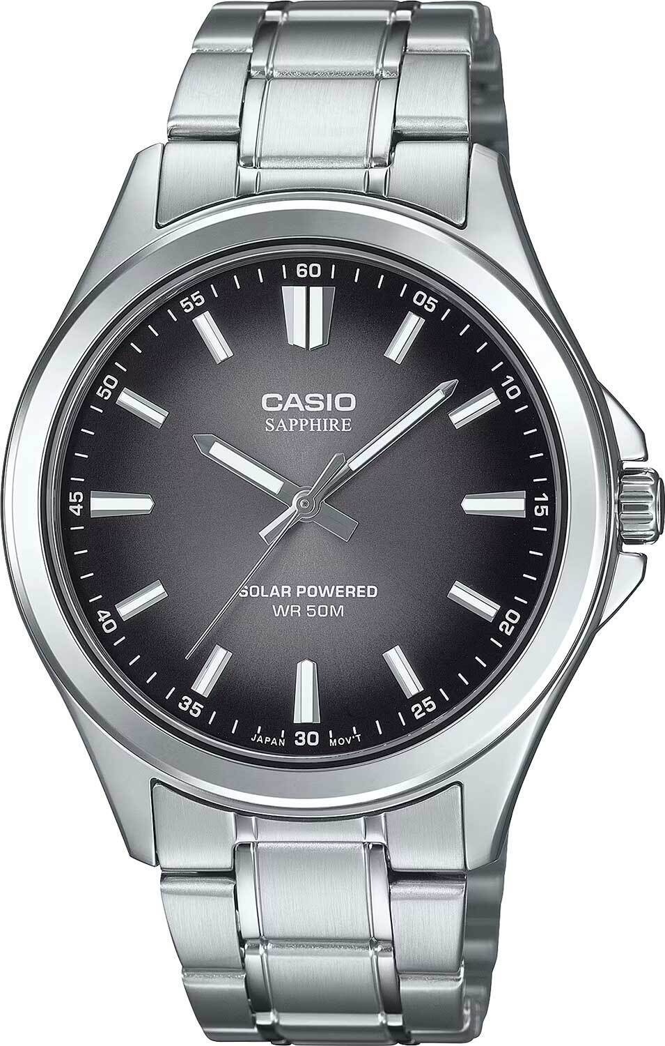 Мужские кварцевые аналоговые часы на солнечной батарее. Casio Collection. Питание от солнечной энергии - источником питания служит светочувствительная панель и аккумулятор, заряжаемый при попадании солнечного света на циферблат часов. Примерное время работы полностью заряженного аккумулятора без подзарядки 4 месяца. Центральные часовая, минутная и секундная стрелки. Чёрный циферблат с часовыми метками в виде штрихов. Стрелки и метки с люминесцентным покрытием, которое светится в темноте после непродолжительного воздействия света. Устойчивое к возникновению мелких царапин сапфировое стекло с антибликовым покрытием. Круглый стальной корпус. Размер корпуса 47 мм на 41,7 мм, толщина 9,5 мм. Переводная головка с защитой. Стальной браслет с тройной раскладывающейся застежкой. Водонепроницаемость 50 WR (мытьё рук, дождь). Вес около 106 г.