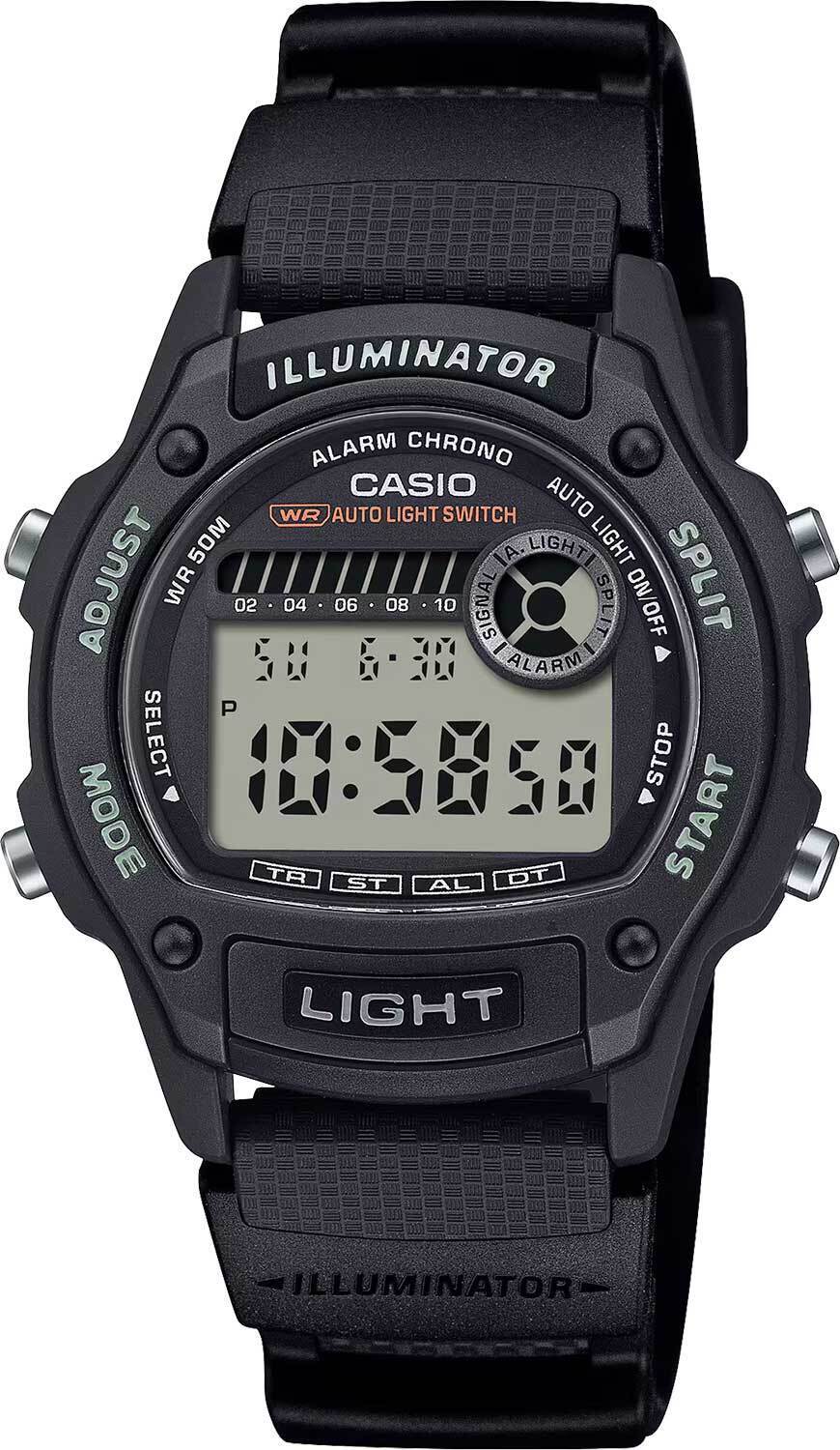 Мужские кварцевые наручные часы с цифровым отображением времени. Серия Casio Collection Standard Digital. Циферблат подсвечивается светодиодом с функцией послесвечения. Цвет подсветки оранжевый. 12-ти и 24-х часовой формат отображения времени. Секундомер с точностью показаний 1/100 с (до 1 ч) и 1 с (после 1 ч) и временем измерения 24часа. Таймер обратного отсчета от 1минуты до 24часов с автоповтором. Ежедневный будильник, ежечасный сигнал. Второй часовой пояс (отображение времени двух часовых поясов одновременно). Автоматический календарь до 2099 года. Круглый корпус из полимерного пластика чёрного цвета. Размеры корпуса 36,6мм на 43 мм, толщина 10,9 мм. Выпуклое пластиковое стекло. Чёрный ремешок из биопластика (изготавливается из возобновляемых органических ресурсов) с классической застежкой buckle. Батарейка рассчитана на 3 года. Водонепроницаемость WR50 (мытьё рук, дождь). Вес около 27 г.