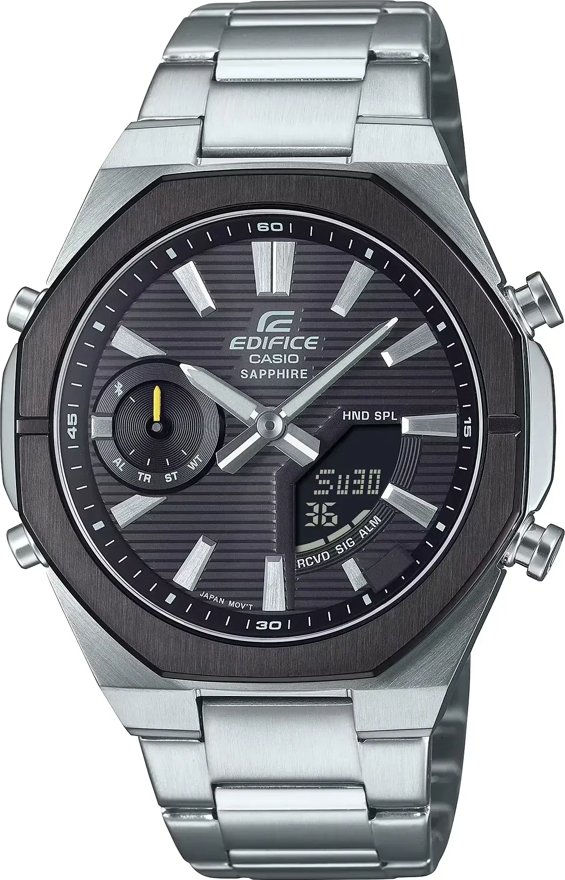 Мужские кварцевые аналого-цифровые наручные часы. Серия Edifice. Часы оснащены беспроводной технологией Bluetooth® со сверхнизким потреблением энергии для синхронизации со смартфоном. При подключении к смартфону часы автоматически корректируют текущее время и получают доступ к ряду полезных функций. Центральные часовая и минутная стрелки. Серый циферблат с часовыми метками в виде штрихов. Светонакопительное покрытие стрелок и часовых меток обеспечивает длительное послесвечение в темноте после кратковременного воздействия света. 12-ти и 24-х часовой формат отображения времени. Двойная светодиодная подсветка Super Illuminator обеспечивает подсветку не только аналогового циферблата, но и цифрового дисплея. Секундомер с точностью показаний 1/100с и временем измерения 24ч. Режимы измерения: прошедшее время, промежуточный результат, два финишных результата. Таймер обратного отсчета от 1с до 24ч. Мировое время – 38 городов (38 часовых поясов), всемирное координированное время (UTC), автоматический переход на летнее время (DST), возможность включения/отключения летнего времени. 5 ежедневных будильников, сигнал начала часа. Автоматический календарь до 2099 года, возможность выбора дня недели на шести языках. Функция перемещения стрелок для удобного просмотра информации на цифровом экране. Функция поиска телефона. Индикатор уровня заряда батареи. Круглый стальной корпус размером 43 мм на 48,1 мм, толщиной 9,6 мм. Устойчивое к возникновению мелких царапин сапфировое стекло с антибликовым покрытием. Стальной браслет с раскладывающейся застежкой. Срок службы батареи около 2 лет. Водонепроницаемость WR 100 (плавание и ныряние без акваланга). Вес около 129 г.