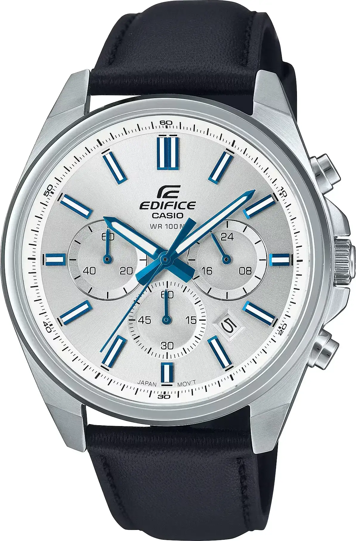 Мужские кварцевые аналоговые часы-хронограф с секундомером. Коллекция Edifice. Центральные часовая, минутная и секундная стрелки. Серебристый циферблат с часовыми метками в виде штрихов. Стрелки и метки с люминесцентным покрытием, которое светится в темноте после непродолжительного воздействия света. Окошко даты в позиции между 4 и 5 ч. Секундомер с точностью показаний 1с и временем измерения 1ч. Режимы измерения: прошедшее время, промежуточное время, два финишных результата. 12-ти и 24-х часовой формат отображения времени (дополнительный малый циферблат в позиции 3 ч.). Устойчивое к мелким механическим повреждениям минеральное стекло. Круглый корпус из нержавеющей стали. Размер корпуса 43,5 мм на 48,6 мм, толщина 11 мм. Переводная головка с защитой. Завинчивающаяся задняя крышка. Чёрный кожаный ремешок с классической застёжкой buckle. Батарейка рассчитана на 2 года. Водонепроницаемость WR100 (плавание и погружение без акваланга). Вес примерно 67 г.