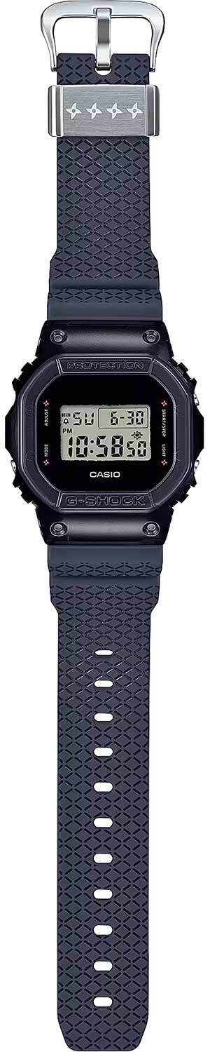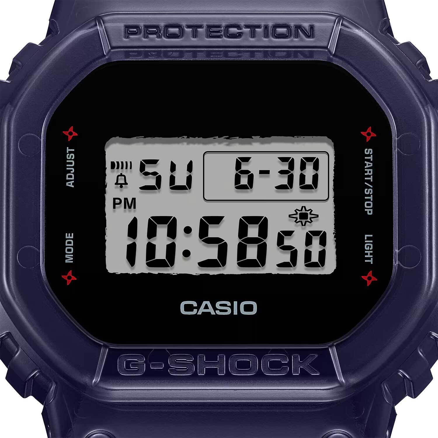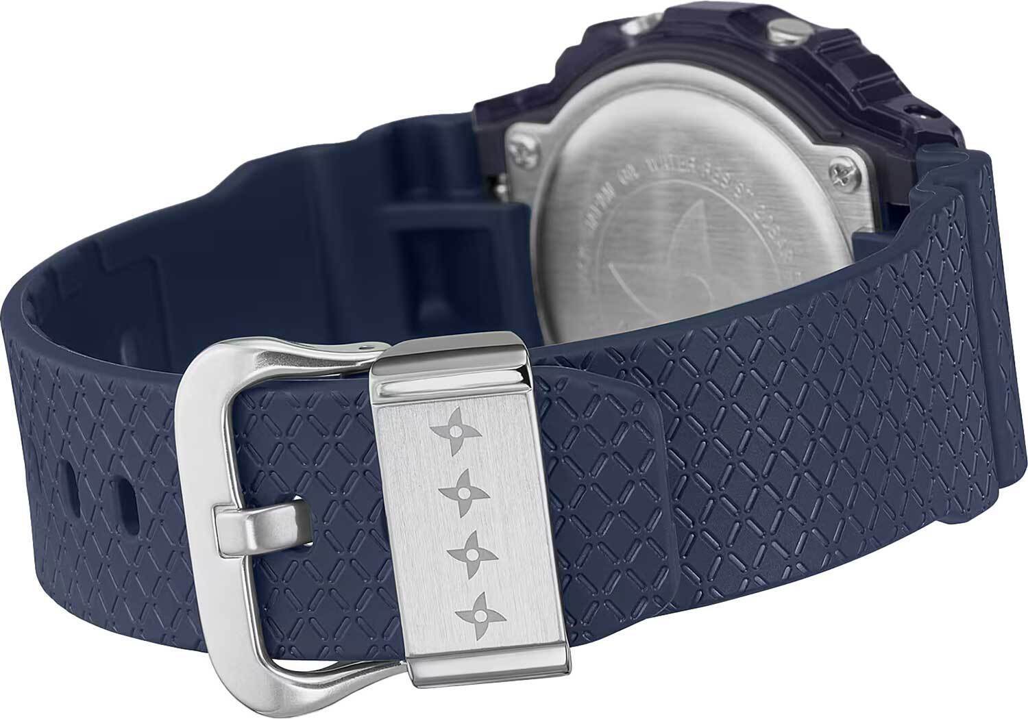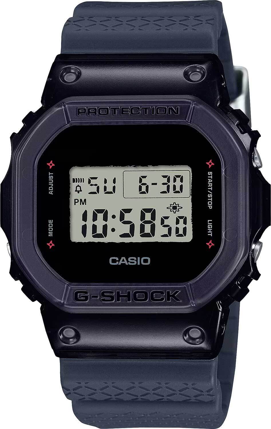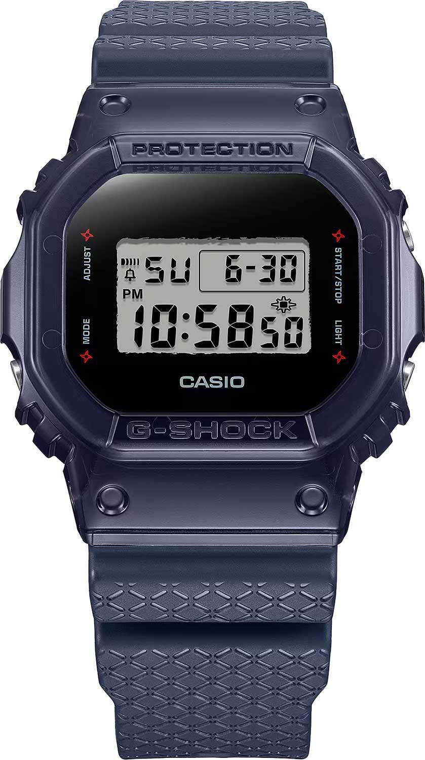 Мужские кварцевые электронные часы. Коллекция G-Shock Ninjas Special Edition. Дизайн и цветовая гамма часов отдают дань уважения загадочным японским Ниндзя. Внешний вид модели - светлый дисплей с нарочито неровными краями на фоне темного корпуса выглядит словно силуэт Ниндзя в темной балаклаве. У надписей режимов вокруг дисплея, на задней крышке часов, петле ремешка и при активации подсветки расположены силуэты Сюрикена (сюрикен -металлическая звездочка — метательное оружие ниндзей, символ смелости, хладнокровия и выносливости). Полупрозрачный синий ремешок часов украшен решетчатым узором горячего тиснения, напоминает образ традиционных кольчуг и символизирует мастерство Ниндзя в Суитон но дзюцу (Suiton no jutsu) - искусстве скрываться в водоемах, используя кусок бамбука в качестве трубки для дыхания. Противоударный корпус защищает механизм часов от ударов и вибрации. Циферблат подсвечивается светодиодом с функцией послесвечения. При активации подсветки на дисплее появляется изображение Сюрикена. Световая индикация сигнала (LED-индикатор) - светодиодная лампочка мигает при сигнале будильника, окончании таймера обратного отсчета или секундомера. Секундомер с точностью показаний 1/100 секунды (первый час), 1 секунда (через 1 час) и временем измерения 24 часа. Режимы измерения: прошедшее время, промежуточное время, два финишных результата. Таймер обратного отсчета от 1 секунды до 24 часов с автоповтором. 12-ти и 24-х- часовой формат отображения времени. Многофункциональный будильник, ежедневный звуковой сигнал, индикация начала часа. Автоматический календарь до 2099 г. Прямоугольный корпус из полимерного пластика синего цвета. Размер корпуса 42,8 мм на 48,9 мм, толщина 13,4 мм. Синий пластиковый ремешок украшен узором, напоминающего кольчугу, классическая застежка. Минеральное стекло устойчивое к мелким механическим повреждениям. Стальная задняя крышка украшена выгравированным изображением Сюрикена. Батарейка рассчитана на 5 лет. Водостойкость WR 200 (плавание и ныряние без акваланга). Вес примерно 62 г.