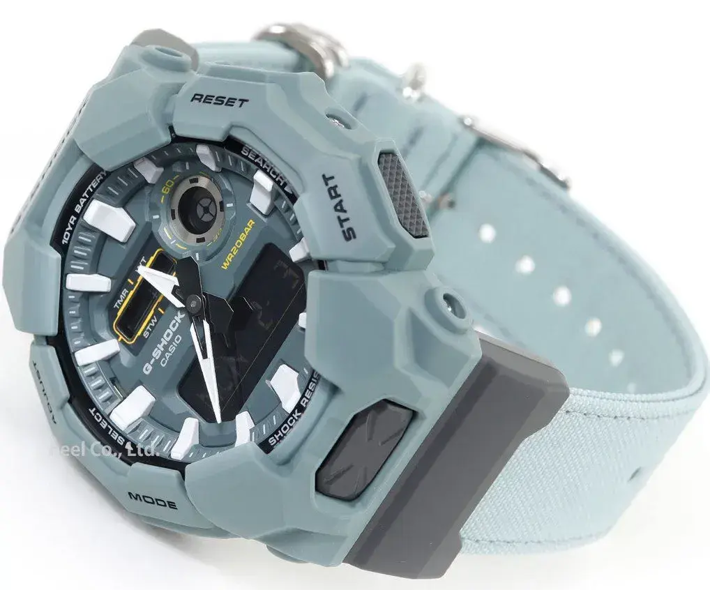 Мужские кварцевые аналого-цифровые наручные часы. Серия G-Shock. Противоударный корпус из биопластика (изготавливается из возобновляемых органических ресурсов) с углеродными волокнами (структура Carbon Core Guard) более прочный и в то же время более легкий, защищает механизм часов от ударов и вибраций. Циферблат подсвечивается светодиодом. Настройка продолжительности подсветки 1,5 или 3 секунды, послесвечение. Светящееся покрытие стрелок обеспечивает длительное послесвечение в темноте после короткого воздействия света. 12-ти и 24-х часовой формат отображения времени. Секундомер с точностью показаний 1/100 с и временем измерения 24 часа. Режимы измерения: прошедшее время, промежуточное время, два финишных результата. Таймер обратного отсчета от от 1 мин до 1 ч. Мировое время - 31 часовой пояс (48 городов), всемирное координированное время (UTC), включение/отключение летнего времени. 5 ежедневных будильников ( один с функцией повтора сигнала ), ежечасный сигнал. Функция перемещения стрелок для удобного просмотра информации на цифровом экране. Функция отключения/включения звука кнопок. Автоматический календарь до 2099 года. Усиленный углеродными волокнами пластиковый корпус зелёного цвета. Размер корпуса 51,9 мм на 55,1мм, толщина 17,5мм. Устойчивое к мелким механическим повреждениям минеральное стекло. Зелёный тканевый ремешок Cordura с классической застежкой buckle. Ткань Кордура (CORDURA®) - плотная нейлоновая ткань производства компании INVISTA, отличается повышенной прочностью на разрыв, устойчивостью к истиранию и долговечностью. Окрашен ремешок натуральным красителем от Food Textile — проекта по переработке пищевых отходов для создания природных красителей для тканей. Батарея рассчитана на 10 лет. Водонепроницаемость 200WR (плавание и ныряние без акваланга). Вес около 75 г.