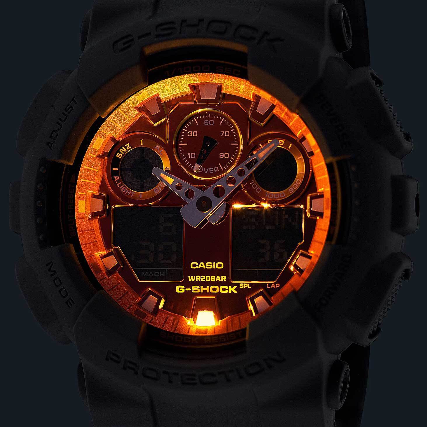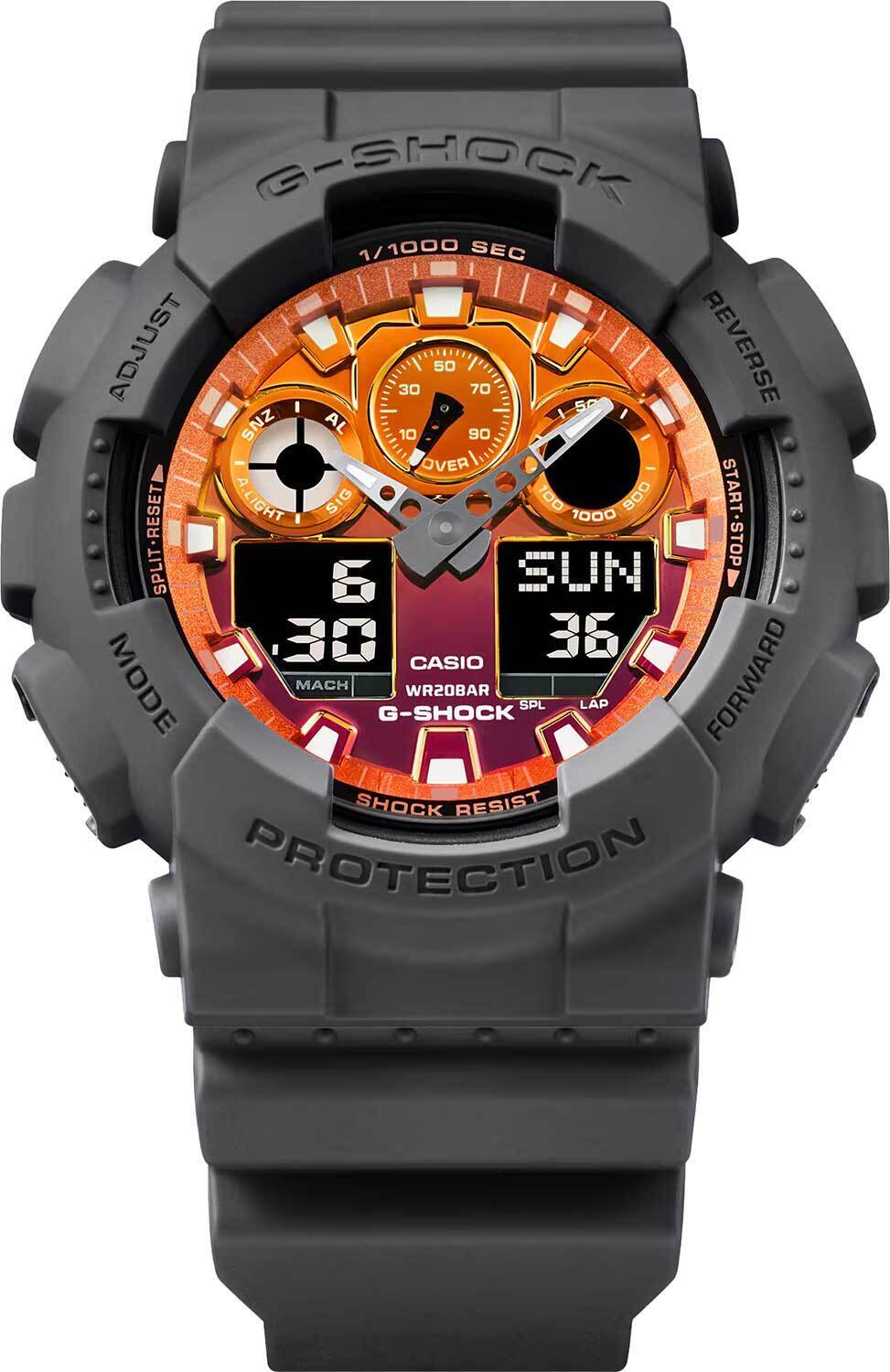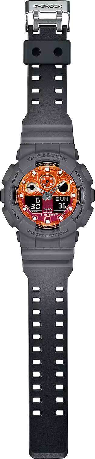Мужские кварцевые наручные часы c аналого-цифровым отображением времени. Серия G-Shock Flame Inside. Дизайн циферблата вдохновлен красно-оранжевым пламенем, а черно-серый ремешок вдохновлен дымом, исходящим от огня. Противоударный корпус защищает механизм часов от ударов и вибрации. Часы созданы с защитой от воздействия магнитных полей. Автоматическая светодиодная подсветка — при недостаточном освещении поворот руки включает подсветку циферблата, выбор продолжительности подсветки 1,5 или 3 секунды, послесвечение. Мировое время – 48 городов (29 часовых поясов), всемирное координированное время (UTC). Автоматический переход на зимнее и летнее время, возможность включения/отключения данной функции. 12-ти и 24-х часовой формат отображения времени. Секундомер с точностью показаний 1/1000 с и временем измерения 100 ч. Режимы измерения: пройденное время, время круга, промежуточное время. Расчет скорости по выбранной дистанции. Таймер обратного отсчета от 1 мин до 24 ч (с интервалом в 1 минуту и с интервалом в 1 час) с автоповтором. 5 ежедневных будильников, один с функцией повтора сигнала Snooze, ежечасный сигнал. Автоматический календарь до 2099 года. Круглый корпус из полимерного пластика серого цвета. Габаритные размеры корпуса 51,2 мм на 55мм, толщина 16,9мм. Устойчивое к мелким механическим повреждениям минеральное стекло. Оранжевый циферблат с часовыми метками в виде штрихов. Центральные часовая и минутная стрелки. Стрелки и метки с люминесцентным покрытием, которое светится в темноте после непродолжительного воздействия света. Серый пластиковый ремешок с классической застежкой buckle. Приблизительный срок службы батареи 2 года. Водонепроницаемость 200WR (плавание и ныряние без акваланга). Вес около 72 г.