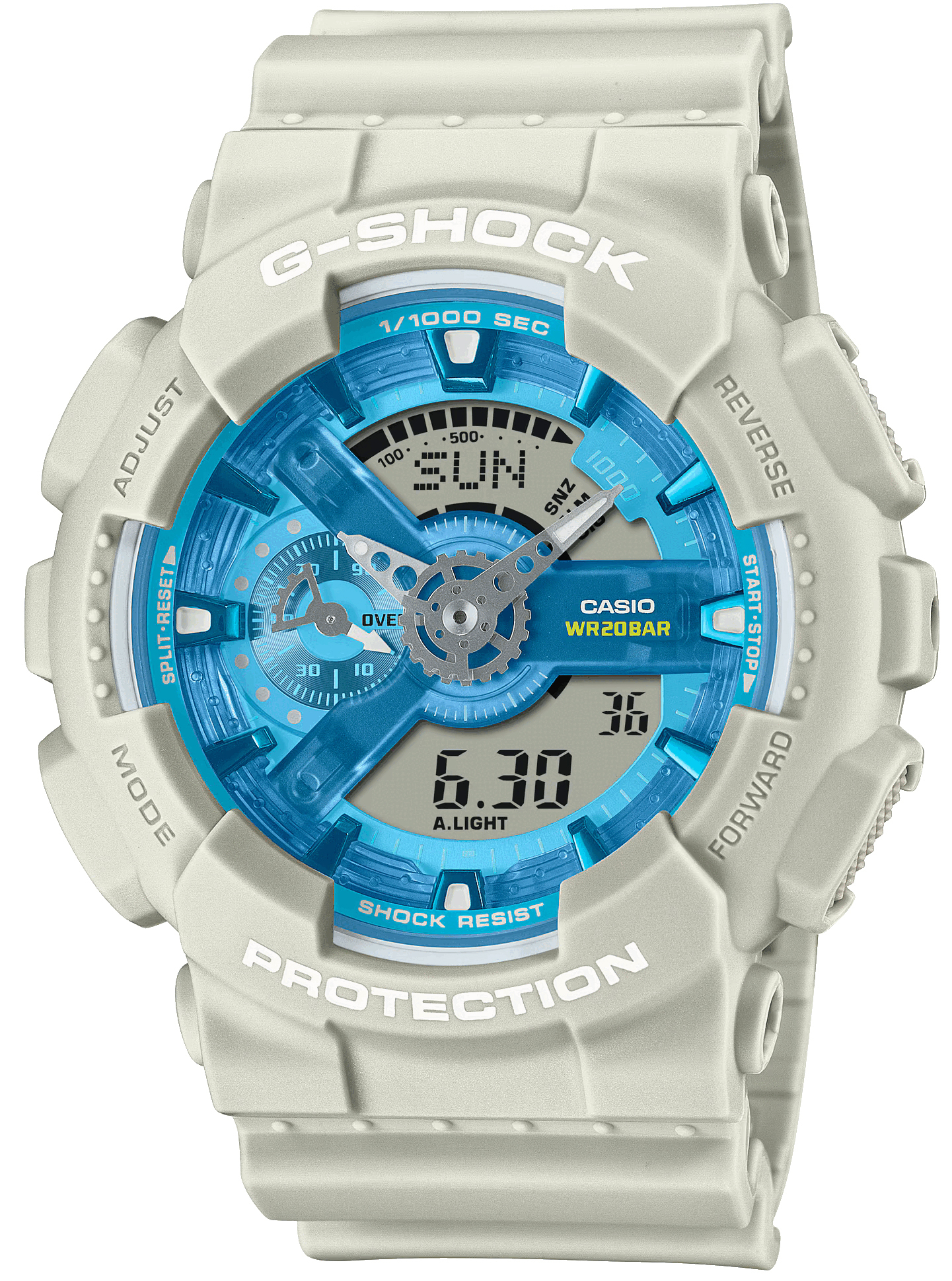 Мужские кварцевые наручные часы c аналого-цифровым отображением времени. Серия Casio G-Shock. Цветовое решение часов вдохновлено сверкающими голубыми водами океана под знойным летним солнцем. Противоударный корпус защищает механизм часов от ударов и вибрации. Часы созданы с защитой от воздействия магнитных полей. Автоматическая светодиодная подсветка — при недостаточном освещении поворот руки включает подсветку циферблата, выбор продолжительности подсветки 1,5 или 3 секунды, послесвечение. Светонакопительное покрытие стрелок обеспечивает длительное послесвечение в темноте даже после кратковременного воздействия света. Мировое время – 48 городов (29 часовых поясов), всемирное координированное время (UTC). Автоматический переход на зимнее и летнее время, возможность включения/отключения данной функции. 12-ти и 24-х часовой формат отображения времени. Секундомер с точностью показаний 1/1000 с и временем измерения 100 ч. Режимы измерения: пройденное время, время круга, промежуточное время. Расчет скорости по выбранной дистанции. Таймер обратного отсчета от 1 мин до 24 ч (с шагом в 1 минуту и с шагом в 1 час) с автоповтором. 5 ежедневных будильников, один с функцией повтора сигнала (Snooze), ежечасный сигнал. Автоматический календарь до 2099 года. Круглый корпус из биопластика (изготавливается из возобновляемых органических ресурсов) бежевого цвета. Устойчивое к мелким механическим повреждениям минеральное стекло. Бежевый ремешок из биопластика (изготавливается из возобновляемых органических ресурсов) с классической застежкой Buckle. Приблизительный срок службы батареи 2 года. Водонепроницаемость 200 WR (плавание и ныряние без акваланга). Вес около 72 г.