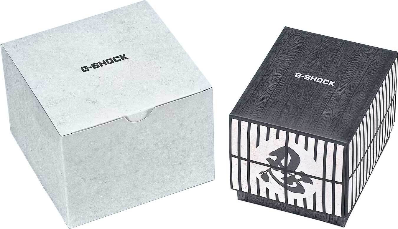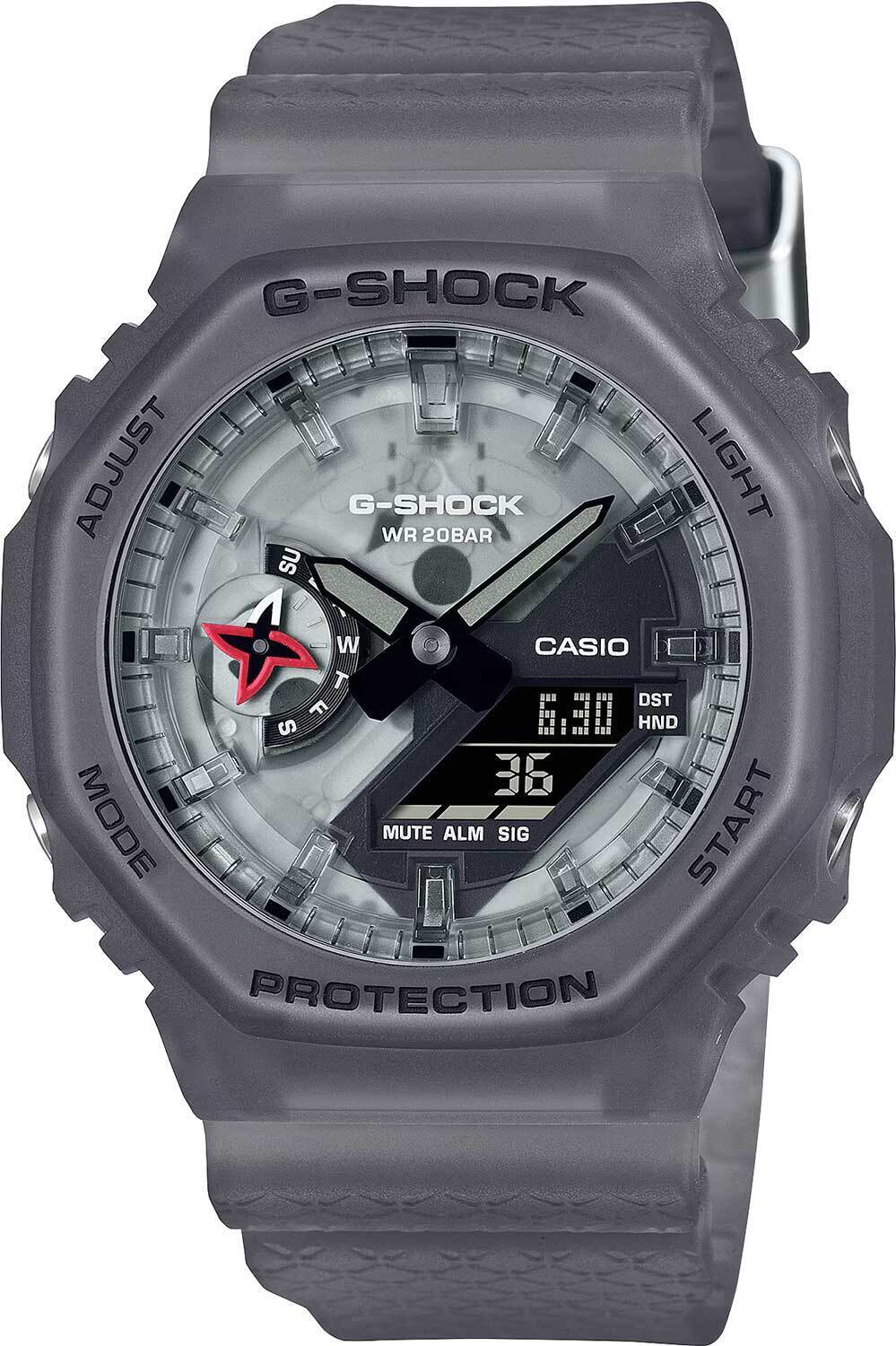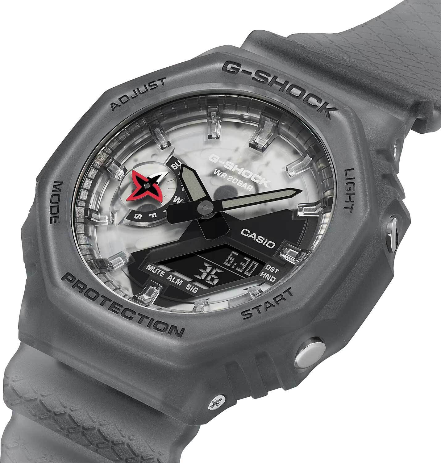 Мужские кварцевые аналого-цифровые наручные часы. Серия G-Shock Ninjas Special Edition. Дизайн и цветовая гамма часов отдают дань уважения загадочным японским Ниндзя. Серый полупрозрачный корпус часов вызывает ассоциации с дымом искусства Katon no Jutsu - искусства, с помощью которого ниндзя скрывались от своих врагов, используя огонь и дымовую завесу для отвлечения внимания противника. Противоударный пластиковый корпус с углеродными волокнами (структура Core Guard) более прочный и в то же время более легкий, защищает механизм часов от ударов и вибраций. Двойная светодиодная подсветка обеспечивает подсветку не только цифрового дисплея, но и аналогового циферблата. Настройка продолжительности подсветки 1,5 или 3 секунды, послесвечение. Светящееся покрытие стрелок обеспечивает длительное послесвечение в темное даже после короткого воздействия света. 12-ти и 24-х часовой формат отображения времени. Секундомер с точностью показаний 1/100 с (первый час) и 1 с (после первого часа) и временем измерения 24 часа. Режимы измерения: прошедшее время, промежуточное время, два финишных результата. Таймер обратного отсчета от 1 секунды до 24 часов с автоповтором. Мировое время - 31 часовой пояс (48 городов), всемирное координированное время (UTC), включение/отключение летнего времени. 5 ежедневных будильников, ежечасный сигнал. Функция перемещения стрелок для удобного просмотра информации на цифровом экране. Функция отключения/включения звука кнопок. Автоматический календарь до 2099 года. Стрелка ретроградного указателя дня недели выполнена в форме сюрикена (сюрикен- металлическая звездочка — метательное оружие ниндзей, символ смелости, хладнокровия и выносливости). Усиленный углеродными волокнами пластиковый восьмиугольный корпус. Размеры корпуса 48,4 мм х 45,4 мм, толщина 11,8 мм. Устойчивое к мелким механическим повреждениям минеральное стекло. Полупрозрачный серый ремешок часов, украшен решетчатым узором горячего тиснения, напоминает образ традиционных кольчуг ниндзя. Металлическая петля ремешка и стальная задняя крышка украшены выгравированным изображением сюрикена. Ремешок с классической застежкой buckle. Водонепроницаемость 200WR (плавание и ныряние без акваланга). Примерный срок службы батареи 3 года. Вес около 56 г.