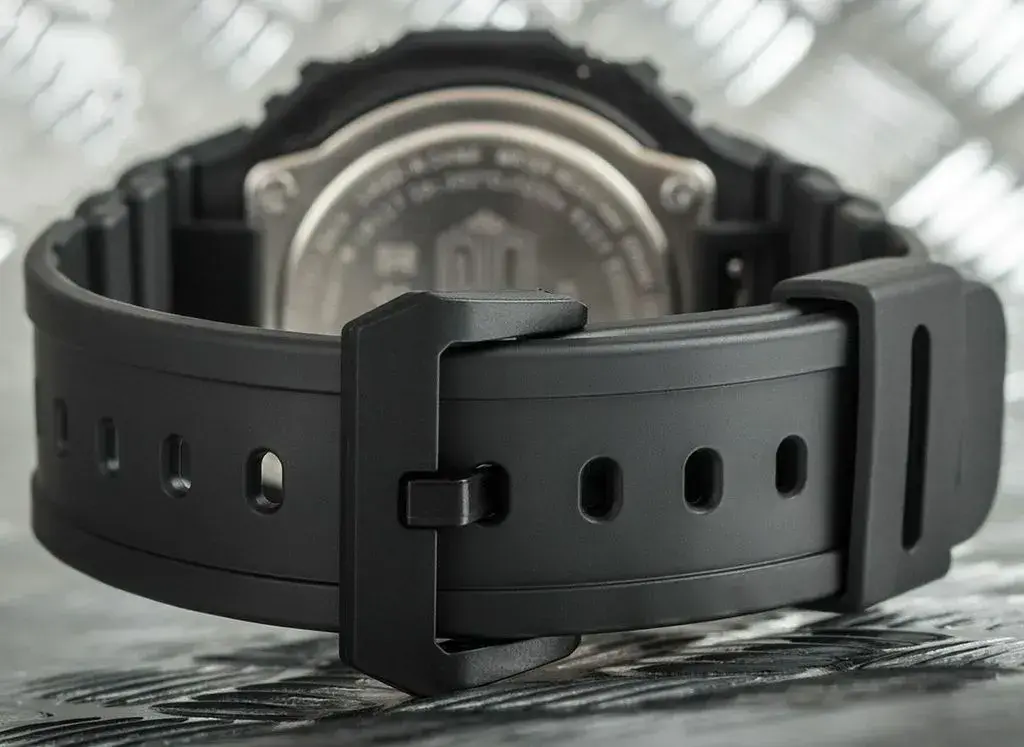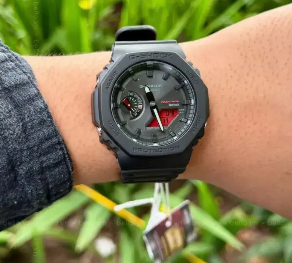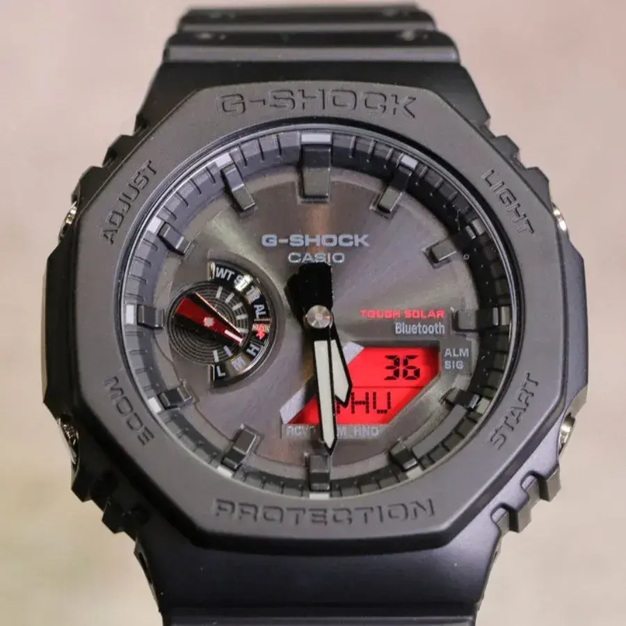 Мужские кварцевые аналого-цифровые часы на солнечной батарее. Серия G-Shock Black and Red Collection. Стильная модель в корпусе черного цвета с дисплеем красного оттенка. Насыщенный красный цвет ЖК дисплея эффектно контрастирует с черным корпусом, ремешком и циферблатом. Противоударный пластиковый корпус с углеродными волокнами (структура Carbon Core Guard) защищает внутренний модуль часов от повреждений и деформаций при ударах и вибрации. Питание от солнечной энергии (технология Tough Solar) — источником питания служит светочувствительная панель и аккумулятор, заряжаемый при попадании солнечных лучей на циферблат часов. Индикатор уровня заряда батареи. Функция автоматического сохранения энергии. Время работы аккумулятора без подзарядки около 7 месяцев, при включенной функции сохранения энергии около 18 месяцев. Часы оснащены беспроводной технологией Bluetooth® со сверхнизким потреблением энергии для синхронизации со смартфоном. При подключении к смартфону часы автоматически корректируют текущее время, в том числе переход на зимнее/летнее время, копируют настройки мирового времени более чем для 300 городов и получают доступ к ряду полезных функций. Двойная светодиодная подсветка (циферблата и ЖК-дисплея) с функцией послесвечения, настройка продолжительности подсветки 1,5 или 3 с. Секундомер с точностью измерения 1/100 секунды (в течение первого часа), 1 секунда (через 1 час) и временем измерения 24ч. Режимы измерения: прошедшее время, время прохождения части и круга дистанции. Таймер обратного отсчета от 1 секунды до 60 минут. Сигнал оповещения об окончании обратного отсчета звучит в течение 10 секунд. 5 ежедневных будильников, ежечасный сигнал. Мировое время - 38 городов (38 часовых поясов), всемирное координированное время (UTC), автоматический переход на зимнее и летнее время, возможность включения/отключения данной функции, переключение между домашним и мировым временем. 12-ти и 24-х часовой формат отображения времени. Автоматический календарь до 2099 г, отображение дней недели на шести языках. Включение/выключение звука кнопок. Функция перемещения стрелок для удобного просмотра информации на цифровом экране. Функция поиска телефона. Усиленный углеродными волокнами корпус корпус из биопластика (изготавливается из возобновляемых органических ресурсов) чёрного цвета. Размер корпуса 48,5 мм на 45,4 мм, толщина 11,9 мм. Центральные часовая и минутная стрелки. Чёрный циферблат с часовыми метками в виде штрихов. ЖК дисплей красного оттенка. Стрелки и метки с люминесцентным покрытием, которое светится в темноте после непродолжительного воздействия света. Минеральное стекло устойчивое к мелким механическим повреждениям. Ремешок из биопластика (изготавливается из возобновляемых органических ресурсов) чёрного цвета, стандартная застёжка Buckle. Водонепроницаемость 200WR (плавание и погружение без акваланга). Вес около 52 г.