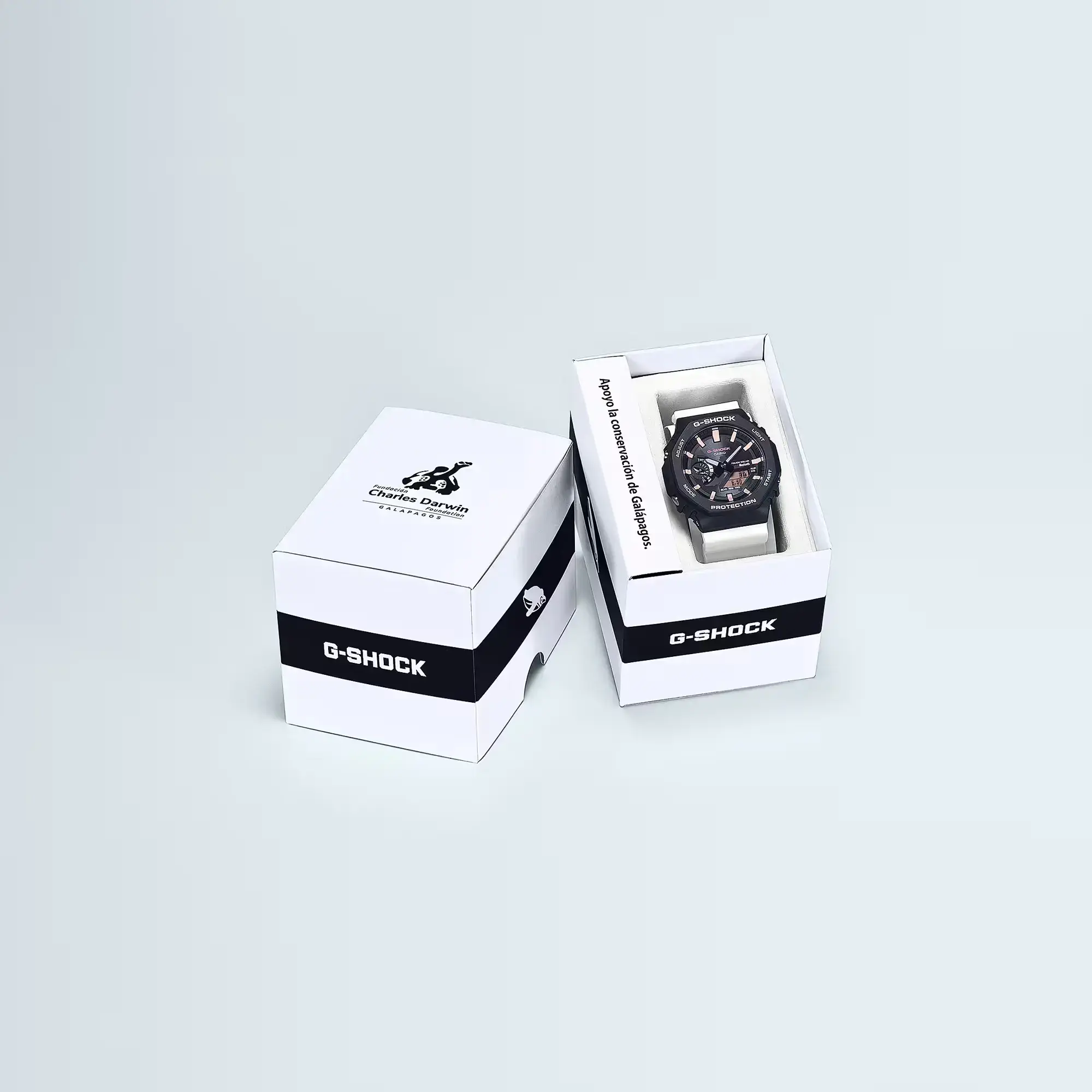 Мужские кварцевые аналого-цифровые часы на солнечной батарее. Серия G-Shock limited. Лимитированная модель (выпущена ограниченным тиражом), разработанная в сотрудничестве Casio с Фондом имени Чарльза Дарвина, организацией, которая занимается охраной окружающей среды на Галапагосских островах. Именно там в 1835 году Чарльзу Дарвину пришла идея о его теории эволюции. Данная модель часов посвящена Галапагосскому пингвину. Бело-чёрная гамма часов соответствует окраске галапагосского пингвина — уникальному виду пингвинов, обитающему на экваторе с годовой температурой +18—28°С. Противоударный пластиковый корпус с углеродными волокнами (структура Carbon Core Guard) защищает внутренний модуль часов от повреждений и деформаций при ударах и вибрации. Питание от солнечной энергии Tough Solar — источником питания служит светочувствительная панель и аккумулятор, который заряжается при попадании солнечных лучей на циферблат часов. Запас хода при полном заряде аккумулятора до 7 месяцев. Часы оснащены беспроводной технологией Bluetooth® со сверхнизким потреблением энергии для синхронизации со смартфоном. При подключении к смартфону часы автоматически корректируют текущее время и получают доступ к ряду полезных функций. Двойная светодиодная подсветка, послесвечение, настройка продолжительности подсветки 1,5 или 3 с. Секундомер с точностью измерения 1/100 секунды (в течение первого часа), 1 секунда (через 1 час) и временем измерения 24ч. Режимы измерения: прошедшее время, время прохождения части и круга дистанции. Таймер обратного отсчета от 1 секунды до 60 минут с интервалом в 1 секунду. 5 ежедневных будильников, ежечасный сигнал. Мировое время - 38 городов (38 часовых поясов), всемирное координированное время (UTC). Функция включения/отключения летнего времени. Переключение между домашним и мировым временем. 12-ти и 24-х часовой формат отображения времени. Автоматический календарь до 2099 г. Отображение дней недели на шести языках. Включение/выключение звука кнопок. Функция перемещения стрелок для удобного просмотра информации на цифровом дисплее. Индикатор заряда батареи. Стрелка индикатора режима часов у метки девяти часов выполнена в виде силуэта ныряющего пингвина. Функция сохранения энергии. Функция поиска телефона. Усиленный углеродными волокнами корпус из биопластика (изготавливается из возобновляемых органических ресурсов ) чёрного цвета. Размеры корпуса 48,5 мм на 45,4 мм, толщина 11,9 мм. Центральные часовая и минутная стрелки. Чёрный циферблат с часовыми метками в виде штрихов. Стрелки и метки с люминесцентным покрытием, которое светится в темноте после непродолжительного воздействия света. Минеральное стекло устойчивое к мелким механическим повреждениям. Белый ремешок из биопластика (изготавливается из возобновляемых органических ресурсов ) с классической застёжкой Buckle. На ремешке напечатана фраза «Apoyo la conservación de Galápagos» (по-испански «Я поддерживаю сохранение Галапагосских островов»). На петле ремешка нарисован силуэт ныряющего пингвина. На задней крышке выгравирован логотип Фонда Чарльза Дарвина (галапагосская слоновая черепаха). Водонепроницаемость 200WR (плавание и погружение без акваланга). Вес около 52 г. Часы поставляются в специальной экологичной упаковке без применения пластика, чтобы сохранить естественную среду обитания пингвинов.