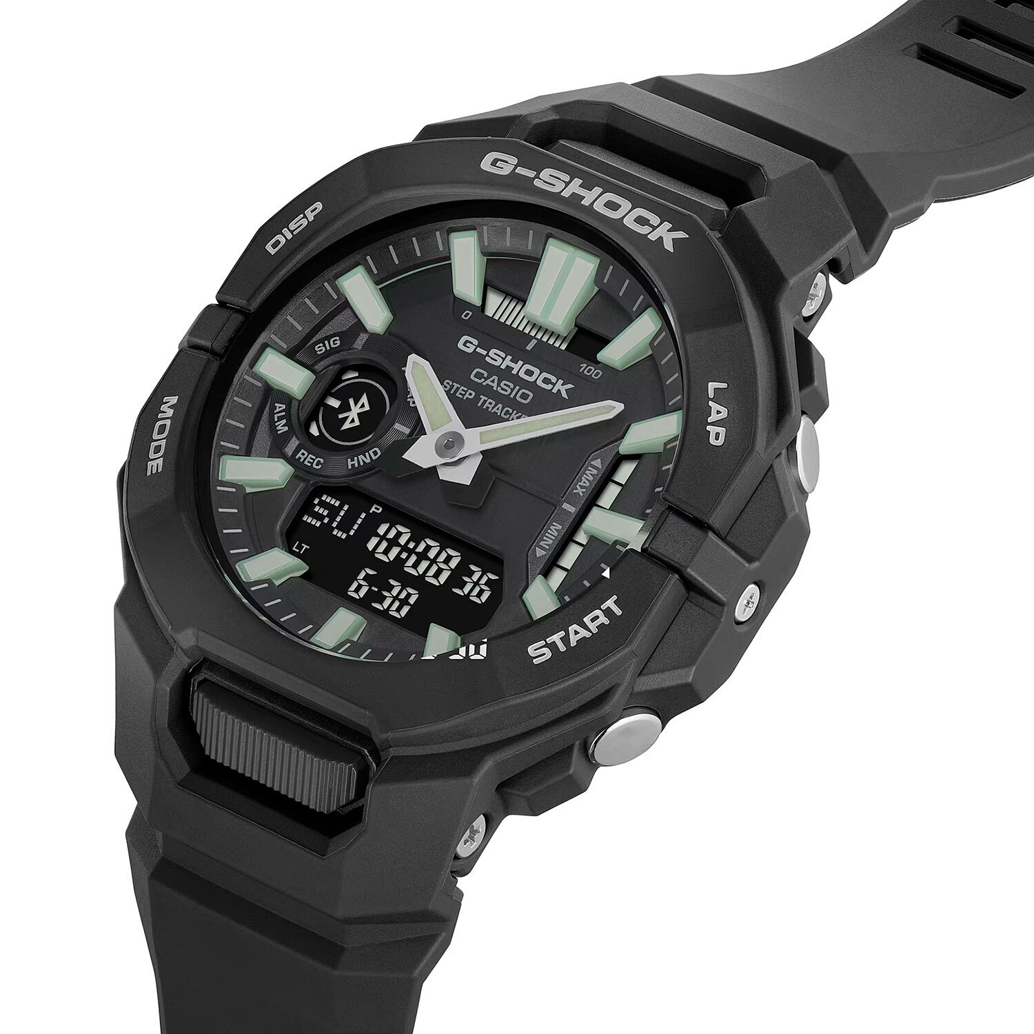 Мужские кварцевые аналого-цифровые наручные часы. Серия Casio G-Shock G-Squad. Спортивные часы для бегунов и любителей активного образа жизни. Цельная бесшовная конструкция безеля и ремешка обеспечивает плотную и удобную посадку часов на запястье. Противоударный корпус защищает механизм часов от ударов и вибрации. Двойная светодиодная подсветка (циферблата и ЖК-дисплея) с настраиваемой функцией послесвечения 1,5 или 3 секунды. 12-ти и 24-х часовой формат отображения времени. Секундомер с точностью показаний 1/100 секунды и временем измерения 24 ч. Режимы измерения: прошедшее время, время прохождения круга и части дистанции, память на 45 записей с данными о времени, дистанции, среднем темпе и сожженных калориях. Таймер обратного отсчёта от от 1 секунды до 24 часов с автоповтором, возможность установки до 5 таймеров. Количество повторений таймера от 1 до 20. Шагомер (в верхней части циферблата размещена шкала трекера шагов) автоматически начинает отсчет шагов при начинал движения. Точное количество шагов отображается на дисплее, а шкала у отметки 12 часов показывает прогресс достижения цели в процентах. Одновременное отображение текущего времени в двух разных часовых поясах. Мировое время – 300 городов. 5 ежедневных будильников, ежечасный сигнал. Часы оснащены беспроводной технологией Bluetooth® со сверхнизким потреблением энергии для синхронизации со смартфоном. При подключении к смартфону часы автоматически корректируют текущее время и получают доступ к ряду функций. Функция перемещения стрелок для удобного просмотра информации на цифровом экране. Функция отключения/включения звука кнопок. Функция поиска телефона. Предупреждение о низком уровне заряда аккумуляторной батареи. Автоматический календарь до 2099 года. Круглый корпус из биопластика (изготавливается из возобновляемых органических ресурсов) чёрного цвета. Размеры корпуса 48,5 мм на 43,9мм, толщина 16мм. Чёрный циферблат с часовыми метками в виде штрихов. Центральные часовая и минутная стрелки. Стрелки и метки с люминесцентным покрытием, которое светится в темноте после непродолжительного воздействия света. Устойчивое к мелким механическим повреждениям минеральное стекло. Ремешок чёрного цвета из биопластика (изготавливается из возобновляемых органических ресурсов) с классической застёжкой buckle. Батарея рассчитана на 2 года. Водонепроницаемость 200WR (плавание и погружение без акваланга). Вес около 53 г.