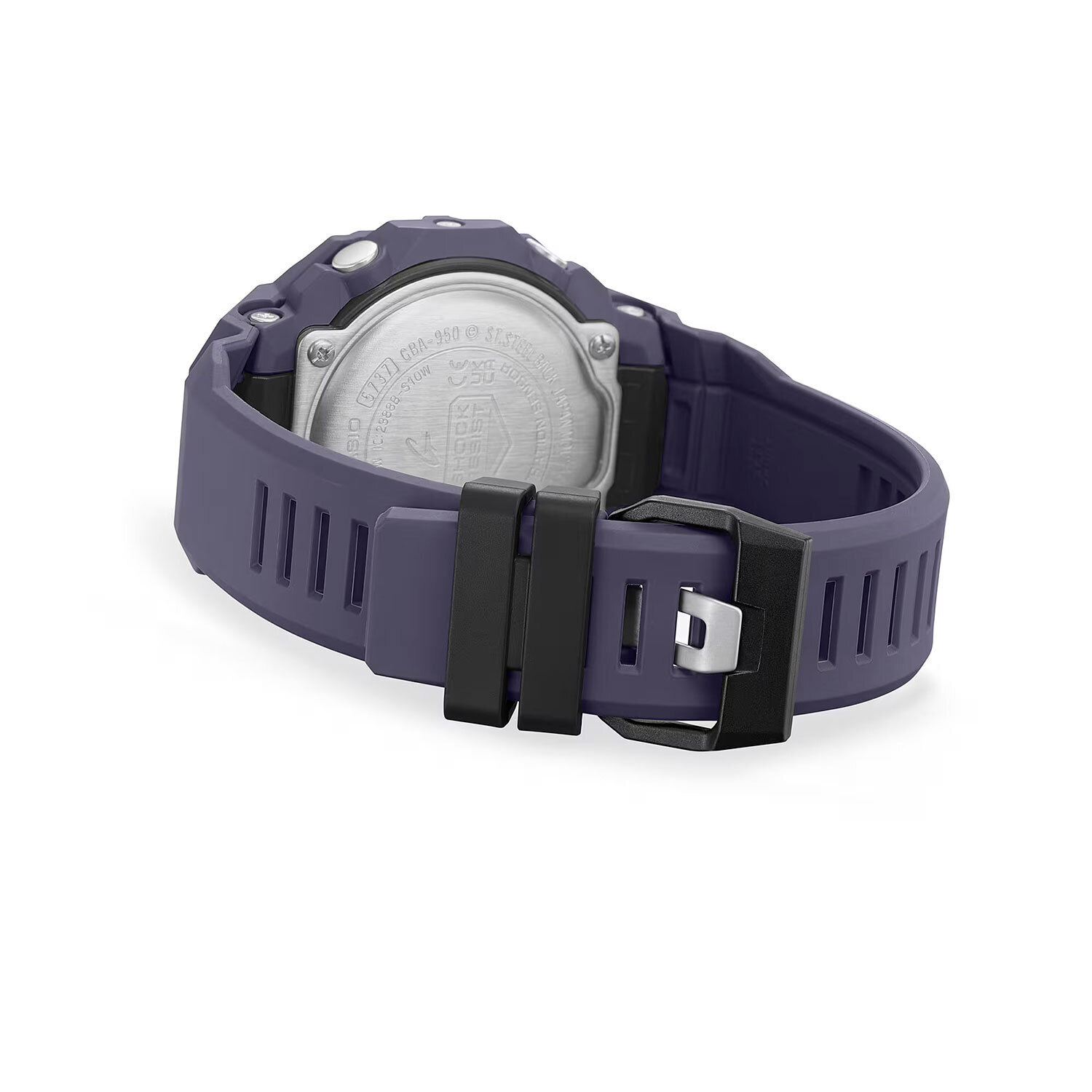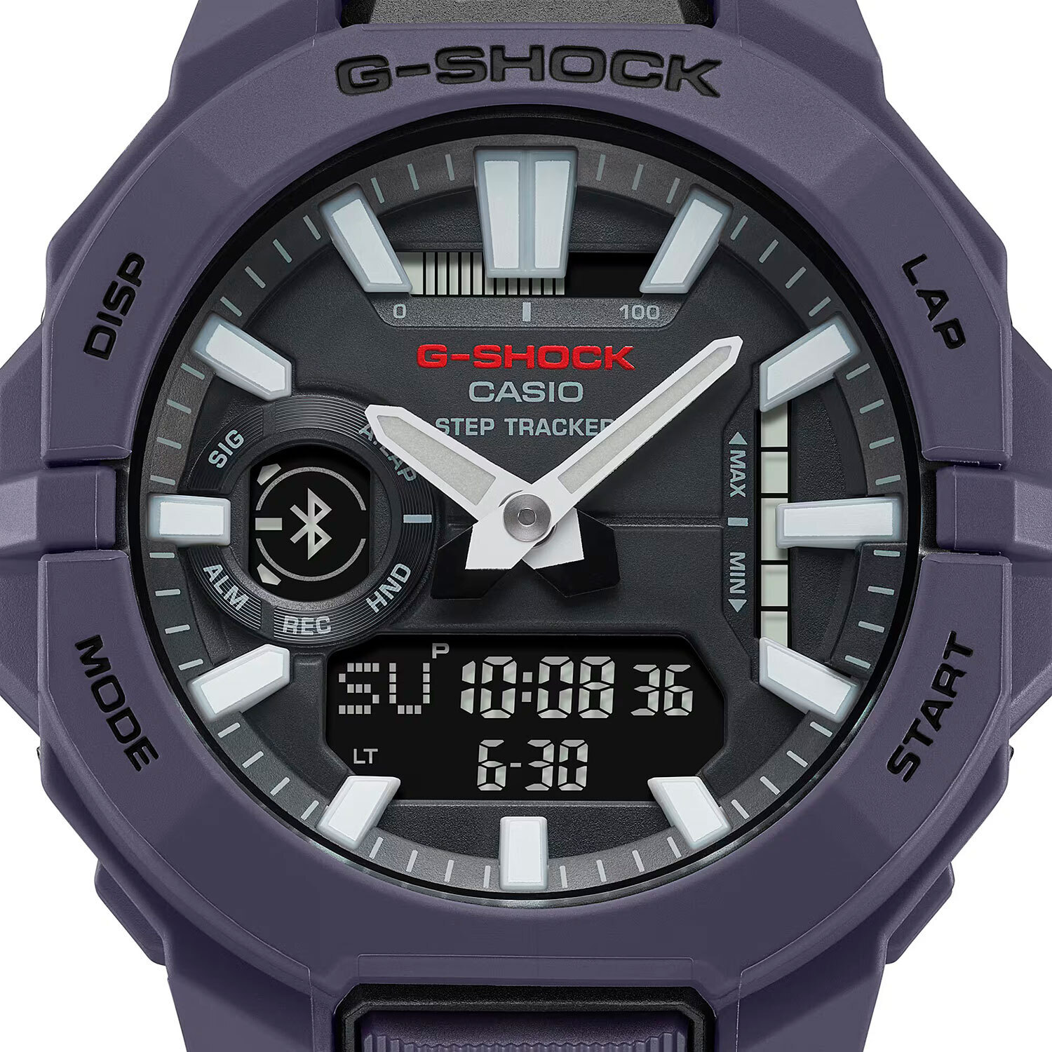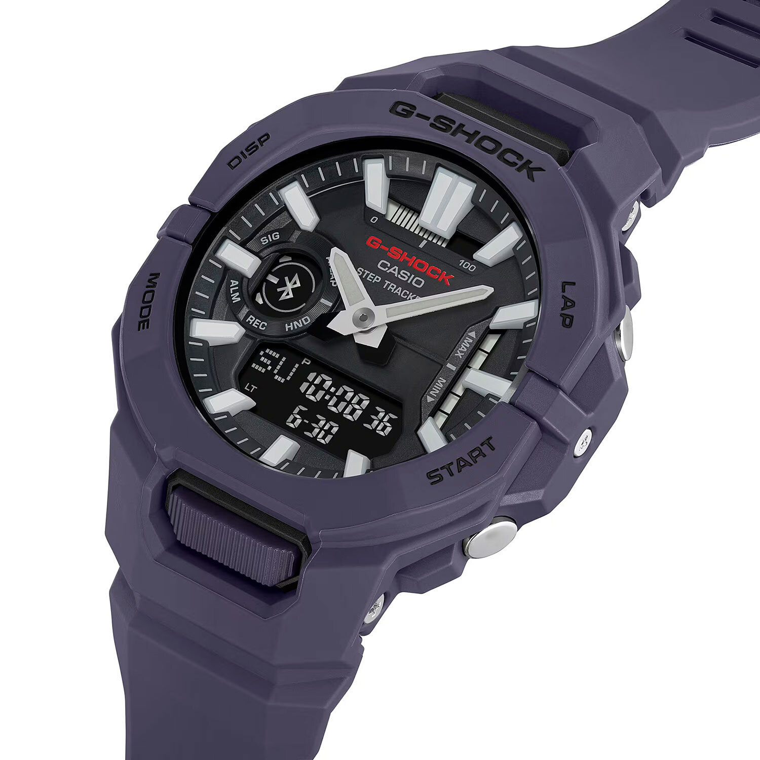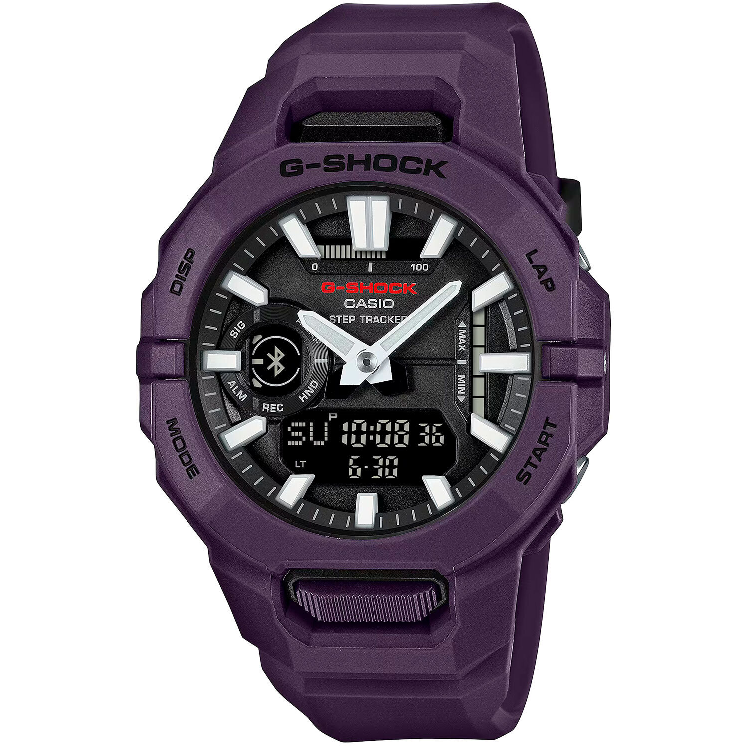 Мужские кварцевые аналого-цифровые наручные часы. Серия Casio G-Shock G-Squad. Спортивные часы для бегунов и любителей активного образа жизни. Цельная бесшовная конструкция безеля и ремешка обеспечивает плотную и удобную посадку часов на запястье. Противоударный корпус защищает механизм часов от ударов и вибрации. Двойная светодиодная подсветка (циферблата и ЖК-дисплея) с настраиваемой функцией послесвечения 1,5 или 3 секунды. 12-ти и 24-х часовой формат отображения времени. Секундомер с точностью показаний 1/100 секунды и временем измерения 24 ч. Режимы измерения: прошедшее время, время прохождения круга и части дистанции, память на 45 записей с данными о времени, дистанции, среднем темпе и сожженных калориях. Таймер обратного отсчёта от от 1 секунды до 24 часов с автоповтором, возможность установки до 5 таймеров. Количество повторений таймера от 1 до 20. Шагомер (в верхней части циферблата размещена шкала трекера шагов) автоматически начинает отсчет шагов при начинал движения. Точное количество шагов отображается на дисплее, а шкала у отметки 12 часов показывает прогресс достижения цели в процентах. Одновременное отображение текущего времени в двух разных часовых поясах. Мировое время – 300 городов. 5 ежедневных будильников, ежечасный сигнал. Часы оснащены беспроводной технологией Bluetooth® со сверхнизким потреблением энергии для синхронизации со смартфоном. При подключении к смартфону часы автоматически корректируют текущее время и получают доступ к ряду функций. Функция перемещения стрелок для удобного просмотра информации на цифровом экране. Функция отключения/включения звука кнопок. Функция поиска телефона. Предупреждение о низком уровне заряда аккумуляторной батареи. Автоматический календарь до 2099 года. Круглый корпус из биопластика (изготавливается из возобновляемых органических ресурсов) фиолетового цвета. Размеры корпуса 48,5 мм на 43,9мм, толщина 16мм. Чёрный циферблат с часовыми метками в виде штрихов. Центральные часовая и минутная стрелки. Стрелки и метки с люминесцентным покрытием, которое светится в темноте после непродолжительного воздействия света. Устойчивое к мелким механическим повреждениям минеральное стекло. Ремешок фиолетового цвета из биопластика (изготавливается из возобновляемых органических ресурсов) с классической застёжкой buckle. Батарея рассчитана на 2 года. Водонепроницаемость 200WR (плавание и погружение без акваланга). Вес около 53 г.