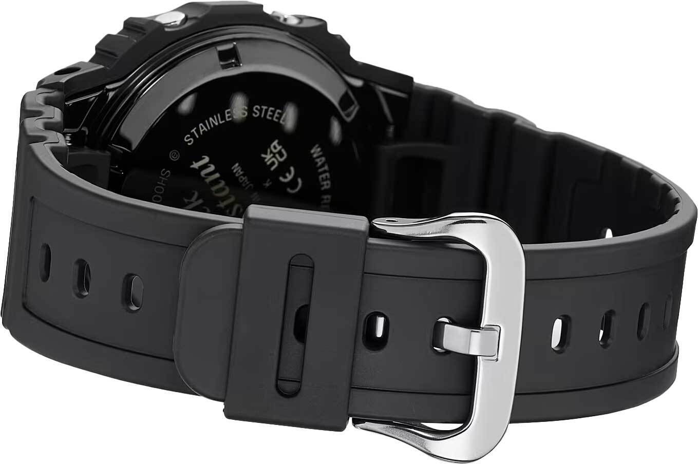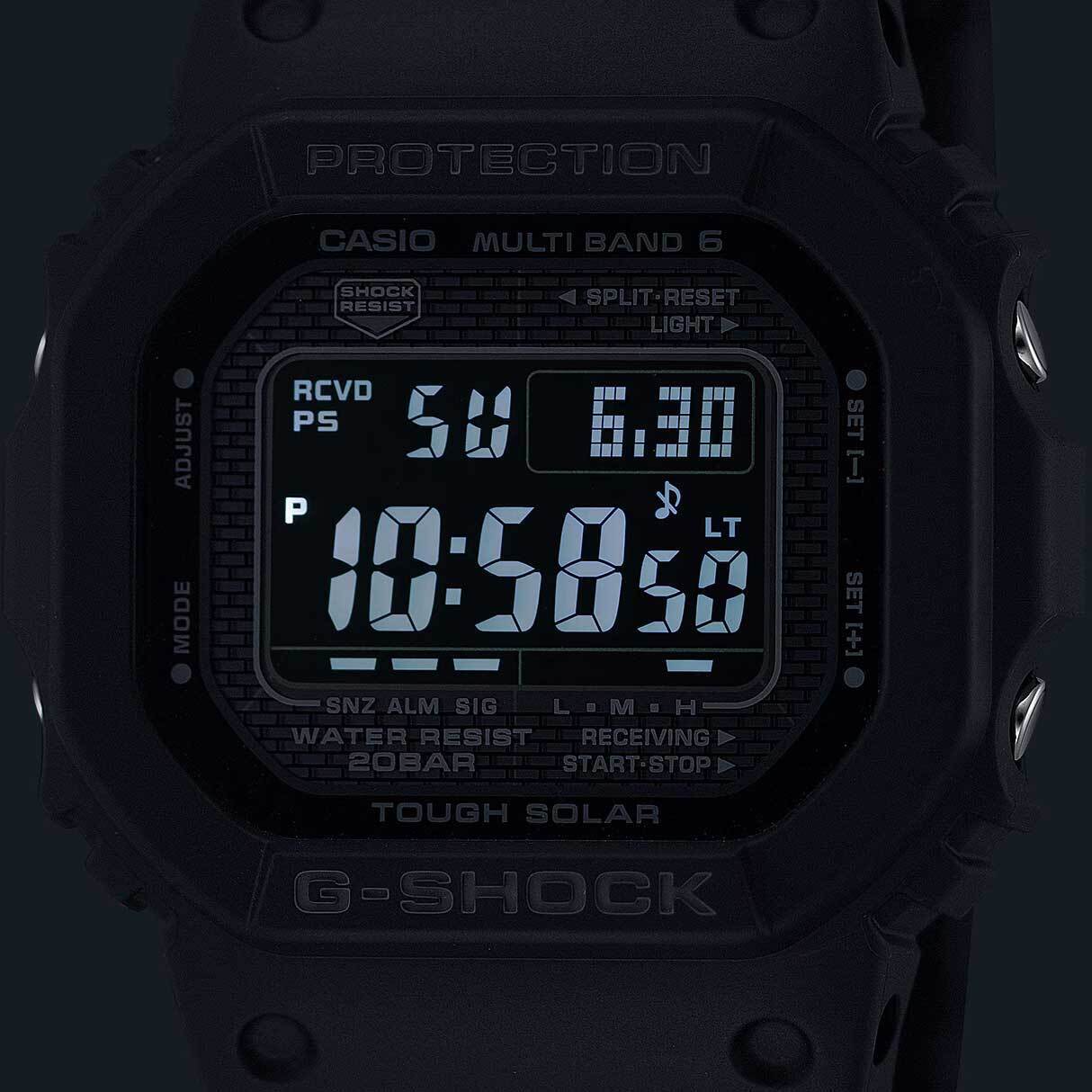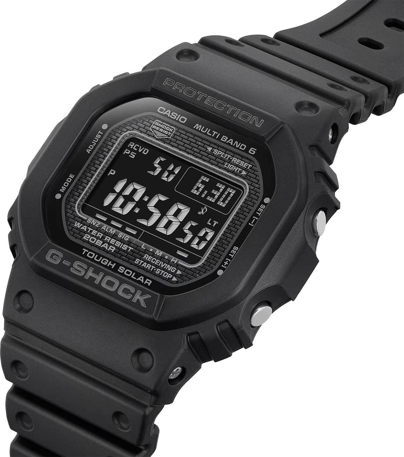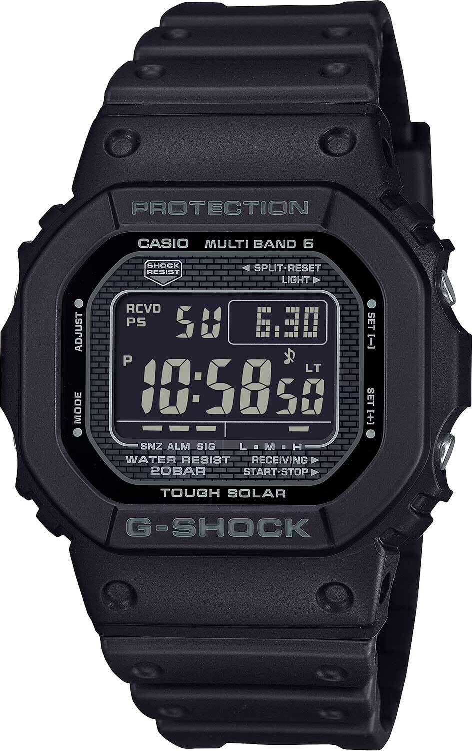 Мужские электронные кварцевые наручные часы. Серия Casio G-Shock. Противоударный корпус защищает механизм часов от ударов и вибрации. Питание от солнечной энергии (технология Tough Solar) - источником питания служит светочувствительная панель и аккумулятор, заряжаемый при попадании солнечного света на циферблат часов. Индикатор уровня заряда аккумулятора. Функция автоматического сохранения энергии (в темноте дисплей гаснет для экономии энергии). Время работы аккумулятора без подзарядки около 10 месяцев, при включенной функции сохранения энергии около 22 месяцев. Циферблат подсвечивается светодиодом. Настраиваемое послесвечение 1,5 или 3с. Цвет подсветки- белый. 12-ти и 24-х часовой формат отображения времени. Секундомер с точностью показаний 1/100с (до 1ч) и 1с (после 1ч) и временем измерения 24ч. Режимы измерения: прошедшее время, промежуточное время, два финишных результата. Таймер обратного отсчета от 1с до 24ч. Мировое время – 48 городов (31 часовой пояс), всемирное координированное время (UTC), переход на зимнее и летнее время, возможность включения/отключения данной функции, переключение между домашним и мировым временем. Возможность выбора до 5 городов в качестве избранных в WorldTime. Технология Multi Band 6 позволяет принимать сигналы от шести радиовышек, расположенных в различных точках земного шара, которые передают временные сигналы от определенных атомных часов. Коррекция текущего времени радиосигналом на территории почти всей Европы, США, Японии и Китая. Автоматический календарь до 2099 года. Отображение дней недели на шести языках, включая русский. Функция включения/отключения звука кнопок. 5 ежедневных будильников, один с функцией повтора сигнала Snooze, ежечасный сигнал. Прямоугольный корпус из нержавеющей стали DLC покрытием (Diamond Like Coating - углеродное покрытие с алмазными свойствами устойчиво к сильнейшим повреждениям. Обеспечивает повышенное сопротивление воздействию электричества и химических веществ) и биопластика (изготавливается из возобновляемых органических ресурсов) чёрного цвета. Размер корпуса 42,8 мм на 48,9мм, толщина 13,5мм. Устойчивое к мелким механическим повреждениям минеральное стекло. Чёрный ремешок из биопластика (изготавливается из возобновляемых органических ресурсов) с классической застёжкой buckle. Задняя крышка с винтовым фиксатором и DLC покрытием. Водонепроницаемость 200WR (плавание и погружение без акваланга). Вес около 74 г. Данная модель собирается только в Японии на производстве Casio в Ямагата.