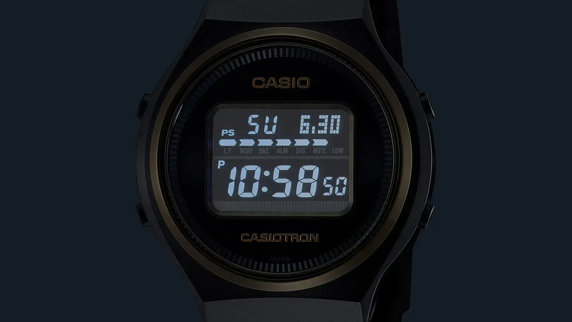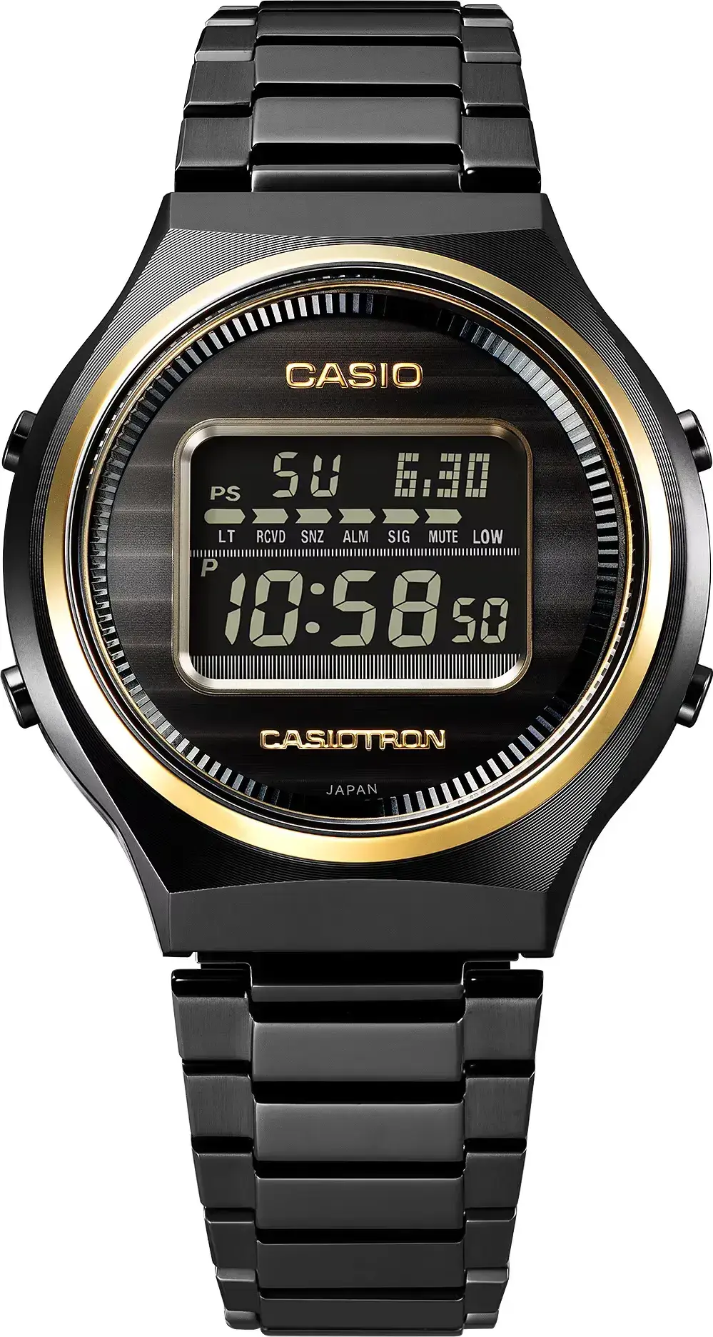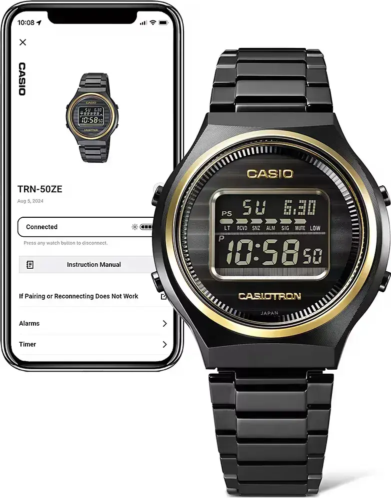 Мужские кварцевые электронные наручные часы на солнечной батарее. Коллекции Casiotron. Специальная серия, посвященная 50-летию компании Casio. Дизайн корпуса часов напоминает первые часы, выпущенные фирмой Casio в 1974 г - Casiotron QW02. Это были первые в истории электронные часы с функцией календаря, который автоматически подстраивал количество дней в каждом месяце. На стеклянной задней крышке часов гравировка в форме треугольного небоскреба штаб-квартиры Casio и юбилейного логотипа 50-th Anniversary. Такая же надпись (50-th Anniversary) выгравирована на золотистом звене браслета часов. Часы оснащены беспроводной технологией Bluetooth® со сверхнизким потреблением энергии для синхронизации со смартфоном. При подключении к смартфону часы автоматически корректируют текущее время и получают доступ к ряду полезных функций. Питание от солнечной энергии (технология Tough Solar) - источником питания служит светочувствительная панель и аккумулятор, подзаряжаемый при попадании солнечного света на дисплей часов. Функция энергосбережения (в темноте дисплей гаснет). Индикатор уровня заряда батареи. Срок работы часов с полным зарядом около 11 месяцев, и около 22 месяцаев при включенной функциии энергосбережения. Технология Multiband 6 - коррекция текущего времени радиосигналом почти по всему миру: Англия, Германия, США, Япония и Китай. Светодиодная подсветка с функцией послесвечения. Выбираемая длительность подсветки 2 или 4 секунды. Секундомер с точностью показаний 1/100 секунды и временем измерения 24 ч. Режимы измерения: прошедшее время, промежуточное время, два финишных результата. Таймер обратного отсчета от 1 секунды до до 24 часов с автоматическим повтором. 12/24х часовой формат отображения времени. 5 ежедневных будильников, один с функцией повтора сигнала, ежечасный сигнал. Мировое время - 39 часовых поясов (39 городов), всемирное координированное время (UTC), автоматическое переключение на летнее время (DST). Включение/выключение звука кнопок. Автоматический календарь до 2099 года, возможность отображения дня недели на шести языках. Функция поиска телефона. Круглый стальной корпус с покрытием чёрного цвета. Размеры корпуса 42,7 мм на 39,1 мм, толщина 12,3 мм. Стальной безель с покрытием цвета розового золота. Устойчивое к мелким механическим повреждениям минеральное стекло. Стальной браслет с покрытием чёрного цвета, тройная раскладывающаяся застежка. Завинчивающаяся задняя крышка из закалённого стекла. Водонепроницаемость 50 WR (мытьё рук, дождь). Вес около 111 г. Сборка модели осуществляется в Японии на премиальном производстве Casio в Ямагата. Часы поставляются в специальной экоупаковке, изготовленной из переработанных материалов.