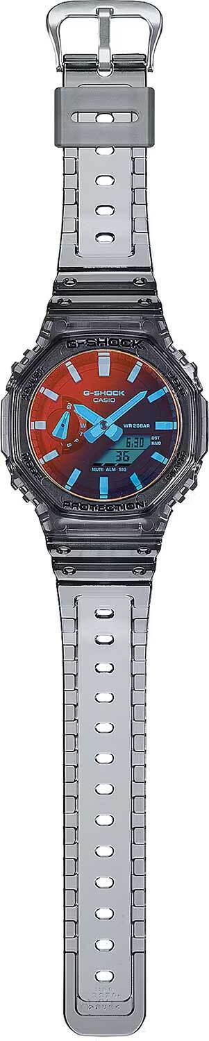 Мужские кварцевые аналогово-цифровые наручные часы. Серия G-Shock Beach Iridescent. Дизайн часов вдохновлен видами пляжа в сумерках. Корпус и ремешок выполнены из биопластика, который изготавливается из возобновляемых органических ресурсов. Благодаря уникальному стеклу, используемому в циферблате этих часов, оттенки цвета циферблата меняются в зависимости от угла обзора. Противоударный пластиковый корпус с углеродными волокнами (структура Carbon Core Guard) более прочный и в то же время более легкий, защищает механизм часов от ударов и вибраций. Двойная светодиодная подсветка обеспечивает подсветку не только цифрового дисплея, но и аналогового циферблата. Настройка продолжительности подсветки 1,5 или 3 секунды, послесвечение. Светящееся покрытие стрелок обеспечивает длительное послесвечение в темноте после короткого воздействия света. 12-ти и 24-х часовой формат отображения времени. Секундомер с точностью показаний 1/100 с (первый час) и 1 с (после первого часа) и временем измерения 24 часа. Режимы измерения: прошедшее время, промежуточное время, два финишных результата. Таймер обратного отсчета от 1 секунды до 24 часов (с интервалом в 1 секунду) с автоповтором. Мировое время - 31 часовой пояс (48 городов), всемирное координированное время (UTC), включение/отключение летнего времени. 5 ежедневных будильников, ежечасный сигнал. Функция перемещения стрелок для удобного просмотра информации на цифровом экране. Ретроградный указатель для недели. Функция отключения/включения звука кнопок. Автоматический календарь до 2099 года. Усиленный углеродными волокнами пластиковый восьмиугольный корпус серого цвета. Размер корпуса 45,4 мм на 48,5мм, толщина 11,8мм. Устойчивое к мелким механическим повреждениям минеральное стекло. Серый полупрозрачный пластиковый ремешок со стандартной застёжкой Buckle. Примерный срок службы батареи 3 года. Водонепроницаемость 200WR (плавание и ныряние без акваланга). Вес около 51 г.