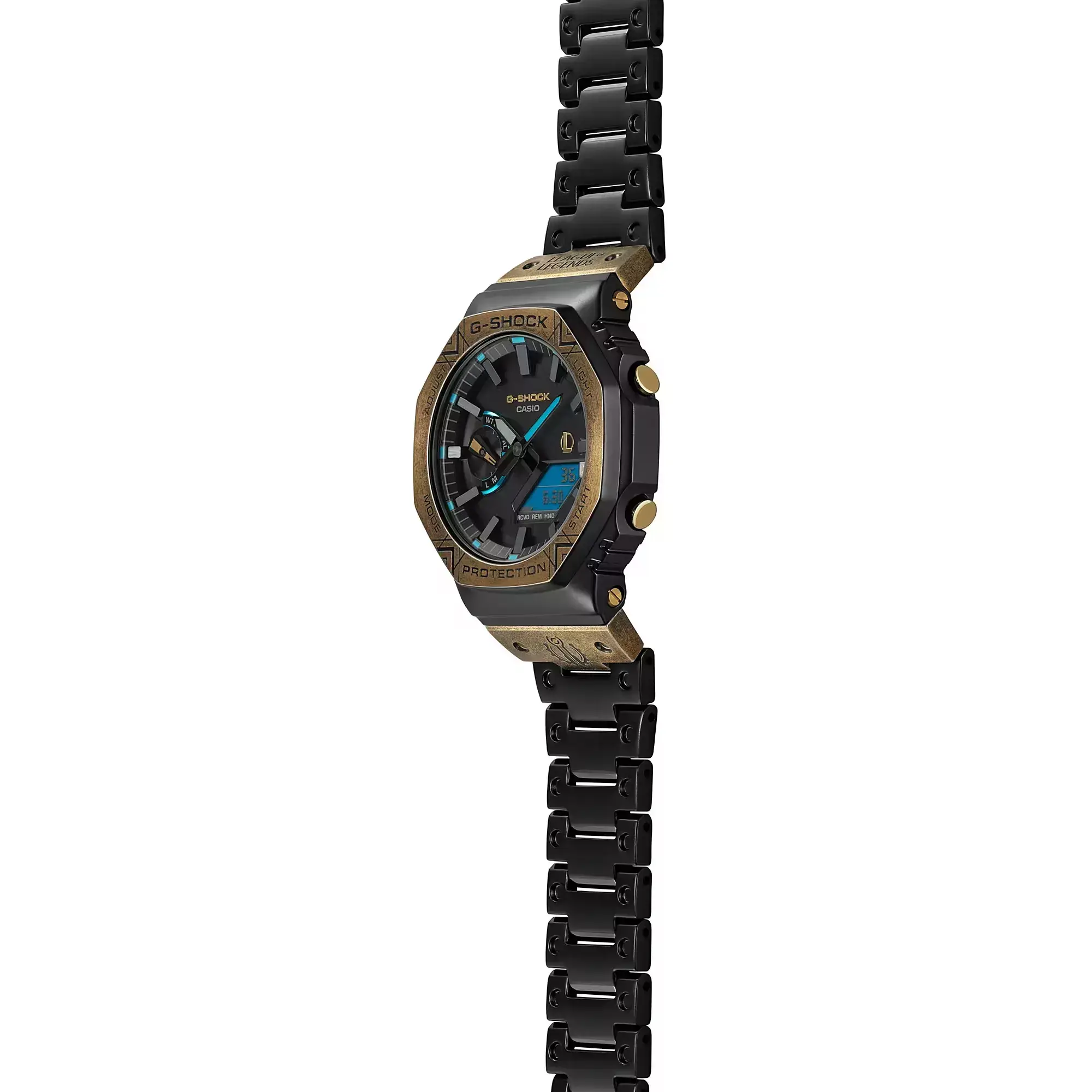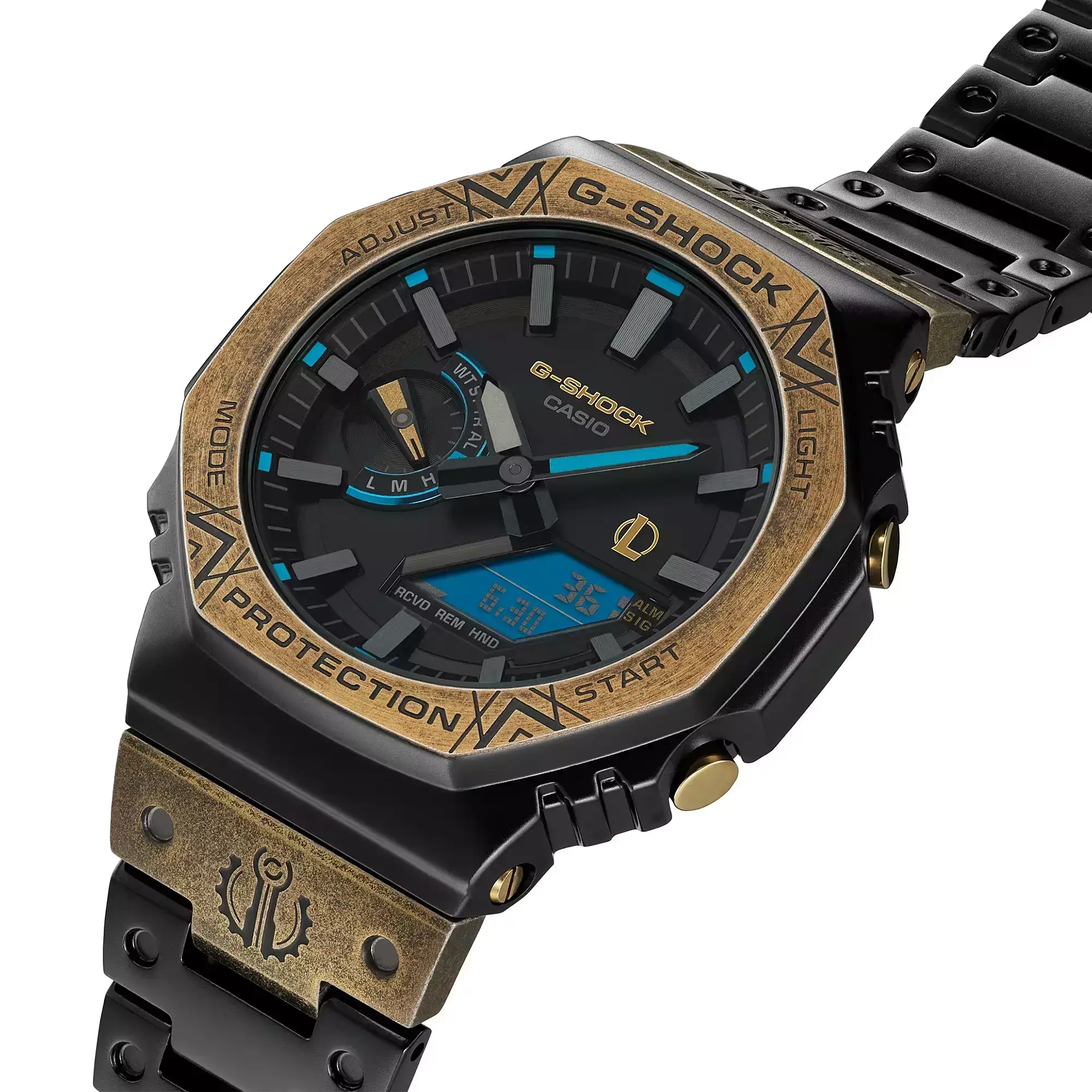 Мужские кварцевые аналогово-цифровые наручные часы. Серия G-Shock Limited - ограниченная серия коллаборация G-Shock и популярной компьютерной игры League of Legends (LoL). Дизайн часов выполнен в стилистике игры League of Legends: черный стальной матовый корпус с безелем золотистого оттенка с эффектом старения и магическими рунами на нем. На первом звене браслета с одной стороны нанесен логотип игры League of Legends, а с другой стороны нанесён герб города Пилтовер - одного из самых прогрессивных городов во вселенной League of Legends. На задней стальной крышке часов также выгравирован логотип игры League of Legends. Часы упакованы в дизарнейский кейс, украшенный логотипом игры League of Legends и гербом города Пилтовер. Противоударный корпус защищает механизм часов от ударов и вибрации. Модуль часов снабжен элементами из материала alphaGEL, который еще лучше защищает часы от сотрясения и вибрации. АlphaGEL представляет собой гибкую силиконовую прослойку, оказывающую амортизирующий эффект. Питание от солнечной энергии Tough Solar - источником питания служит светочувствительная панель и аккумулятор, подзаряжаемый от солнечного света. Индикатор уровня заряда батареи. Функция автоматического сохранения энергии. Время работы аккумулятора без подзарядки около 7 месяцев, при включенной функции сохранения энергии около 18 месяцев. Двойная светодиодная подсветка обеспечивает подсветку не только аналогового циферблата, но и цифрового дисплея. Настраиваемое послесвечение 1,5 с или 3с, послесвечение. Необритовое светонакопительное покрытие обеспечивает длительное послесвечение в темноте даже после кратковременного нахождения на свету. 12-ти и 24-х часовой формат отображения времени. Секундомер с точностью измерения 1/100 секунды (в течение первого часа) и 1 секунда (через 1 час) и временем измерения 24ч. Режимы измерения: прошедшее время, время прохождения части и круга дистанции. Таймер обратного отсчета от 1с до 1часа с интервалом в 1 секунду. Мировое время – 38 городов (38 часовых поясов), всемирное координированное время (UTC). Функция включения/отключения летнего времени, переключение между домашним и мировым временем. Синхронизация со смартфоном с помощью беспроводной технологии Bluetooth автоматически корректирует текущее время и позволяет получить доступ к ряду функций часов. Функция поиска телефона. Функция отключения/включения звука кнопок. Функция перемещения стрелок. 5 ежедневных будильников, почасовой сигнал времени. Автоматический календарь до 2099 г, отображение дней недели на шести языках. Чёрный циферблат с метками в виде штрихов. Устойчивое к мелким механическим повреждениям минеральное стекло. Восьмиугольный корпус из нержавеющей стали с покрытием чёрного цвета. Размеры корпуса 49,5 мм х 44,4 мм , толщина 12,8 мм. Завинчивающаяся задняя крышка. Браслет из нержавеющей стали с IP покрытием чёрногоцвета (повышает устойчивость к царапинам), раскладывающаяся тройная застежка. Водонепроницаемость 200 WR (плавание и ныряние без акваланга). Вес около 165 г.
