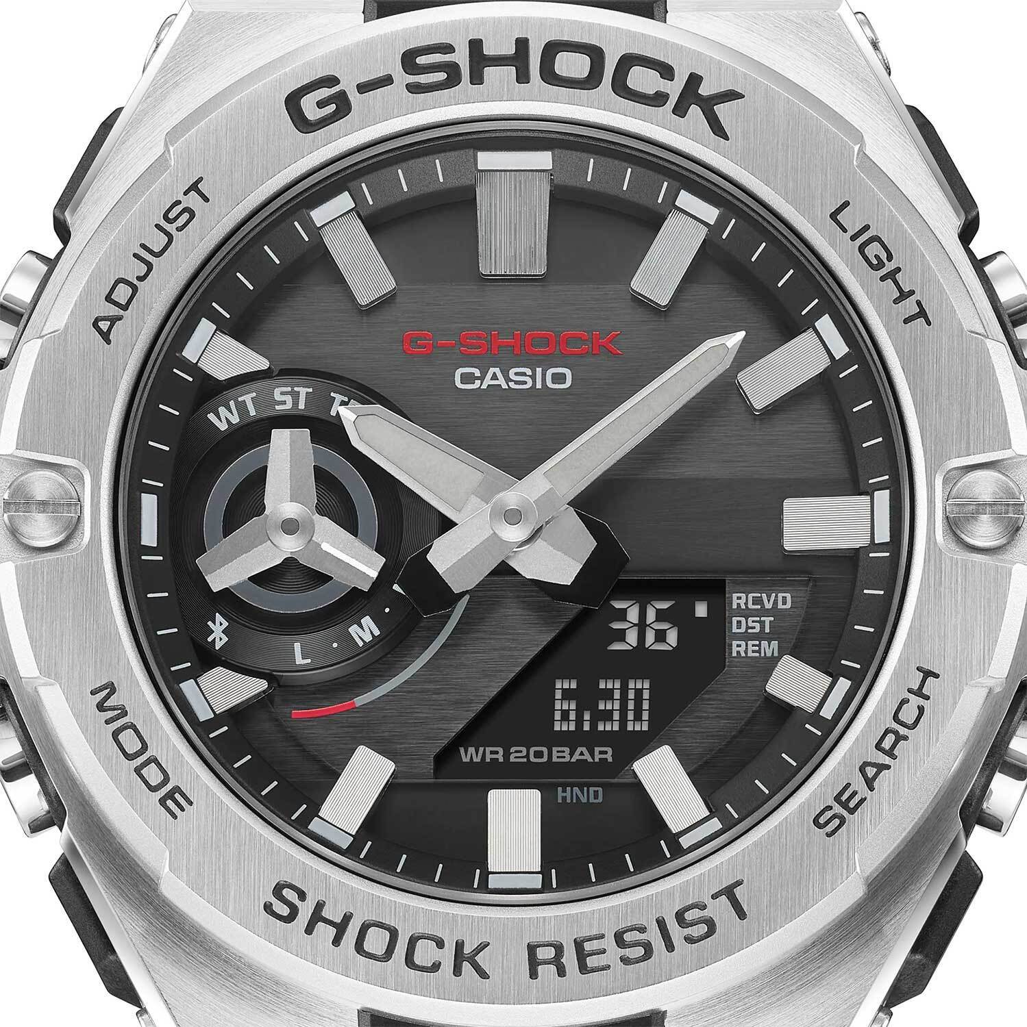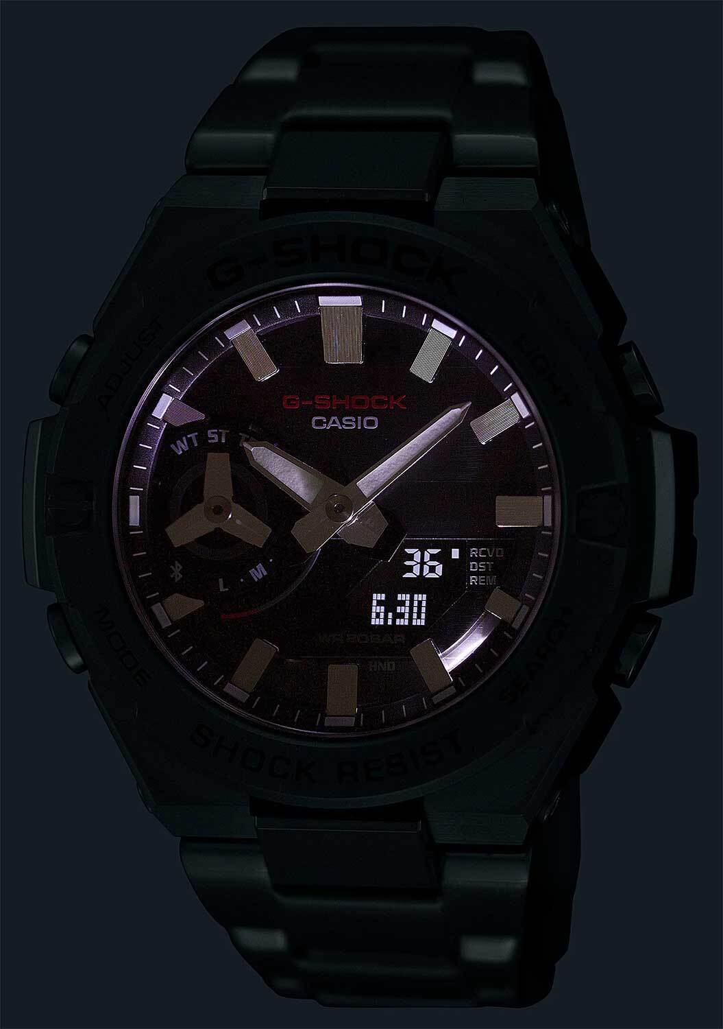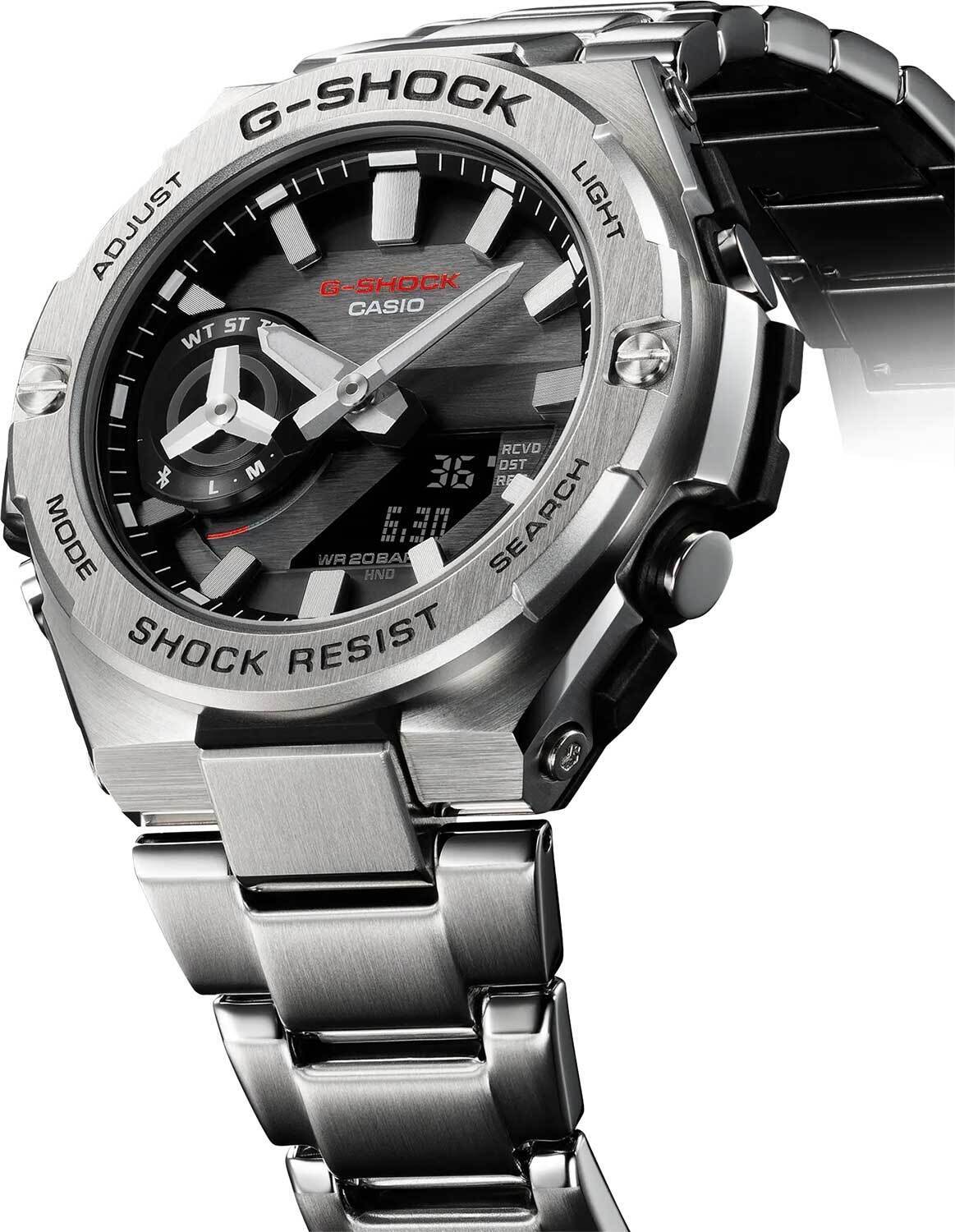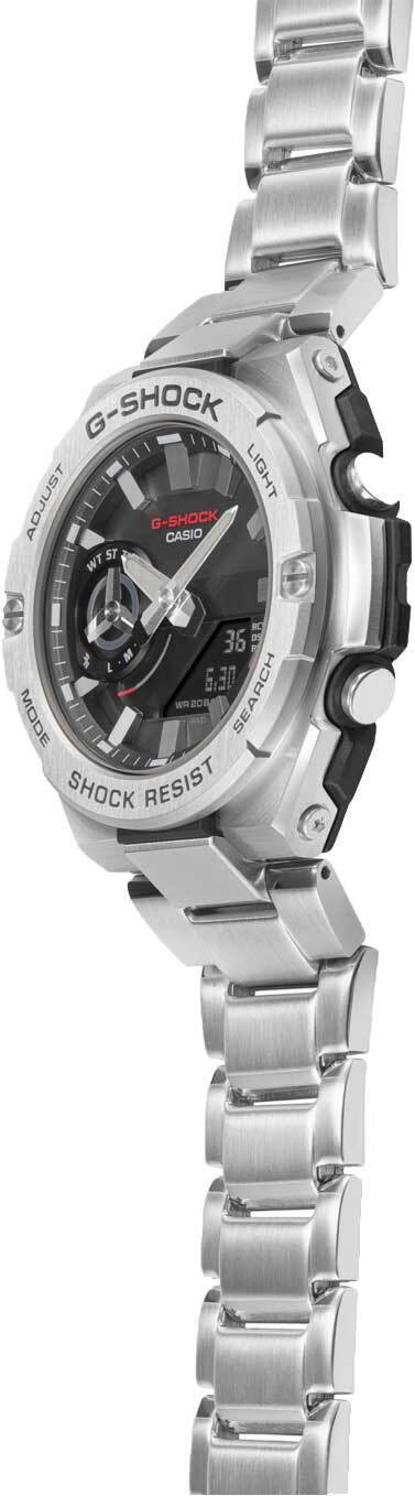 Мужские кварцевые аналого-цифровые наручные часы на солнечной батарее. Серия G-Shock G-Steel. Противоударный корпус защищает механизм часов от ударов и вибрации. Питание от солнечной энергии (технология Tough Solar) - источником питания служит светочувствительная панель и аккумулятор, подзаряжаемый при попадании солнечного света на лицевую поверхность часов. Индикатор уровня заряда батареи. Время работы аккумулятора без подзарядки приблизительно 7 месяцев, при включенной функции сохранения энергии приблизительно 18 месяцев. Функция автоматического сохранения энергии. Двойная светодиодная подсветка Super Illuminator обеспечивает подсветку не только аналогового циферблата, но и цифрового дисплея. Настраиваемое послесвечение 1,5 с или 3 с. Необритовое светонакопительное покрытие стрелок и часовых индексов обеспечивает длительное послесвечение в темноте даже после кратковременного воздействия света. 12-ти и 24-х часовой формат отображения времени. Секундомер с точностью показаний 1/100 с (в течение первого часа) и 1с (через 1 час) и временем измерения 24ч. Режимы измерения: прошедшее время, время прохождения части и круга дистанции. Таймер обратного отсчета от 1с до 1ч с интервалом в 1 секунду. Сигнал оповещения об окончании обратного отсчета звучит в течение 10 секунд. Мировое время – 38 городов (38 часовых поясов), всемирное координированное время (UTC). Функция включения/отключения летнего времени. Переключение между домашним и мировым временем. Беспроводная технология Bluetooth® со сверхнизким потреблением энергии для синхронизации со смартфоном. При подключении к смартфону часы корректируют текущее время (до 4 раз в день) и получают доступ к ряду полезных функций. 5 ежедневных будильников, почасовой сигнал времени. Автоматический календарь до 2099 г, отображение дней недели на шести языках. Включение/выключение звука кнопок. Функция перемещения стрелок. Функция поиска телефона. Центральные часовая и минутная стрелки. Чёрный циферблат с часовыми метками в виде штрихов. Устойчивое к мелким механическим повреждениям минеральное стекло. Корпус из нержавеющей стали, армированный углеродными волокнами (структура Carbon Core Guard). Размеры корпуса 46,6 мм на 48,, мм , толщина 12,8 мм. Браслет из нержавеющей стали, раскладывающаяся застежка. Водонепроницаемость 200 WR (плавание и ныряние без акваланга). Вес около 143 г.
