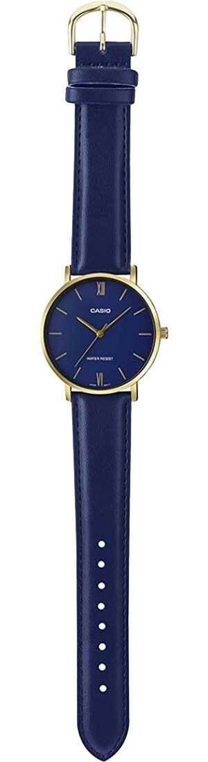 Мужские кварцевые аналоговые часы. Casio Collection. Центральные часовая, минутная и секундная стрелки. Синий циферблат с часовыми метками в виде штрихов и двух римских цифр. Устойчивое к мелким механическим повреждениям минеральное стекло. Круглый стальной корпус с покрытием цвета жёлтого золота. Размер корпуса 40 мм на 46 мм, толщина 8,2 мм. Синий кожаный ремешок с классической застежкой buckle. Батарея рассчитана на 3 года. Водонепроницаемость 30 WR (брызги). Вес около 41 г.