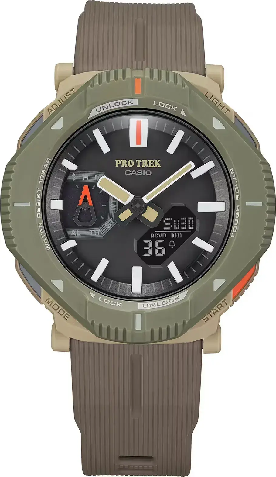 Мужские кварцевые аналого-цифровые наручные часы. Коллекция Casio ProTrek. Питание от солнечной энергии (технология Tough Solar) - источником питания служит светочувствительная панель и аккумулятор, подзаряжаемый при попадании солнечного света на циферблат часов. Индикатор уровня заряда батареи (стрелка индикатора на дополнительном малом циферблате в положении «9 часов» смоделирована по образцу карабина). Функция энергосбережения. Время работы без подзарядки в обычном режиме до 7 месяцев, в режиме энергосбережения до 18 месяцев. Часы оснащены беспроводной технологией Bluetooth® со сверхнизким потреблением энергии для синхронизации со смартфоном. При подключении к смартфону через специальное приложение, часы автоматически корректируют текущее время и получают доступ к ряду полезных функций. Двойная светодиодная подсветка Super Illuminator обеспечивает подсветку не только аналогового циферблата, но и цифрового дисплея, выбираемая продолжительность подсветки 1,5 или 3 секунды, послесвечение. Светонакопительное покрытие стрелок обеспечивает длительное послесвечение в темноте даже после кратковременного воздействия света. Часы устойчивы к низким температурам (до -10°С). Мировое время - 38 часовых зон (38 городов), всеобщее скоординированное время (UTC), возможность быстрого переключения между текущем временем и временем выбранной часовой зоны. Функция включения/отключения летнего времени. Секундомер с точностью показаний 1/100 секунды (первые 60 минут) и 1 секунда (через 60 минут) и временем измерения 24 ч. Режимы измерения: прошедшее время, время круга/промежуточное время. Таймер обратного отсчета от 1 секунды до 60 минут (1-секундное возрастание, 1-минутное возрастание). 5 ежедневных будильников, ежечасный сигнал. Автоматический календарь до 2099 года. 12/24х часовой формат отображения времени. Функция включения/отключения звука кнопок. Функция перемещения стрелок для удобного просмотра информации на цифровом экране. Функция поиска телефона. Корпус из биопластика ( изготавливается из возобновляемых органических ресурсов) бежевого цвета. Размеры корпуса 46 мм на 50,3 мм, толщина 13,6 мм. Часы оснащены поворотным защитным безелем, позволяющем переключаться между двумя различными стилями в дизайне корпуса часов: положение, закрывающее кнопки, предотвращает случайное нажатие кнопок во время прогулки или в городе; поворот безеля на 45 градусов обеспечивает легкий доступ к кнопкам. Устойчивое к возникновению мелких механических повреждений минеральное стекло. Ремешок из биополимерного пластика ( изготавливается из возобновляемых органических ресурсов) коричневого цвета с классической застёжкой buckle. Водозащищённость 100WR (плавание и ныряние без акваланга). Вес около 44г — самые легкие часы линейки ProTrek.