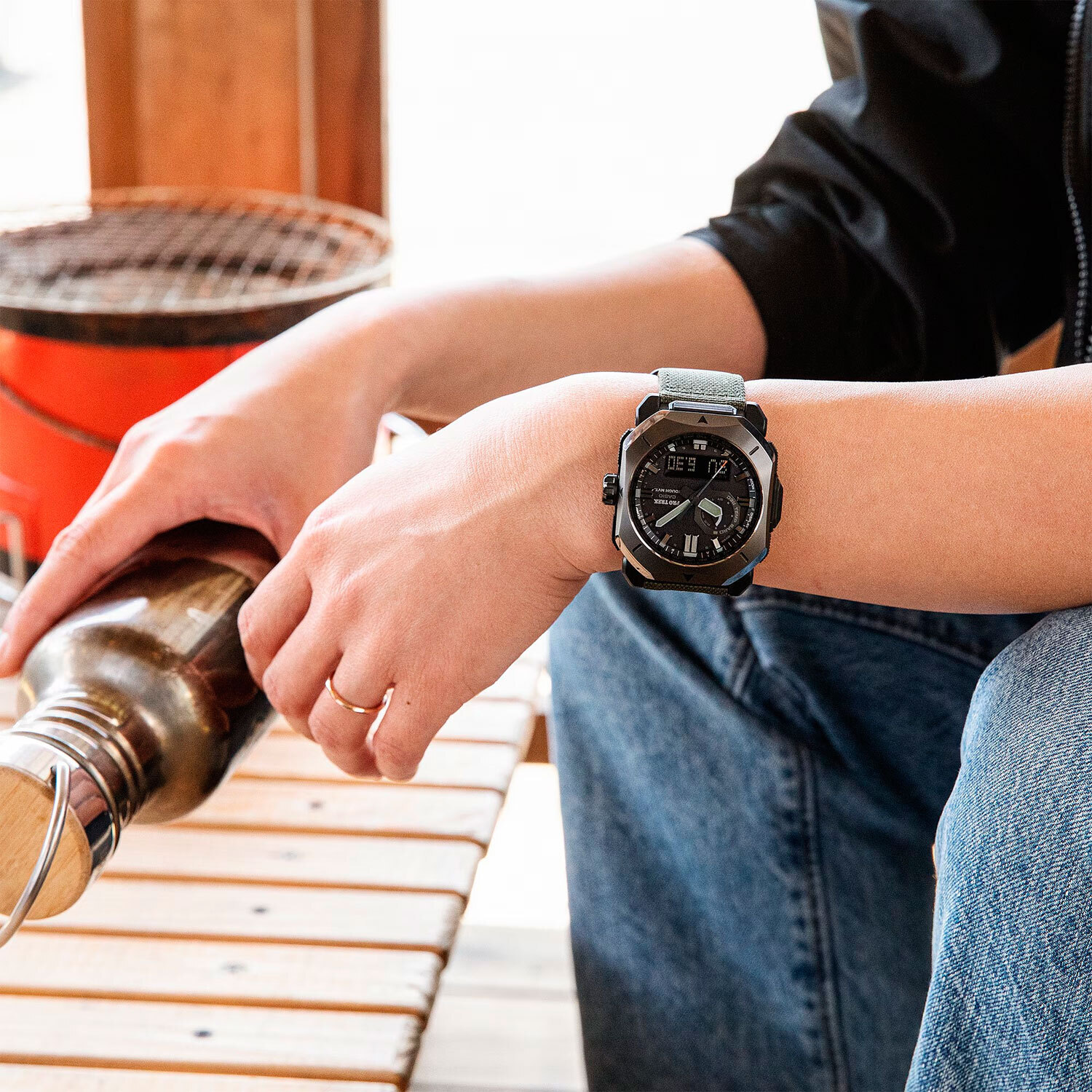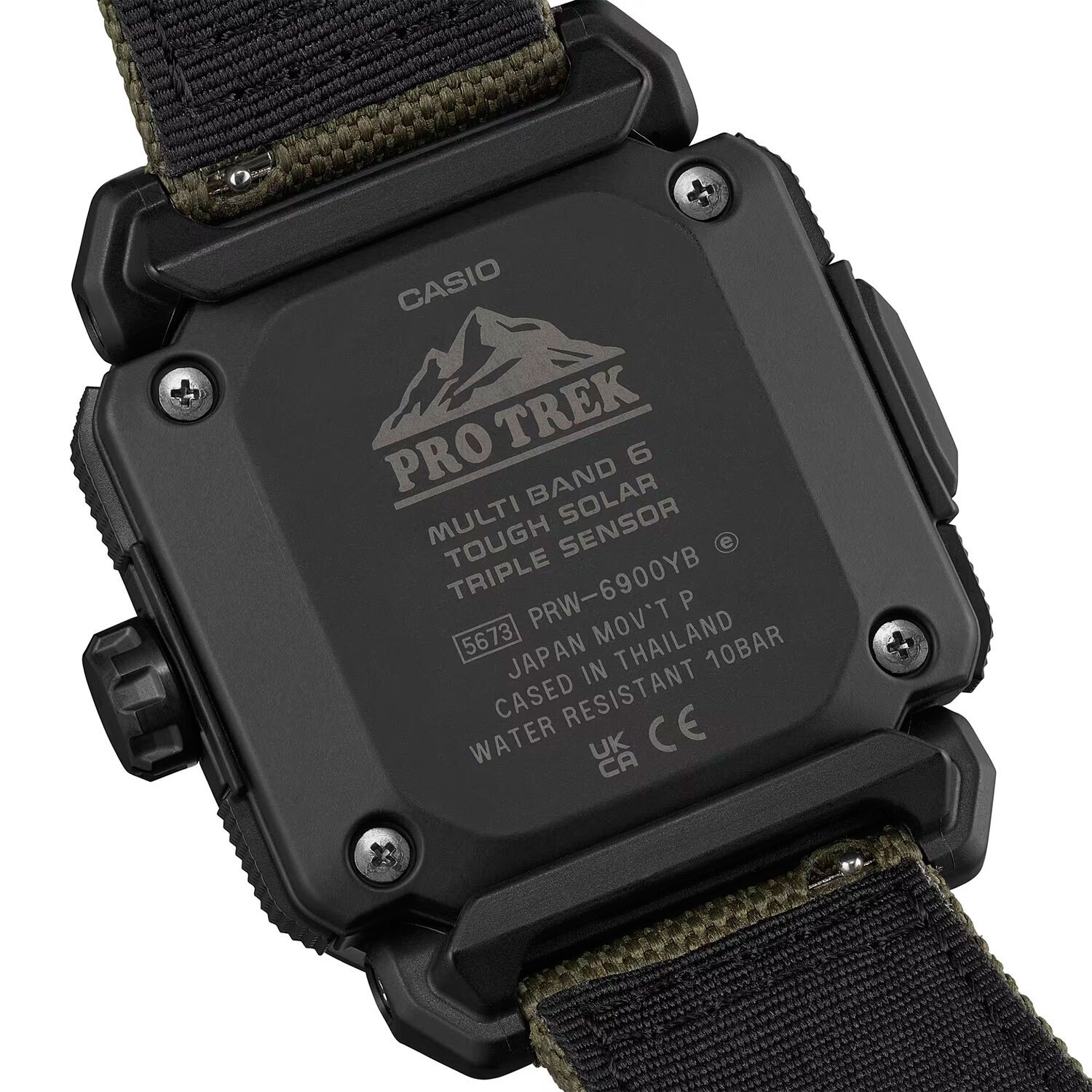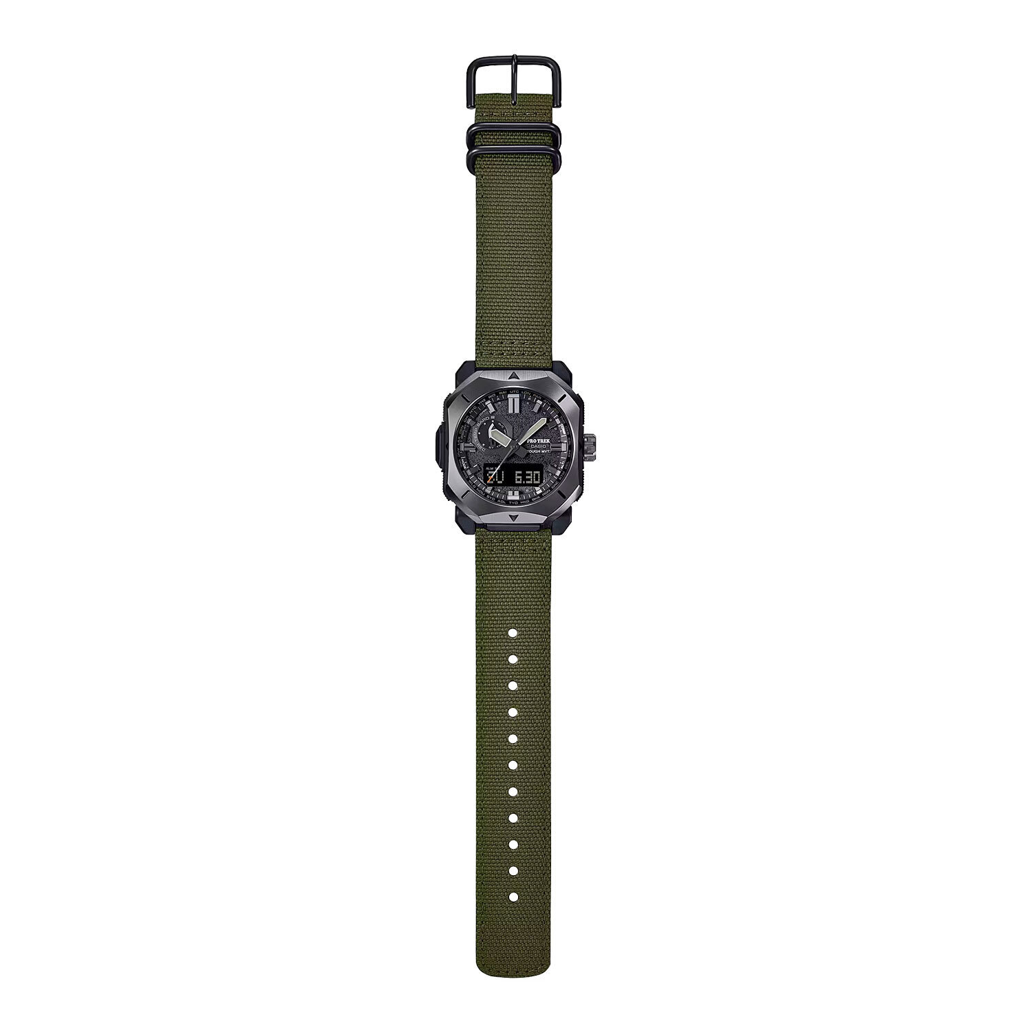 Мужские кварцевые аналого-цифровые часы. Серия Pro Trek. Питание от солнечной энергии (технология Tough Solar) - источником питания служит светочувствительная панель и аккумулятор, заряжаемый при попадании солнечного света на циферблат часов, индикатор уровня заряда батареи. Индикатор уровня заряда аккумулятора. Функция автоматического сохранения энергии ( в темноте дисплей гаснет для экономии энергии). Время работы аккумулятора без подзарядки приблизительно 6 месяцев, при включенной функции сохранения энергии приблизительно 25 месяцев. Модуль часов рассчитан на работу при низких температурах до -10°С/14°F. Двойная светодиодная подсветка обеспечивает подсветку не только аналогового циферблата, но и цифрового дисплея. Автоматическое включение подсветки - поворот руки при недостаточном освещении обеспечит автоматическое включение подсветки дисплея, настройка продолжительности подсветки 1,5 или 3с. Необритовое светонакопительное покрытие стрелок обеспечивает длительное послесвечение в темноте даже после кратковременного воздействия света. Секундомер с точностью показаний 1/10с и временем измерения 24ч. Режимы измерения: прошедшее время, промежуточное время, два финишных результата. Таймер обратного отсчета от 1мин до 1ч. Мировое время – 29 городов (29 часовых поясов), всемирное координированное время (UTC). Функция включения/отключения летнего времени. Переключение между домашним и мировым временем. Функция автоматической коррекции положения стрелок проверяет положение стрелок каждый час и корректирует его в случае необходимости. Технология Multi Band 6 позволяет принимать сигналы от шести радиовышек, расположенных в различных точках земного шара, которые передают временные сигналы от определенных атомных часов. Коррекция текущего времени радиосигналом на территории почти всей Европы, США, Японии и Китая. Технология Triple Sensor позволяет точно и легко определять сторону света, температуру и атмосферное давление. Термометр от -10° до +60°С с точностью 0,1°C. Барометр - измерение атмосферного давления от 260 до 1100 гПа (от 195 до 825 мм рт. ст.). Встроенный цифровой компас. Диапазон измерения от 0° до 359° с точностью 1°. Высотомер - встроенный датчик барометрического давления с возможностью вывода результатов в единицах высоты над уровнем моря (от -700 до 10000 метров). График набора высоты. Хранение до 30 записей о высотных точках рельефа местности - измеренной абсолютной высоты, даты и времени. Система Smart Access с помощью переводной головки обеспечивает простой и удобный доступ ко всем важным функциям часов - нажатие или поворот переводной головки позволяет переключаться между различными режимами и активировать будильник, таймер, секундомер, а также настраивать функцию мирового времени. Функция перемещения стрелок для удобного просмотра информации на цифровом экране. Автоматический календарь до 2099 г. 5 ежедневных будильников, сигнал начала часа. Завинчивающаяся переводная головка. 12/24-часовое отображение времени. Функция отключения/включения звука кнопок. Устойчивое к мелким механическим повреждениям минеральное стекло. Циферблат с метками в виде штрихов имеет текстуру напоминающую чугунную посуду, которую используют путешественники для приготовления пищи на костре. Пластиковый корпус. Стальной безель с IP покрытием чёрного цвета. Зелёный тканевый 