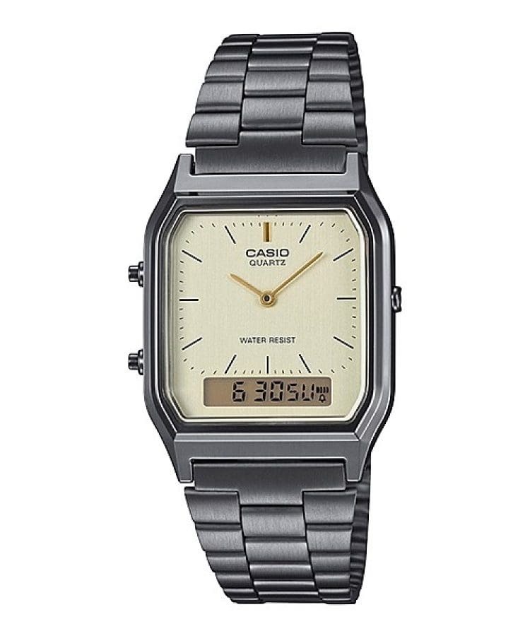 Мужские японские наручные часы Casio Vintage AQ-230GG-9A. Кварцевый механизм с высокой точностью +/- 30 сек в месяц. Двойное время позволит видеть на экране время двух разных часовых поясов. Секундомер с высокой точностью в 1/100 секунды с измерением до 1 часа. Ежедневный будильник, ежечасный сигнал. Автоматический календарь до 2099 года. Отображение времени в часовом формате 12/24. Прочное пластиковое стекло обеспечит защиту часов от повреждений, разбить такое стекло очень сложно. Водонепроницаемость 30WR (3 Бар) защитит Ваши часы от брызг и дождя, но плавать в них нельзя. Корпус часов сделан из высококачественного пластика. Браслет стальной с легко регулируемой застежкой. Срок службы 1 аккумулятора до 3 лет. Мужские японские наручные часы Casio – это стильный аксессуар, который дополнит Ваш образ в повседневной жизни.