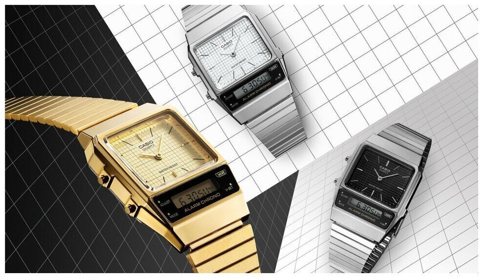 Кварцевые часы. Центральные часовая и минутная стрелки. Кремовый циферблат. Дополнительный циферблат мирового времени. Функция секундомера с точностью 1/100 секунды и пределом измерения 1 час. Ежедневный будильник. Автоматический календарь. 12/24х часовой формат времени. Корпус выполнен из полимерного пластика золотистого цвета. Размер корпуса составляет 40,7 x 32,1 x 8,7 мм. Стальной браслет с золотистым IP покрытием, раскладывающаяся застежка. Акриловое стекло. Водостойкие (брызги). Вес примерно 52 гр.