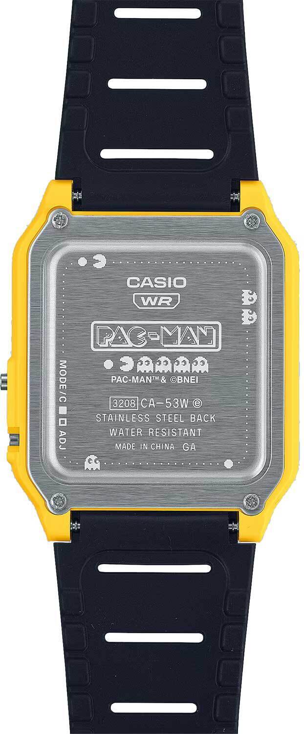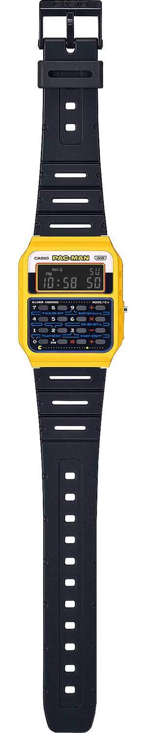 Кварцевые электронные часы. Коллекция Casio Vintage x Pac Man. Унисекс часы. Модель создана в честь 50-летия компании Casio и 45-летия аркадной компьютерной игры Pac-Man, которую в 1980 году разработала и выпустила компания Bandai Namco Entertainmentl. Дизайн часов вдохновлён первым в мире персональным калькулятором Casio Mini, представленном в 1972 году фирмой Casio. 8-разрядный калькулятор. Секундомер с точностью показаний 1/100 секунды и временем измерения 24ч. Режимы измерения: прошедшее время, промежуточное время, два финишных результата. Второй часовой пояс. 12/24х часовой формат отображения времени. Ежедневный будильник, ежечасный сигнал. Автоматический календарь до 2099 года. Включение/выключение звука кнопок. Пластиковое стекло. Прямоугольный корпус из полимерного пластика жёлтого цвета. Размеры корпуса 34,4 мм на 43,2 мм, толщина 8,2 мм. Циферблат часов выполнен в стиле "игрового экрана", на котором изображен персонаж и логотип игры PAC- MAN. Стальная задняя крышка корпуса украшена гравировкой персонажа и логотипом PAC-MAN. Чёрный ремешок из биопластика (изготавливается из возобновляемых органических ресурсов) с классической застёжкой buckle. Батарея рассчитана на 5 лет. Водонепроницаемость WR30 (защита от брызг). Вес около 25 г. Часы поставляется в специальной упаковке с дизайном аркадного игрового автомата.