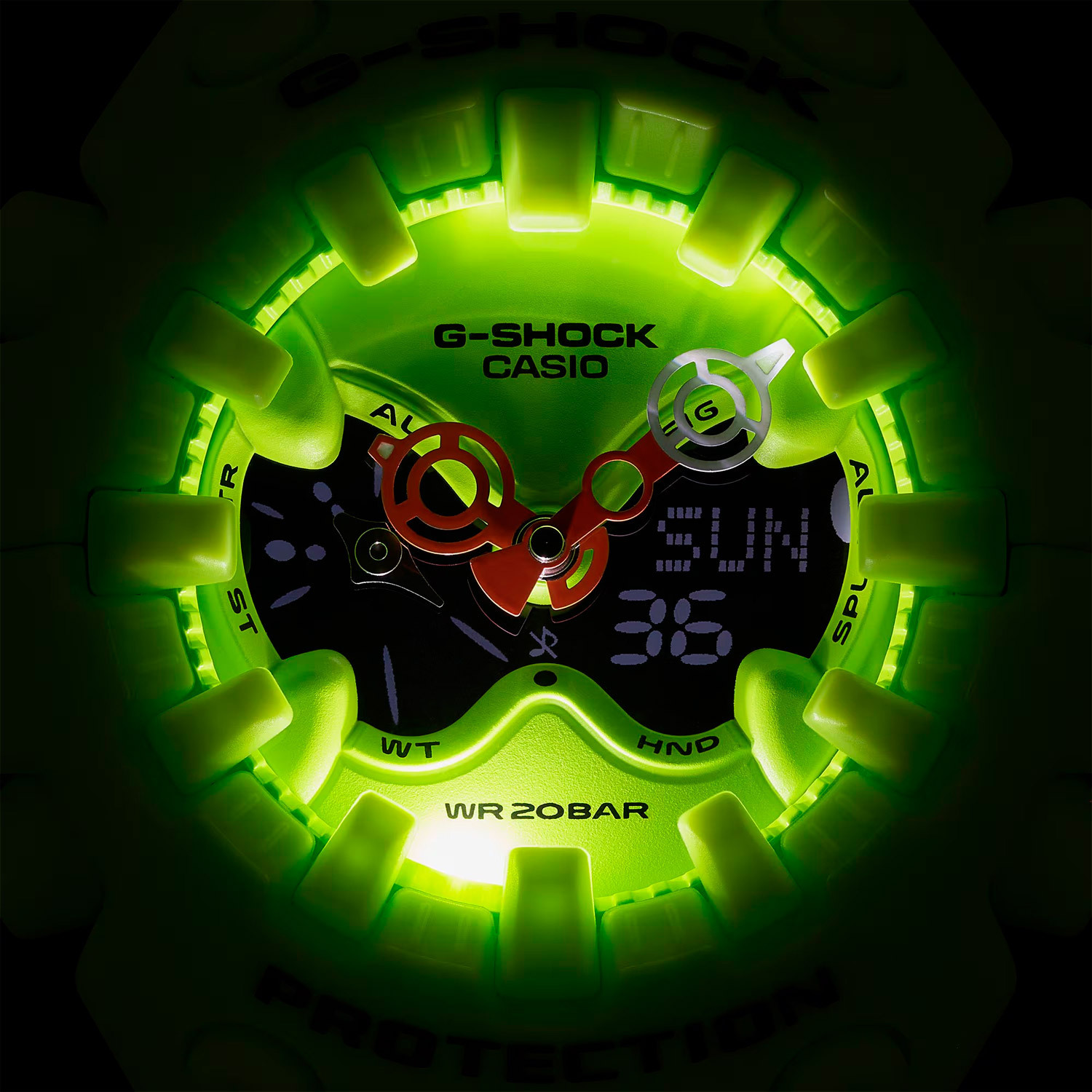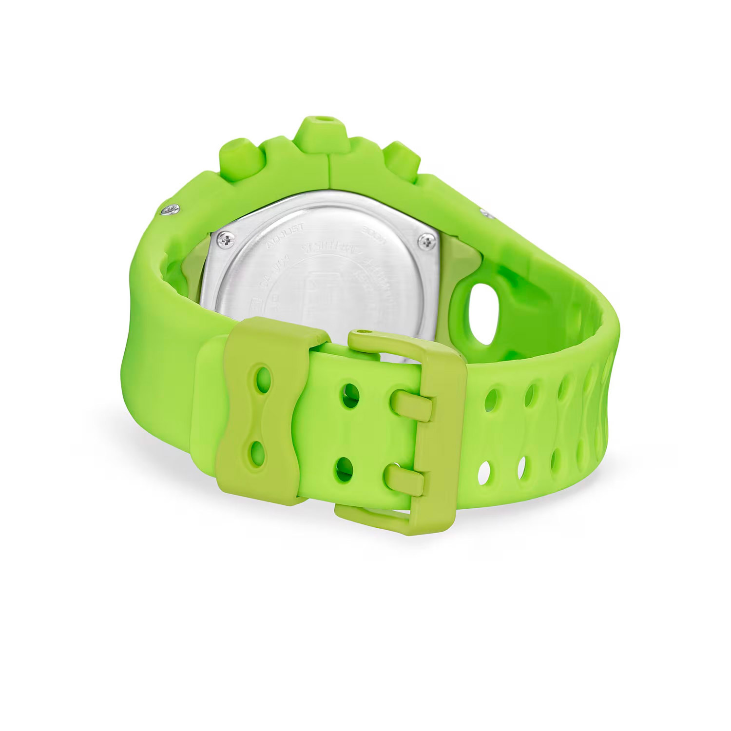 Кварцевые аналого-цифровые наручные часы. Серия G-Shock CoolEyes. Унисекс часы. Новинка отличается смелым дизайном: яркая расцветка, необычная форма 58-миллиметрового корпуса, дисплей-бабочка (CoolEyes), 3D-часовые метки расположенные снаружи корпуса и интегрированные в рант, устойчивое к ударам сферическое минеральное стекло. Противоударный пластиковый корпус защищает механизм часов от ударов и вибраций. Двойная светодиодная подсветка (циферблата и ЖК-дисплея) с функцией послесвечения, настройка продолжительности подсветки 1,5 или 3 с. Светящееся покрытие стрелок обеспечивает длительное послесвечение в темноте даже после короткого воздействия света. 12-ти и 24-х часовой формат отображения времени. Секундомер с точностью показаний 1/100 с и временем измерения 24 часа. Таймер обратного отсчета от 1 секунды до 24 часов с автоповтором. Мировое время - 31 часовой пояс (48 городов), всемирное координированное время (UTC), включение/отключение летнего времени. 5 ежедневных будильников (один с функцией повтора сигнала Snooze), ежечасный сигнал. Функция перемещения стрелок для удобного просмотра информации на цифровом экране. Функция отключения/включения звука кнопок. Автоматический календарь до 2099 года. Пластиковый корпус яркого жёлто-зелёного цвета. Размер корпуса 49,1 мм на 58,2мм, толщина 19,6мм. Устойчивое к мелким механическим повреждениям сферическое минеральное стекло. Жёлто-зелёный пластиковый ремешок со стандартной застёжкой buckle. Батарея рассчитана на 10 лет. Водонепроницаемость 200WR (плавание и ныряние без акваланга). Вес около 74 г.