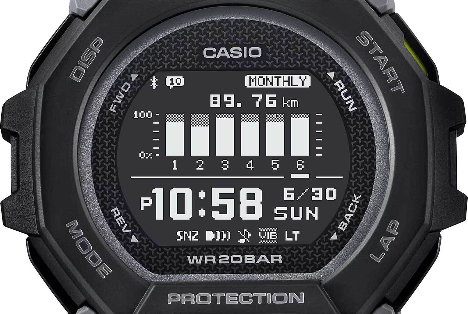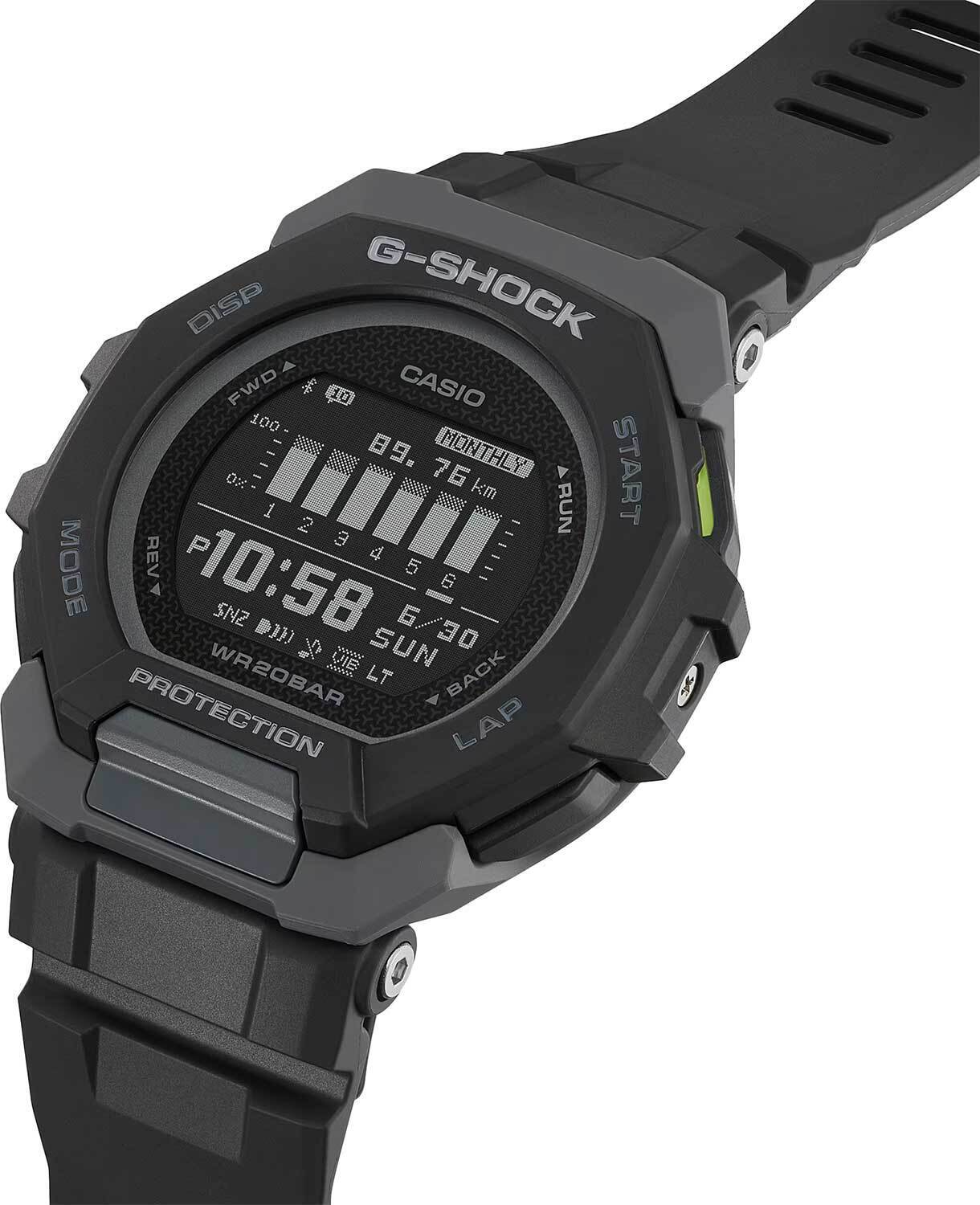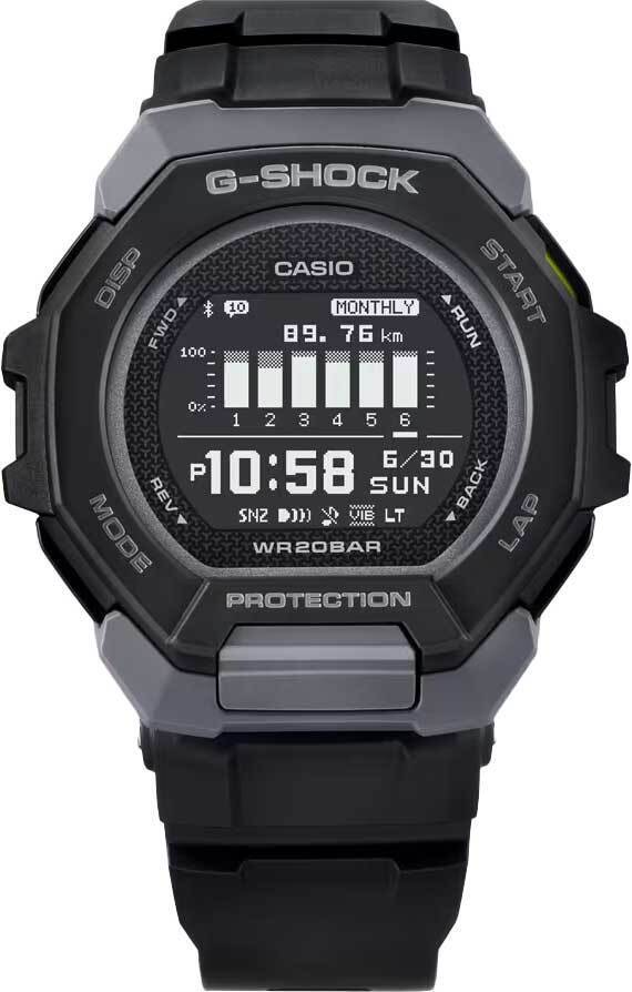 Кварцевые электронные наручные часы. Серия Casio G-Shock G-Squad. Унисекс. Противоударный корпус защищает механизм часов от ударов и вибрации. Светодиодная автоматическая подсветка (Super Illuminator)-при недостаточной освещенности поворот руки включит яркую подсветку часов. Настраиваемая продолжительность подсветки 1,5 или 3 секунды, послесвечение. Часы оснащены беспроводной технологией Bluetooth® со сверхнизким потреблением энергии для синхронизации со смартфоном. При подключении к смартфону через специальное приложение, часы корректируют текущее время, дату, мировое время и получают доступ к ряду полезных функций. 12-ти и 24-х часовой формат отображения времени. Секундомер с точностью показаний 1с и временем измерения 100 ч. Режимы измерения: прошедшее время, промежуточное время. Возможность установки 5 последовательных таймеров. Таймер обратного отсчета от 1с до 1ч с автоповтором. Количество повторений таймера устанавливается от 1 до 20. Мировое время: 38 городов (38 часовых поясов), всемирное координированное время (UTC). Автоматический переход на зимнее и летнее время, возможность включения/отключения данной функции. Данные журнала жизни- отображение данных о расстоянии, скорости, темпе, сожженных калориях (до 100 пробежек, до 140 кругов за одну пробежку). Шагомер - диапазон измерения и отображения от 0 до 99 999 шагов. Функции вибро-уведомления. Функция поиска телефона. Управление данными журнала тренировок (в памяти сохраняются результаты и подробная информация о тренировке). История активности. Акселерометр- отображение скорости. 4 ежедневных будильника с функцией повтора сигнала. Автоматический календарь до 2099 года. Функция энергосбережения - дисплей гаснет для экономии энергии на 3 часа каждый день. Восьмиугольный корпус из биопластика (изготавливается из возобновляемых органических ресурсов) чёрного цвета. Размер корпуса 47,4 мм на 48,9мм, толщина 14,9мм. Устойчивое к мелким механическим повреждениям минеральное стекло. Чёрный ремешок из биопластика с классической застёжкой buckle. Приблизительный срок службы батареи 2 года. Водонепроницаемость 200WR (плавание и погружение без акваланга). Вес около 60 г.