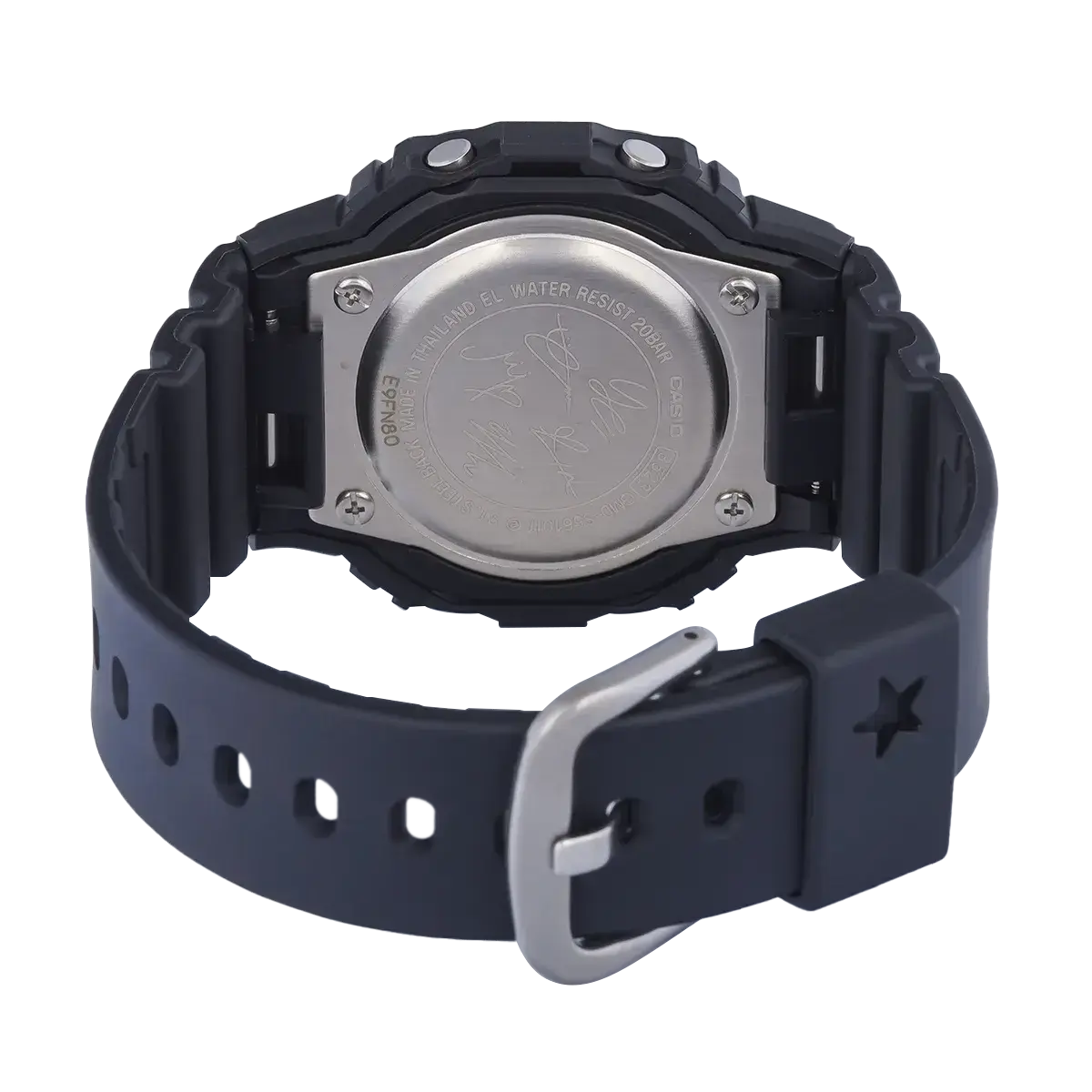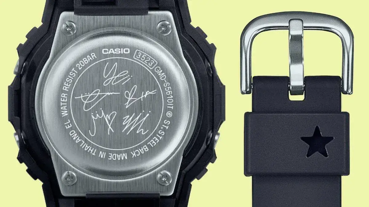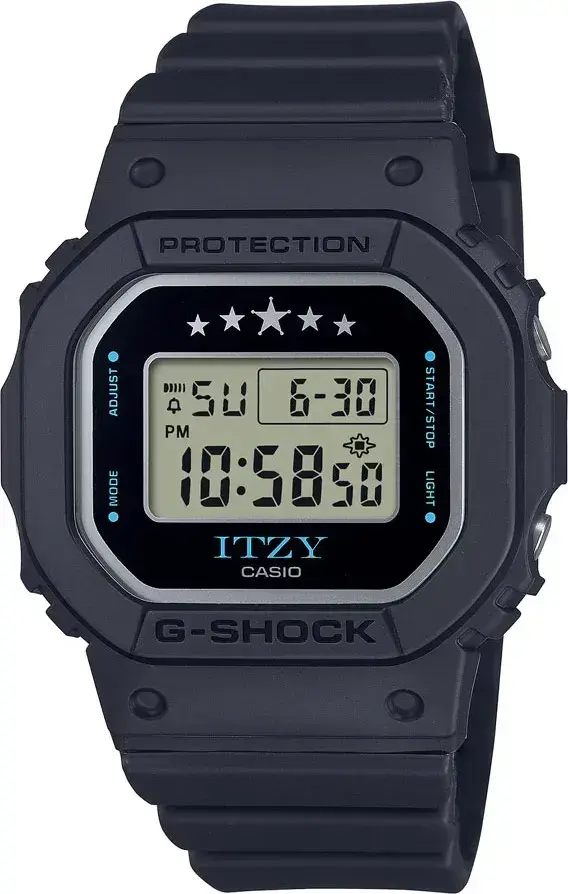 Электронные кварцевые наручные часы. Серия Casio G-Shock limited. Унисекс часы. Модель выпущена в сотрудничестве G-Shock и Itzy — популярной южнокорейской гёрл-группы жанра K-pop. Логотип группы Itzy украшает нижнюю часть циферблата часов, а на верхней нарисованы 5 звезд — по количеству участниц группы. Противоударный корпус защищает механизм часов от ударов и вибрации. Дисплей подсвечивается ярким светодиодом с функцией послесвечения. При включении подсветки на дисплее появляются 5 сердечек. Световая индикация сигнала (LED-индикатор) - светодиодная лампочка мигает при сигнале будильника, окончании таймера обратного отсчета или секундомера. 12-ти и 24-х часовой формат отображения времени. Секундомер с точностью показаний 1/100 секунды (первый час), 1 секунда (через 1 час) и временем измерения 24 часа. Режимы измерения: прошедшее время, промежуточное время, два финишных результата. Таймер обратного отсчета от 1 секунды до 24 часов с автоповтором. Многофункциональный будильник, ежечасный сигнал. Автоматический календарь до 2099 года. Прямоугольный корпус из биопластика (изготавливается из возобновляемых органических ресурсов) чёрного цвета. Размеры корпуса 40,5 мм на 45,7мм, толщина 11,9мм. Устойчивое к мелким механическим повреждениям минеральное стекло. Чёрный ремешок из биопластика (изготавливается из возобновляемых органических ресурсов) с классической застежкой Buckle. Батарейка рассчитана на 3 года. На стальной задней крышке часов выгравированы пять автографов участниц группы Itzy. Водонепроницаемость 200WR (плавание и ныряние без акваланга). Вес около 42 г. Часы поставляются в специальной упаковке, украшенной логотипами ITZY и G-SHOCK. На внешней коробке напечатаны автографы каждой из участниц группы .