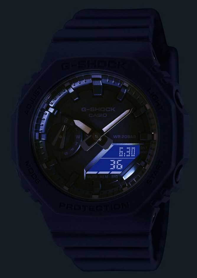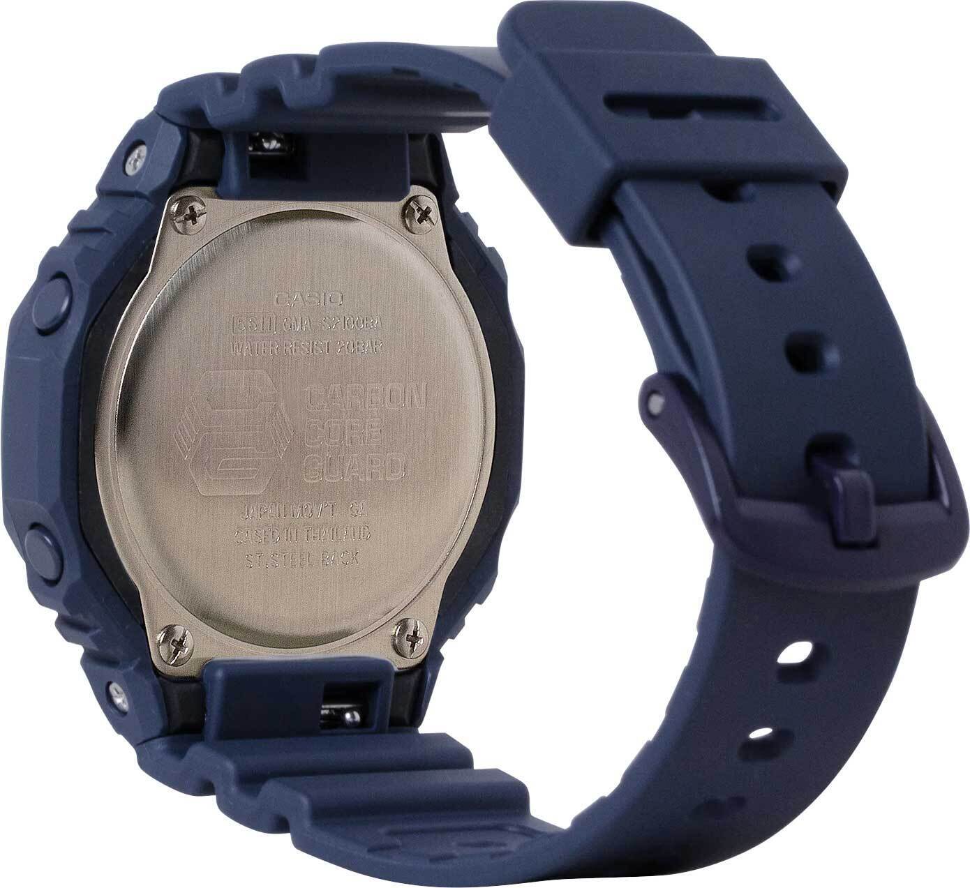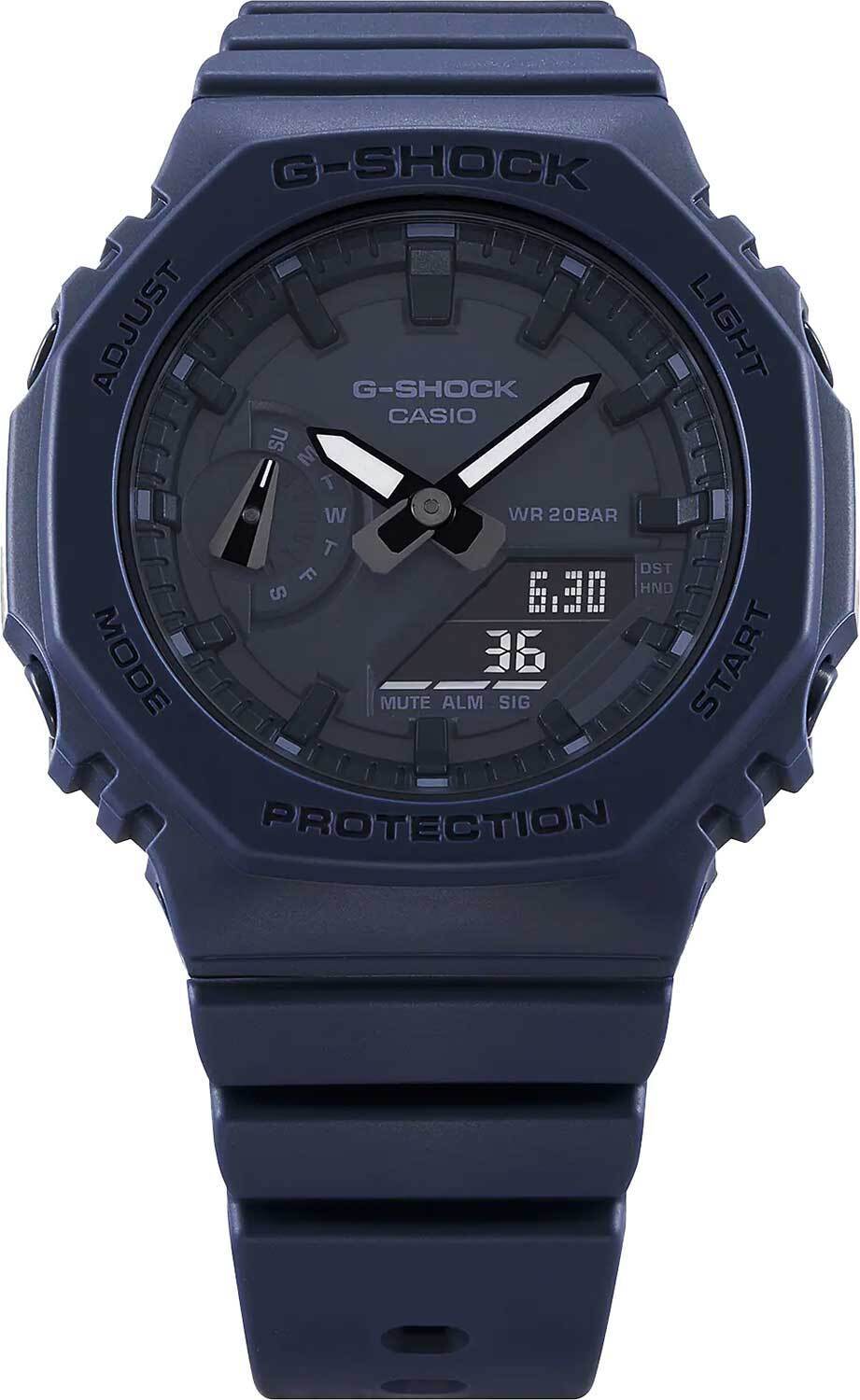 Кварцевые аналогово-цифровые наручные часы. Серия G-Shock Carbon Core Guard. Унисекс. Противоударный пластиковый корпус с углеродными волокнами (структура Carbon Core Guard) более прочный и в то же время более легкий, защищает механизм часов от ударов и вибраций. Двойная светодиодная подсветка обеспечивает подсветку не только цифрового дисплея, но и аналогового циферблата. Настройка продолжительности подсветки 1,5 или 3 секунды, послесвечение. Светящееся покрытие стрелок обеспечивает длительное послесвечение в темное время суток после короткого воздействия света. 12-ти и 24-х часовой формат отображения времени. Ретроградный стрелочный указатель дня недели находится в позиции 9 ч. Секундомер с точностью показаний 1/100 с (первый час) и 1 с (после первого часа) и временем измерения 24 часа. Режимы измерения: прошедшее время, промежуточное время, два финишных результата. Таймер обратного отсчета от 1 секунды до 24 часов (с интервалом в 1 секунду) с автоповтором. Мировое время - 31 часовой пояс (48 городов), всемирное координированное время (UTC), включение/отключение летнего времени. 5 ежедневных будильников, ежечасный сигнал. Функция перемещения стрелок для удобного просмотра информации на цифровом экране. Функция отключения/включения звука кнопок. Автоматический календарь до 2099 года. Усиленный углеродными волокнами пластиковый восьмиугольный корпус синего цвета. Размеры корпуса 42,9х46,2мм, толщина 11,2мм. Устойчивое к мелким механическим повреждениям минеральное стекло. Пластиковый синий ремешок со стандартной застёжкой Buckle. Примерный срок службы батареек 3 года. Водонепроницаемость 200WR (плавание и ныряние без акваланга). Вес около 41 г.