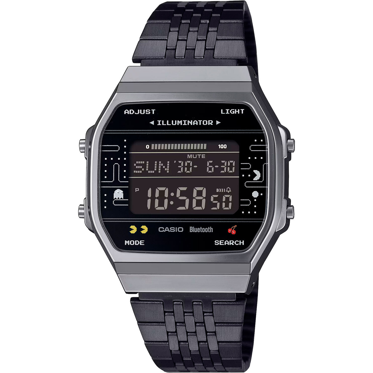 Электронные кварцевые наручные часы. Коллекция Casio Vintage x Pac Man. Унисекс часы. Модель создана в честь 50-летия компании Casio и 45-летия аркадной компьютерной игры Pac-Man, которую в 1980 году разработала и выпустила компания Bandai Namco Entertainment. Черный циферблат часов выполнен в монохромном стиле "игрового экрана", на котором изображены персонажи игры Pac- Man, словно застывшие в классической погоне по лабиринту. На застежке браслета и задней крышке часов выгравирован логотип Pac-Man. Циферблат подсвечивается светодиодом. Настраиваемое послесвечение 1,5 или 3с. Второй часовой пояс. Секундомер с точностью показаний 1/100с (до 1ч) и 1с (после 1ч) и временем измерения 24ч. Режимы измерения: прошедшее время, время круга, промежуточное время. Память на 200 этапов (дата, время, время круга). Таймер обратного отсчета от 1с до 1ч. 5 ежедневных будильников, ежечасный сигнал. 12/24-часовой формат отображения времени. Автоматический календарь до 2099 года. Шагомер измеряет количество шагов от 0 до 999999. Установка цели в диапазоне от 1000 до 50000 шагов. Звуковое напоминание об отсутствии активности и достижении цели. Отображение пройденных шагов за последние 7ч на 6-ти- уровневом графике. Часы оснащены беспроводной технологией Bluetooth® со сверхнизким потреблением энергии для синхронизации со смартфоном. При подключении к смартфону часы автоматически корректируют текущее время и получают доступ к ряду полезных функций. Функция отключения/включения звука кнопок. Функция поиска телефона. Функция энергосбережения и оповещения о низком заряде батареи. Батарея рассчитана на 2 года. Восьмиугольный корпус из полимерного пластика серебристого цвета. Размеры корпуса 37,9 мм на 41,6мм, толщина 8,2 мм. Пластиковое стекло. Стальной браслет с покрытием чёрного цвета, регулируемая застежка. Водостойкость WR 30 (брызги). Вес около 60 г. Часы поставляются в специальной упаковке с соответствующим монохромным дизайном игрового экрана.