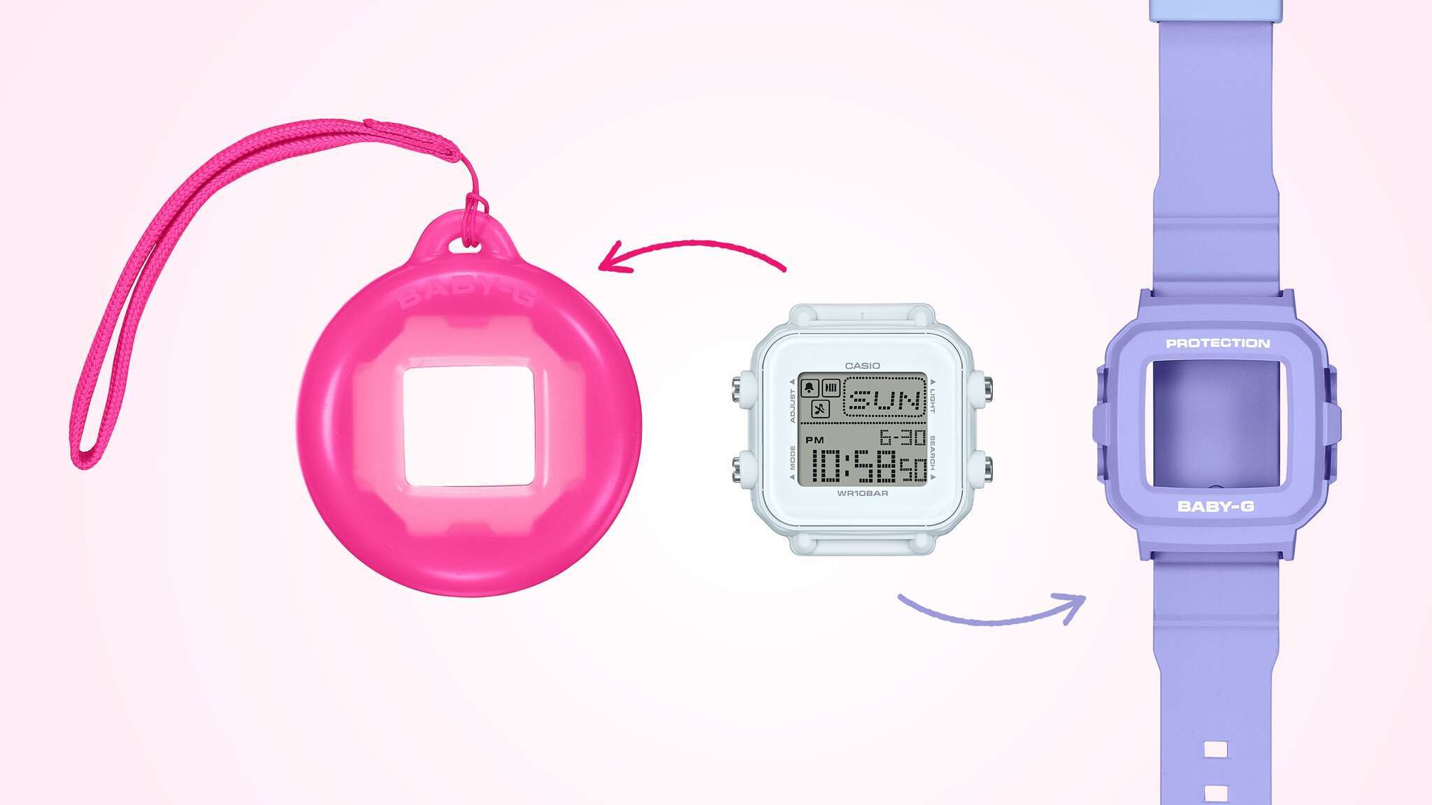 Женские кварцевые электронные часы. Коллекция Baby-G+. Этот комплект Baby-G+ можно носить двумя способами: как наручные часы или поместив центральный корпус в держатель, превратить часы в уникальный брелок, указывающий время, и носить в виде подвески на сумку или пояс. Противоударный корпус защищает механизм часов от ударов и вибрации. Светодиодная подсветка с функцией послесвечения. Продолжительность свечения 2 секунды. При нажатии кнопки подсветки в режиме текущего времени, на ЖК-дисплее в случайном порядке появляется серия пиксельных анимаций (серфер, танцор, дельфин, иглобрюхая рыба, собака, кошка). Секундомер с точностью показаний 1/100 с и временем измерения 24 часа. Режимы измерения: прошедшее время, промежуточное время, два финишных результата. Таймер обратного отсчета от 1 с до 24 часов с автоповтором. 12-ти и 24-х часовой формат отображения времени. 5 ежедневных будильников, почасовой сигнал времени. Мировое время: 29 часовых поясов (30 городов), включение/отключение летнего времени. Автоматический календарь до 2099 г. Включение/выключение звука кнопок. Прямоугольный корпус из полимерного пластика фиолетового цвета. Размер корпуса 39 мм на 42,8 мм , толщина 14,7 мм. Фиолетовый ремешок из полимерного пластика, стандартная застежка. Минеральное стекло устойчивое к мелким механическим повреждениям. В комплекте специальный держатель с ремешком. Водостойкость WR 100 (плавание и ныряние без акваланга). Вес примерно 33 г.