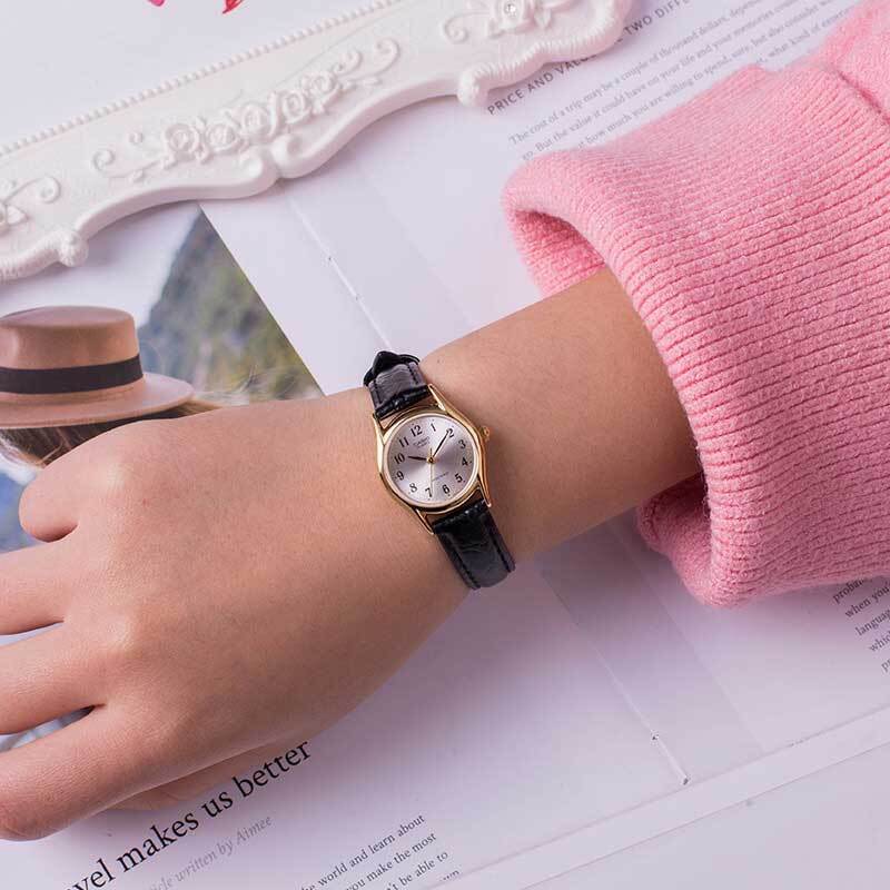 Женские кварцевые аналоговые наручные часы. Серия Casio Collection. Центральные часовая, минутная и секундная стрелки. Серебристый циферблат с часовыми метками в виде арабских цифр. Круглый корпус из нержавеющей стали с IP покрытием цвета жёлтого золота. Размеры корпуса 25 мм на 20 мм, толщина 9.2 мм. Рифлёная переводная. Устойчивое к мелким механическим повреждениям минеральное стекло. Чёрный кожаный ремешок с классической застёжкой buckle. Батарейка рассчитана на 3 года. Водонепроницаемость 30WR (защита от брызг). Вес около 24 г.