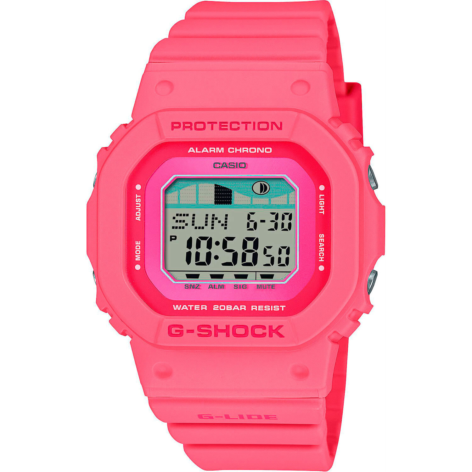 Женские кварцевые часы с цифровым отображением времени. Серия G-Shock G-Lide. Противоударный корпус защищает механизм часов от ударов и вибрации. Светодиодная автоматическая подсветка с функцией послесвечения. При недостаточном освещении поворот руки обеспечит автоматическое включение подсветки дисплея. Световая индикация сигнала (LED-индикатор) - светодиодная лампочка мигает при сигнале будильника, окончании таймера обратного отсчета, секундомера. Отображение возраста и фазы Луны. Графическое отображение сведений о приливах и отливах на заданную дату и время. Мировое время: 29 часовых зон (48 городов), включение/выключение летнего времени. Секундомер с точностью показаний 1/100 секунды и временем измерения 24 часа. Режимы измерения: прошедшее время, промежуточное время, два финишных результата. Таймер обратного отсчета от 1 минуты до 24 часов с автоповтором. Будильник с тремя многофункциональными звуковыми сигналами (один с функцией повтора сигнала Snooze). 12/24-х часовой формат отображения времени. Автоматический календарь до 2099 года. Включение/выключение звука кнопок. Прямоугольный корпус из биопластика (изготавливается из возобновляемых органических ресурсов) розового цвета. Размер корпуса 45,7мм на 40,5 мм, толщина 11,9 мм. Устойчивое к мелким механическим повреждениям минеральное стекло. Розовый ремешок из биопластика (изготавливается из возобновляемых органических ресурсов), стандартная застежка buckle. Батарейка рассчитана на 3 года. Водонепроницаемость WR200 (плавание и погружение без акваланга). Вес около 41 г.