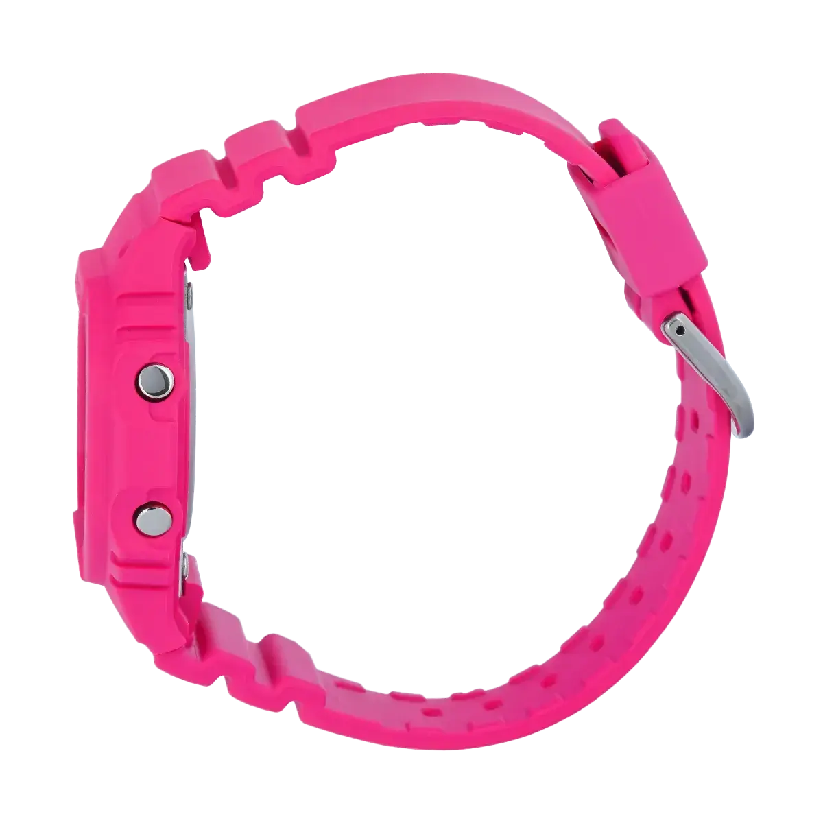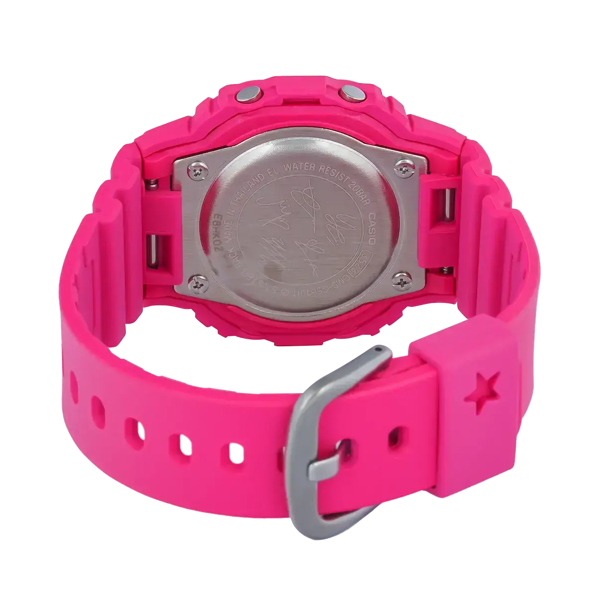 Женские электронные кварцевые наручные часы. Серия Casio G-Shock limited. Модель выпущена в сотрудничестве G-Shock и Itzy — популярной южнокорейской гёрл-группы жанра K-pop. Логотип группы Itzy украшает нижнюю часть циферблата часов, а на верхней нарисованы 5 звезд — по количеству участниц группы. Противоударный корпус защищает механизм часов от ударов и вибрации. Дисплей подсвечивается ярким светодиодом с функцией послесвечения. При включении подсветки на дисплее появляются 5 сердечек. Световая индикация сигнала (LED-индикатор) - светодиодная лампочка мигает при сигнале будильника, окончании таймера обратного отсчета или секундомера. 12-ти и 24-х часовой формат отображения времени. Секундомер с точностью показаний 1/100 секунды (первый час), 1 секунда (через 1 час) и временем измерения 24 часа. Режимы измерения: прошедшее время, промежуточное время, два финишных результата. Таймер обратного отсчета от 1 секунды до 24 часов с автоповтором. Многофункциональный будильник, ежечасный сигнал. Автоматический календарь до 2099 года. Прямоугольный корпус из биопластика (изготавливается из возобновляемых органических ресурсов) розового цвета. Размеры корпуса 40,5 мм на 45,7мм, толщина 11,9мм. Устойчивое к мелким механическим повреждениям минеральное стекло. Розовый ремешок из биопластика (изготавливается из возобновляемых органических ресурсов) с классической застежкой Buckle. Батарейка рассчитана на 3 года. На стальной задней крышке часов выгравированы пять автографов участниц группы Itzy. Водонепроницаемость 200WR (плавание и ныряние без акваланга). Вес около 42 г. Часы поставляются в специальной упаковке, украшенной логотипами ITZY и G-SHOCK. На внешней коробке напечатаны автографы каждой из участниц группы .