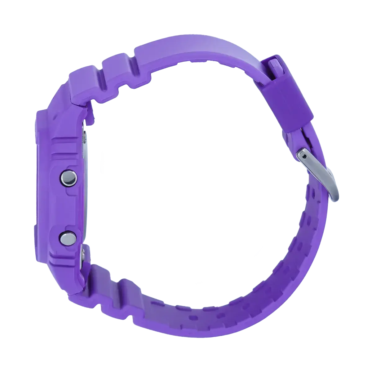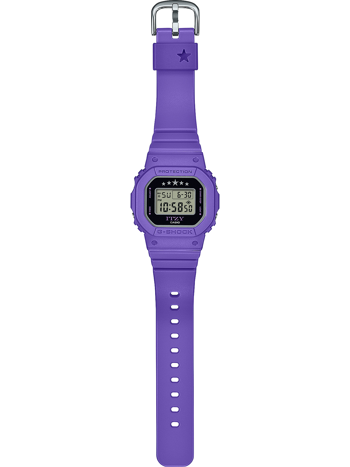 Женские электронные кварцевые наручные часы. Серия Casio G-Shock limited. Модель выпущена в сотрудничестве G-Shock и Itzy — популярной южнокорейской гёрл-группы жанра K-pop. Логотип группы Itzy украшает нижнюю часть циферблата часов, а на верхней нарисованы 5 звезд — по количеству участниц группы. Противоударный корпус защищает механизм часов от ударов и вибрации. Дисплей подсвечивается ярким светодиодом с функцией послесвечения. При включении подсветки на дисплее появляются 5 сердечек. Световая индикация сигнала (LED-индикатор) - светодиодная лампочка мигает при сигнале будильника, окончании таймера обратного отсчета или секундомера. 12-ти и 24-х часовой формат отображения времени. Секундомер с точностью показаний 1/100 секунды (первый час), 1 секунда (через 1 час) и временем измерения 24 часа. Режимы измерения: прошедшее время, промежуточное время, два финишных результата. Таймер обратного отсчета от 1 секунды до 24 часов с автоповтором. Многофункциональный будильник, ежечасный сигнал. Автоматический календарь до 2099 года. Прямоугольный корпус из биопластика (изготавливается из возобновляемых органических ресурсов)фиолетового цвета. Размеры корпуса 40,5 мм на 45,7мм, толщина 11,9мм. Устойчивое к мелким механическим повреждениям минеральное стекло. Фиолетовый ремешок из биопластика (изготавливается из возобновляемых органических ресурсов) с классической застежкой Buckle. Батарейка рассчитана на 3 года. На стальной задней крышке часов выгравированы пять автографов участниц группы Itzy. Водонепроницаемость 200WR (плавание и ныряние без акваланга). Вес около 42 г. Часы поставляются в специальной упаковке, украшенной логотипами ITZY и G-SHOCK. На внешней коробке напечатаны автографы каждой из участниц группы .