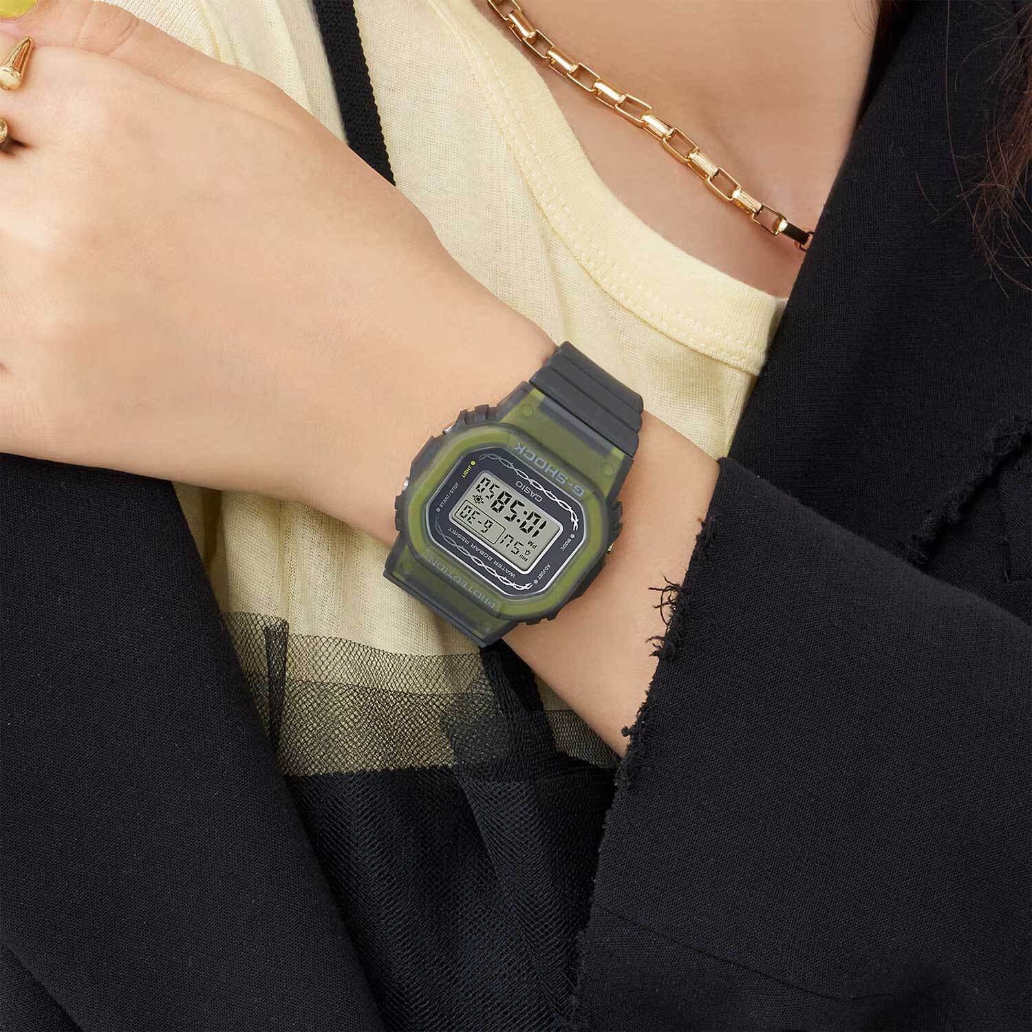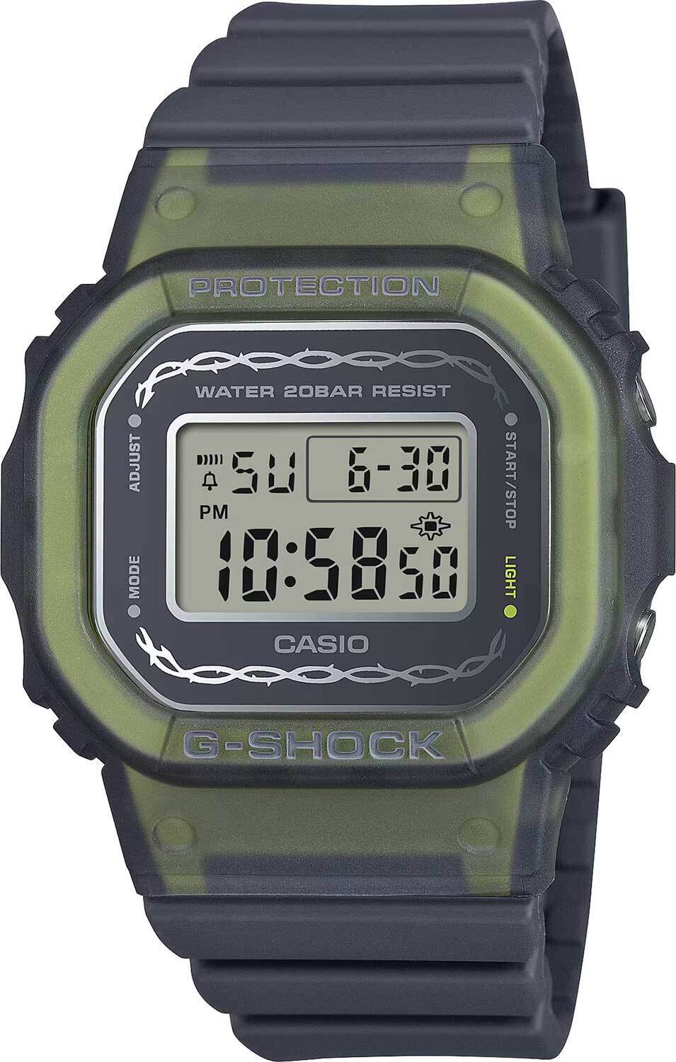 Женские электронные кварцевые наручные часы. Серия G-Shock S-series. Дизайн модели вдохновлён зимней розой: из-под полупрозрачного темного корпуса пробивается зеленый оттенок, словно стебель цветка. Противоударный корпус защищает механизм часов от ударов и вибрации. Дисплей подсвечивается ярким светодиодом с функцией послесвечения. При активации подсветки появляется силуэт цветка розы жёлтого цвета. На языке роз желтый цвет означает дружбу и мир. Световая индикация сигнала (LED-индикатор) - светодиодная лампочка мигает при сигнале будильника, окончании таймера обратного отсчета или секундомера. 12-ти и 24-х часовой формат отображения времени. Секундомер с точностью показаний 1/100 секунды (первый час), 1 секунда (через 1 час) и временем измерения 24 часа. Режимы измерения: прошедшее время, промежуточное время, два финишных результата. Таймер обратного отсчета от 1 секунды до 24 часов с автоповтором. Многофункциональный будильник, ежечасный сигнал. Автоматический календарь до 2099 года. Прямоугольный корпус из полимерного пластика серого цвета с зелёным безелем. Размеры корпуса 40,5 мм на 45,7мм, толщина 11,9мм. Устойчивое к мелким механическим повреждениям минеральное стекло. Вокруг дисплея рисунок в виде сплетения стеблей роз, в которых японцы видят сущность дружеских и романтических отношений. Серый пластиковый ремешок с классической застежкой Buckle. Батарейка рассчитана на 3 года. Стальная задняя крышка с гравировкой в виде сплетения стеблей роз (как на циферблате). Водонепроницаемость 200WR (плавание и ныряние без акваланга). Вес около 42 г.