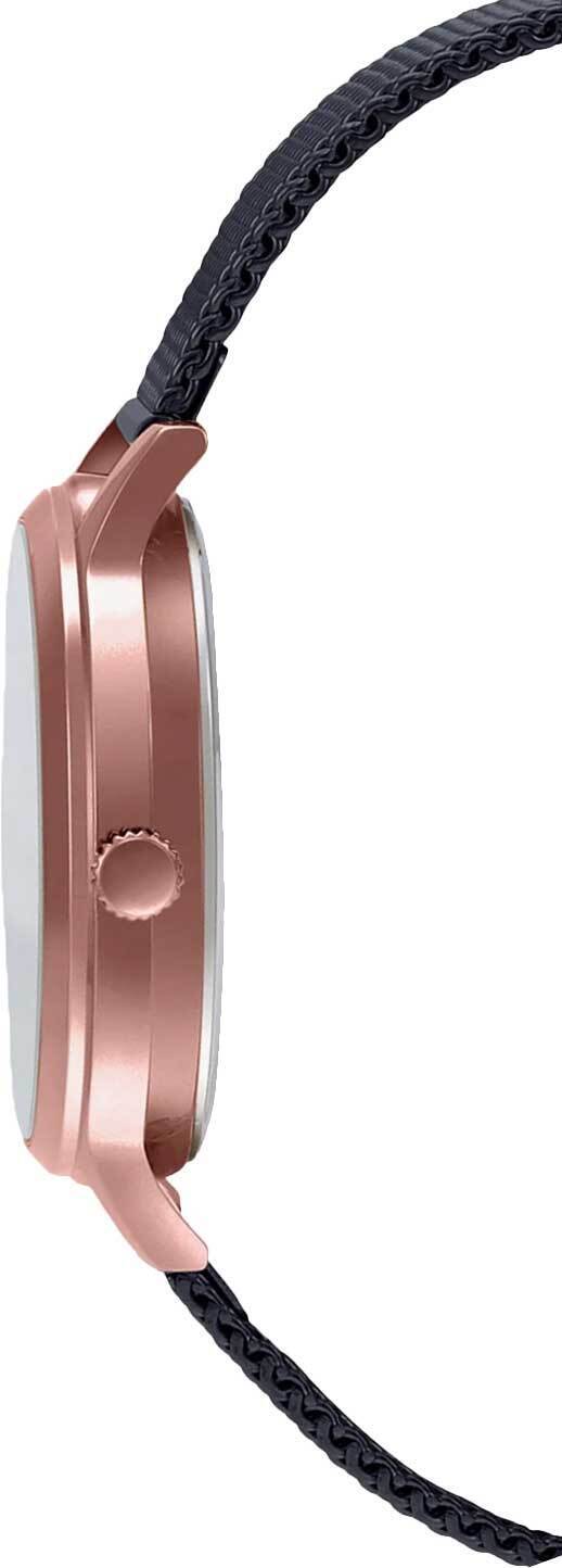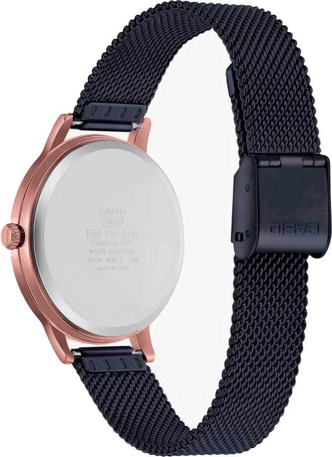 Женские кварцевые аналоговые наручные часы. Casio Collection. Центральные часовая, минутная и секундная стрелки золотистого цвета. Чёрный циферблат с часовыми метками в виде штрихов и двух римских цифр VI и XII золотистого цвета. Устойчивое к мелким механическим повреждениям минеральное стекло. Круглый стальной корпус с IP-покрытием цвета розового золота. Размер корпуса 37,5 мм на 32 мм, толщина 8 мм. Стальной браслет миланского плетения с IP-покрытием чёрного цвета, регулируемая застежка. Батарейка рассчитана на 3 года. Водонепроницаемость 30WR (защита от брызг). Вес около 47 г.
