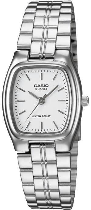 Женские кварцевые аналоговые наручные часы. Серия Casio Collection. Центральные часовая, минутная и секундная стрелки. Белый циферблат с часовыми метками в виде штрихов. Устойчивое к мелким механическим повреждениям минеральное стекло. Прямоугольный стальной корпус размером 28 мм на 22 мм, толщиной 6,9 мм. Стальной браслет с раскладывающейся застежкой. Водозащита 30WR (брызги). Вес около 43 г.